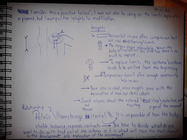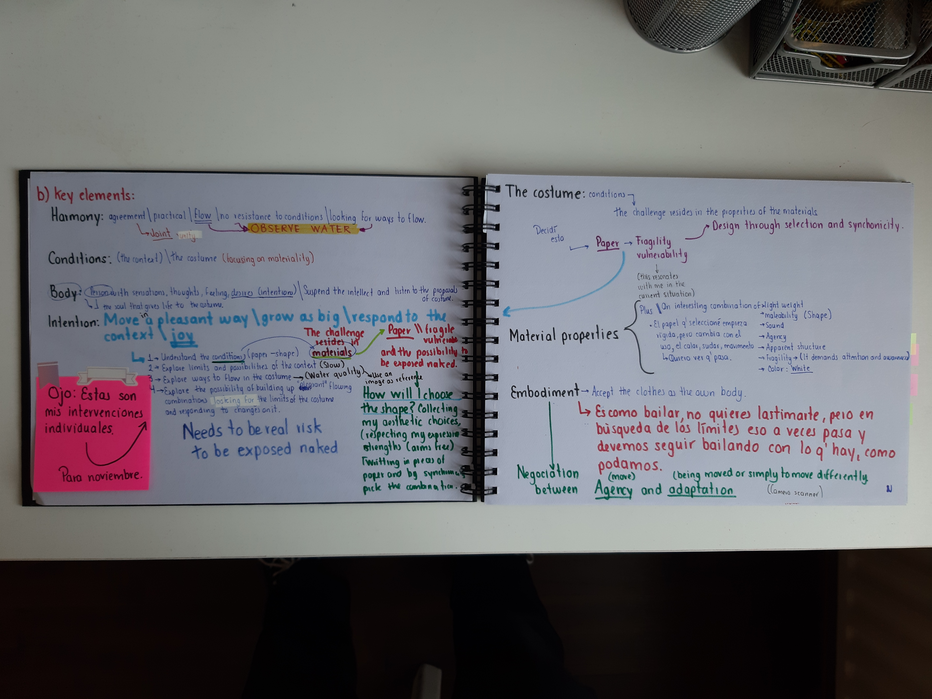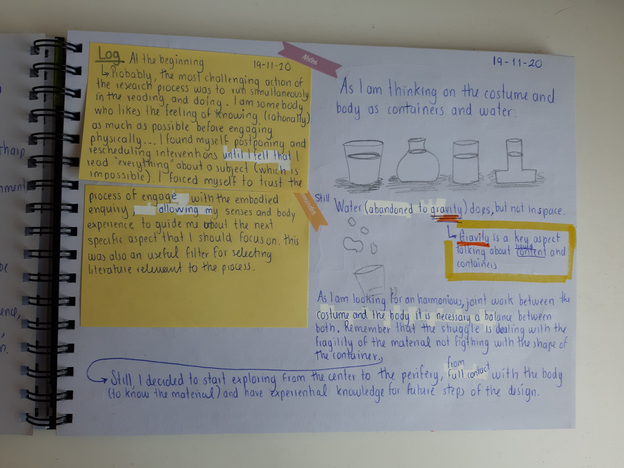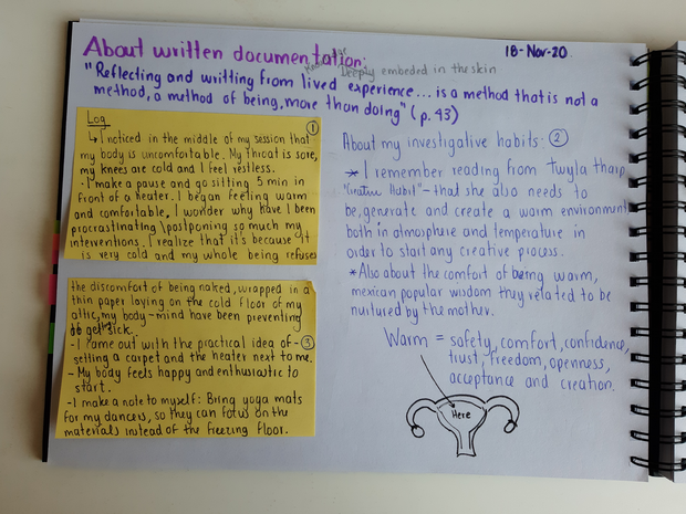 The improvisation/ exploration sessions were recorded in the video for posterior self-analysis and to share with my peers and mentor in the feedback loops, reflections were captured in my journal. In my hybrid journal, I developed a practical way to organize information for future analysis and writing. In purple there are quotes and citations, in yellow post-its there are self-reflections, in black or blue I keep ideas, notes about my process, and possible next steps as well as sketches.