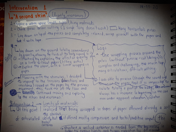 As I am working with the dancer's body experience, I applied the phenomenological methodology proposed by S. Gallagher and D. Zahavi (2009), it offers a pragmatic way to document and analyze what happens in the experiment process, approaching the first-person experience trying to capture how one is “thinking, perceiving, acting and feeling… by the careful description, analysis and interpretation of lived experience” (p 21), this is by literally talking about the dancer’s experience as detailed as possible after each intervention and keeping my journal next to me when the intervention was performed by myself.