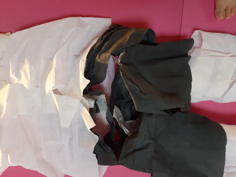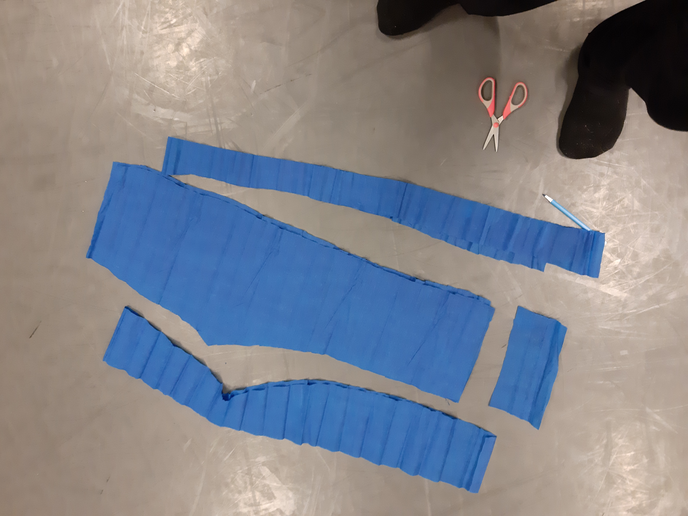We decided to try 2 initial versions of pants made of crépe paper, one tube line (shaped according to the dancer's size) and a wide loose pants with a leg short and the other long. I expected that being in contact with the material (touching) during the design and making process would help to have an informed idea about the boundaries of the costume prior to starting the intervention.