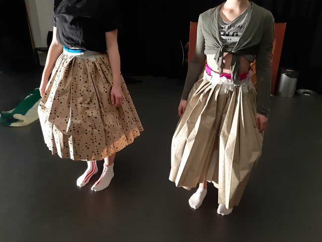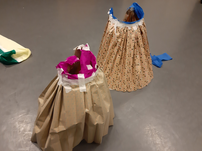 Exploring without immediate spatial conditions, rigid fragile material and movement originated in the pelvic area. Working with paper skirts.