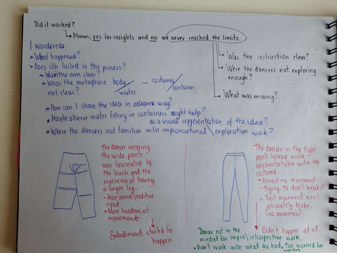 - Note to self: consider the visual aspect. Dancers expressed more tactile stimulus while wearing pants, for them the kinesthetic experience was more significant. However, I as a choreographer give more value to the visual experience of the audience/viewer rather than to the introspective experience of the dancers.
