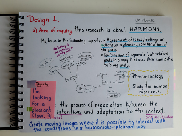 Once that Design 1 was updated and the planning was done at the end of October 2020, I started the process from a rational state with a literature review about the origins of the concept and selected those keywords that were more adequate to my artistic interest. (Click here if you wish to know more about the literature review, etymological evolution of the concept harmony and reflection on how I apply it to my work)
