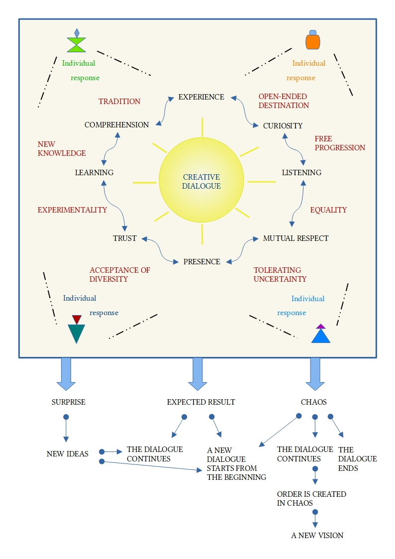 Creative dialogue requires participants to have a common understanding of the key principles and practices that support the development of improvisation in the interaction between participants. The personal reaction of each individual becomes a part of the whole, modifying it in its way. The goal is not a pre-agreed outcome, but the improvisation is allowed to proceed freely, and participants should be given an equal opportunity to act. Effective improvisation requires that participants be able to listen and react, that is, to concentrate, to be genuinely present, and to strive to understand different ways of performing. Communication is based on trust and mutual respect between group members, which in turn encourages participants to experiment in a playful manner and diminishes the fear of failure.