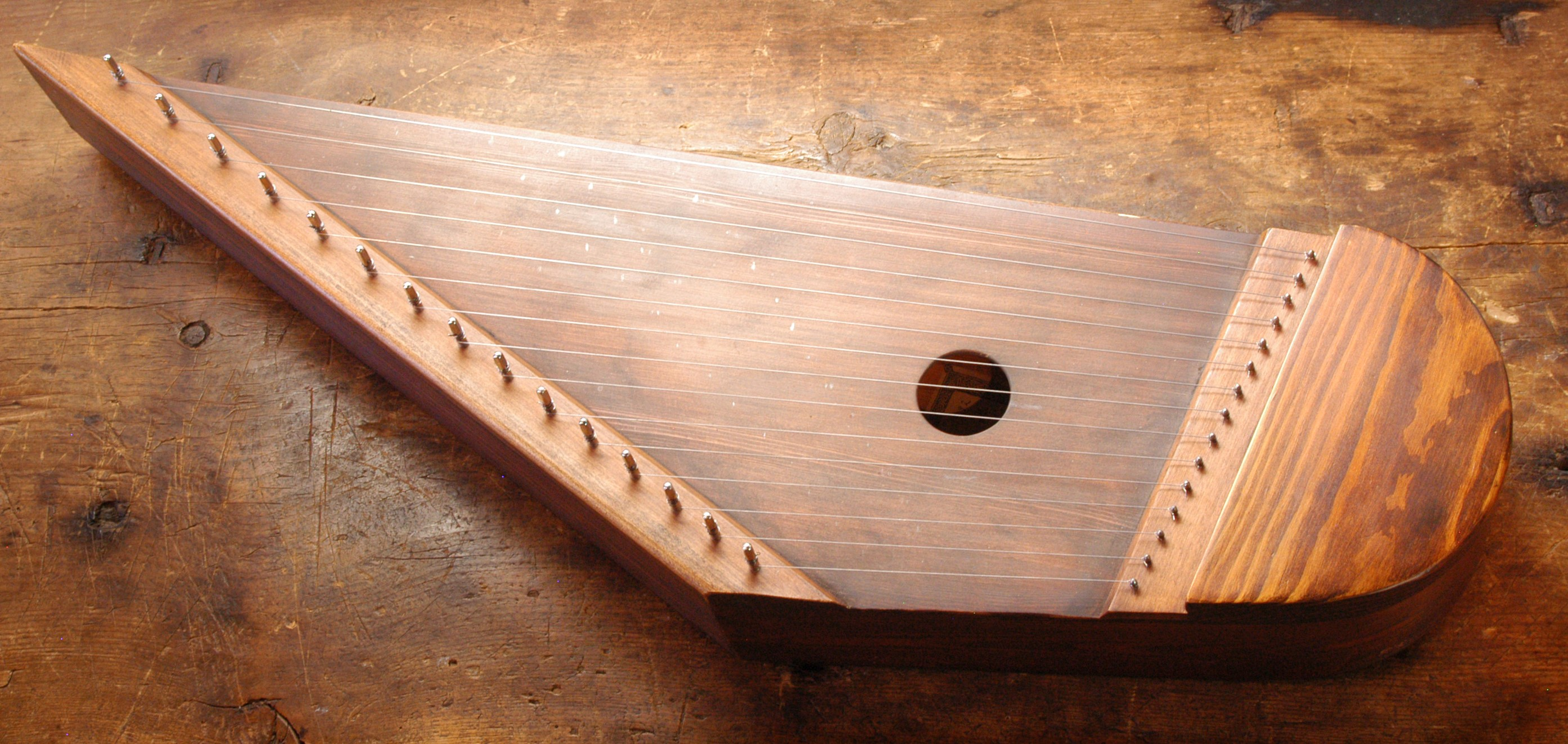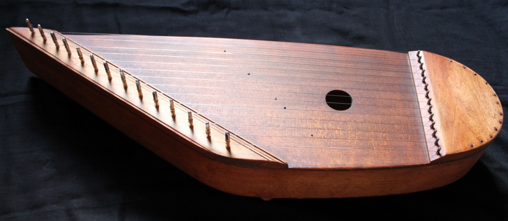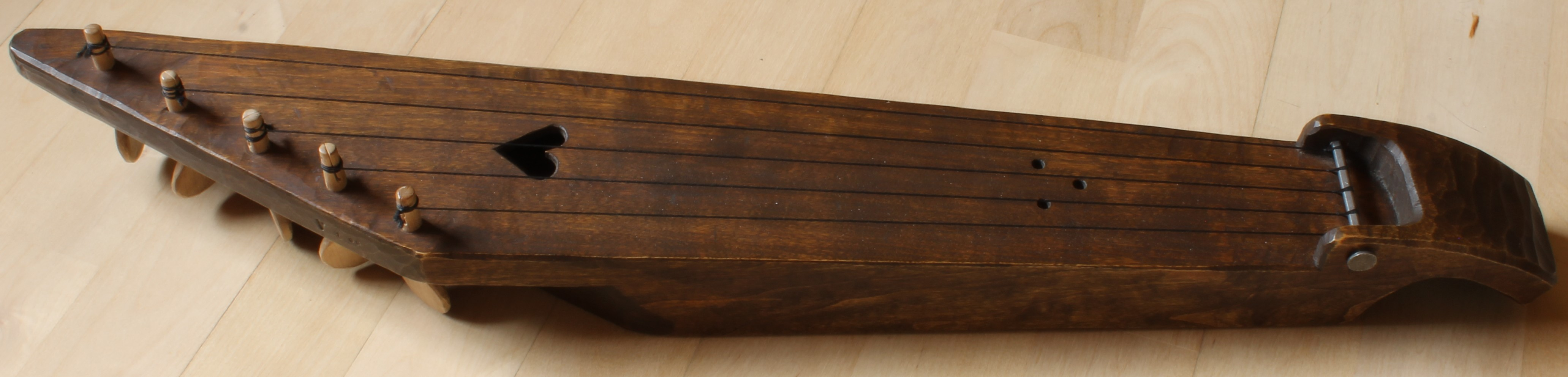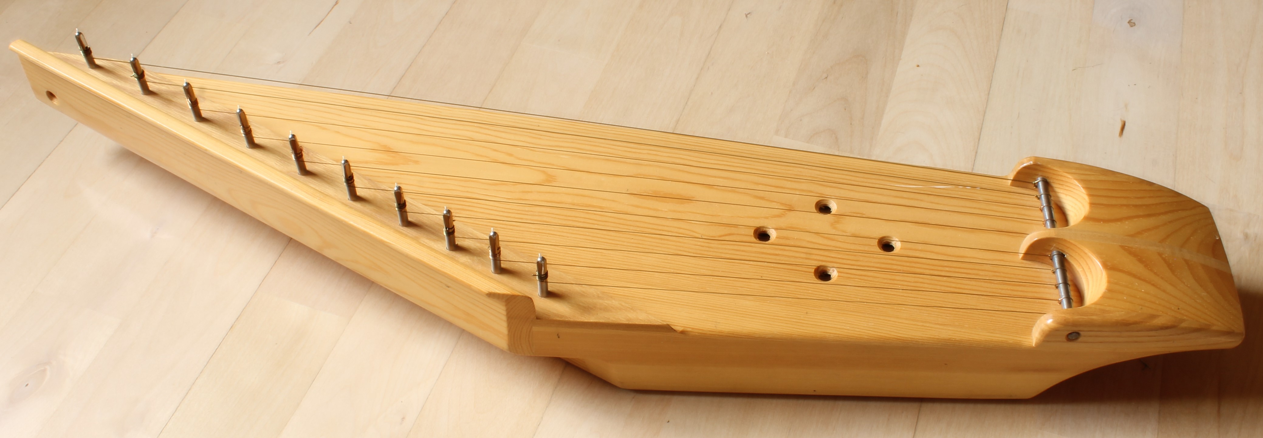 Image 21. An 11-string Latvian hollow kokle with wooden tuning pegs and steel strings. Kurzeme model, made by Viktors Černoglazovs. Hollowed out from the top. Tuned in D Mixolydian. G3–A3–C4–D4–E4–F#4–G4–A4–B4–C5–D5.