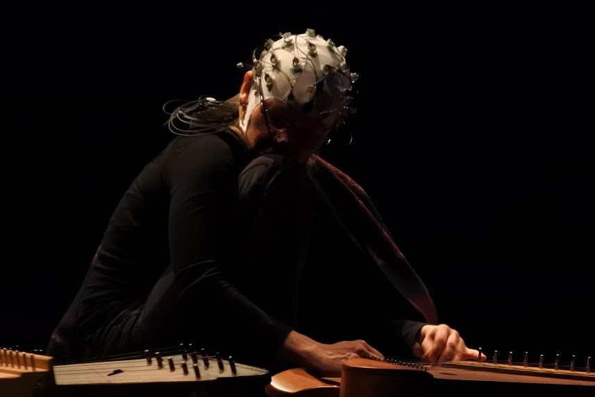 On 6 February 2017, I improvised for six hours without a break on eight different kanteles (for 5 hours and 47 minutes on seven Finnish kanteles and one Latvian kokle, to be specific) in the Black Box hall of the Musiikkitalo, Helsinki Music Centre. There were EEG caps on me and three listeners, and the data was recorded for about two hours from the beginning of the event (a somewhat shorter period for the listeners than for me). The performance was recorded and videotaped in its entirety, and the three listeners were videotaped during their EEG measurement. The event was organized by the Sibelius Academy Folk Music Department of the University of Arts, Helsinki, and was co-funded by the Jenny and Antti Wihuri Foundation. Students of psychology and cognitive science from the University of Helsinki worked on the EEG measurements under the supervision of Research Director Mari Tervaniemi, PhD (Psychology) from the Cognitive Brain Research Unit. Some equipment came from the Arts Equal project at the University of Arts, Helsinki, and some from the Cicero Learning network at the University of Helsinki. The technical expertise was in the hands of laboratory engineer Tommi Makkonen from the Cognitive Brain Research Unit, the University of Helsinki. My deepest gratitude to all who contributed to the event (Image 1).