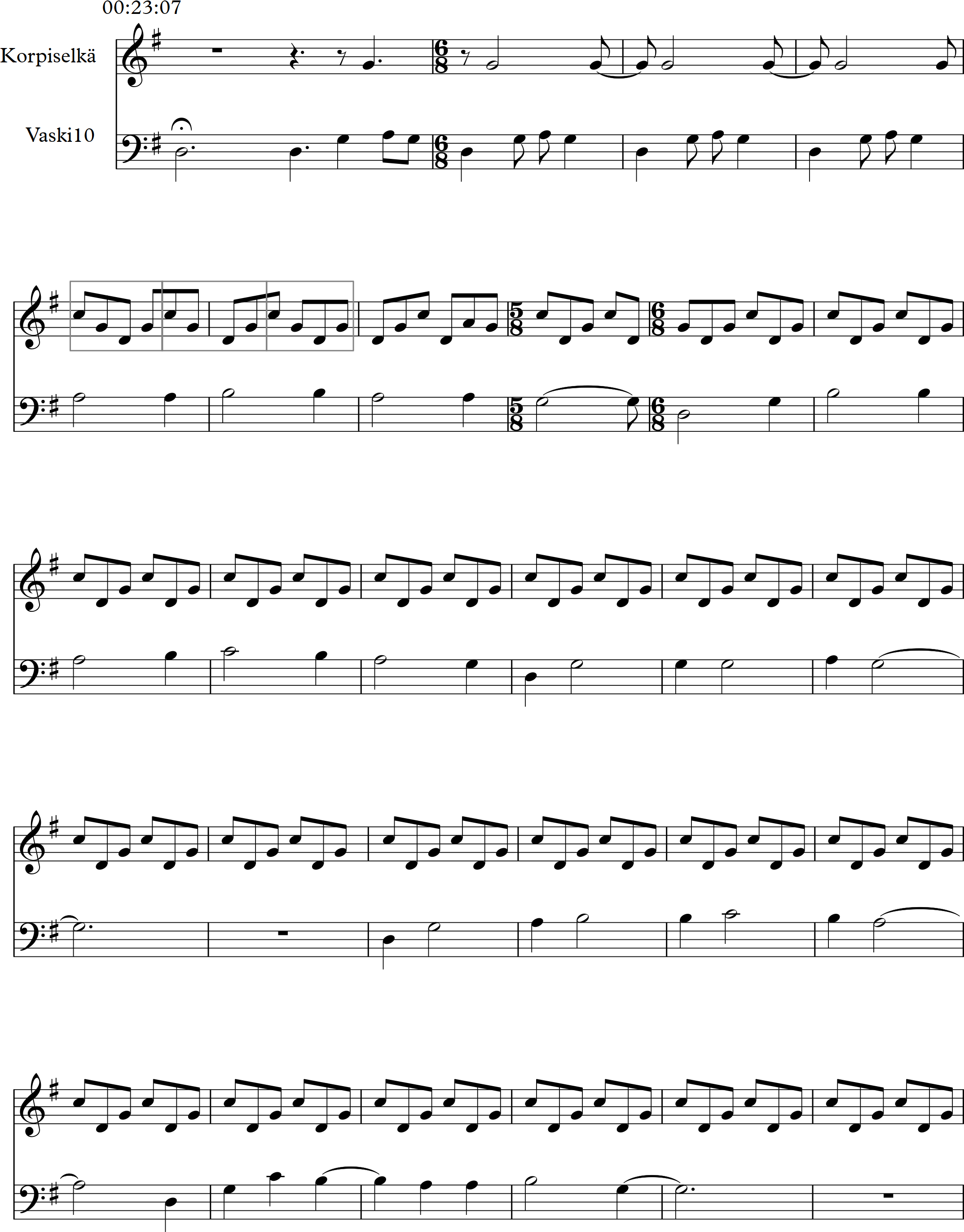 I made a short transcription of the beginning of the Vaski10 & Korpiselkä combination, starting at 00:23:07 on the video, since it shows some details about processing the rhythm (Image 23). At first, it is not obvious that the pulse is going to be in triple meter. The first tone is barely audible. The right hand is playing the Korpiselkä kantele and is using only one tone in the beginning. Then it starts to make an accompaniment pattern in duple meter; at first in 2/4 although the melody, played by the left hand on the Vaski10, goes in 3/4; then one bar in 5/8 (defined by the melody line on the left hand) and finally the accompaniment becomes established as a repetitive pattern in 6/8. The tempo becomes gradually faster. In my thinking, the left hand on the melody line doesn’t slavishly follow the right hand’s accompaniment patterns; only the beats of the pulse are relevant. The hands are independent and partly communicating. As the music develops further, the rhythmic variations and some melodic communication between the instruments come along.