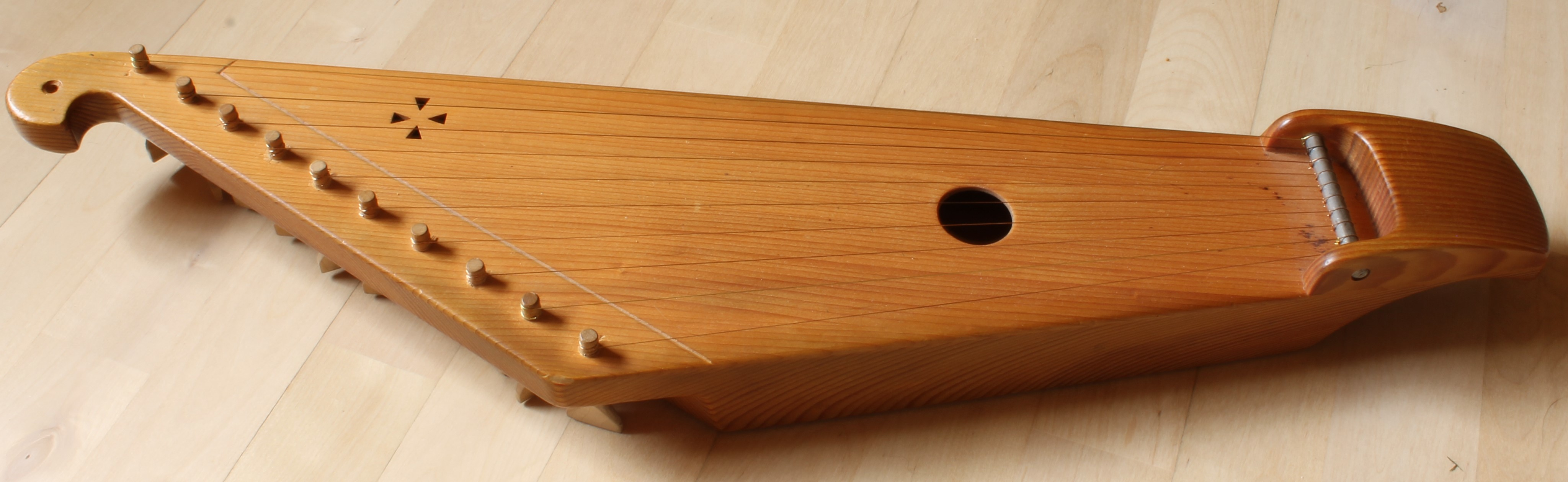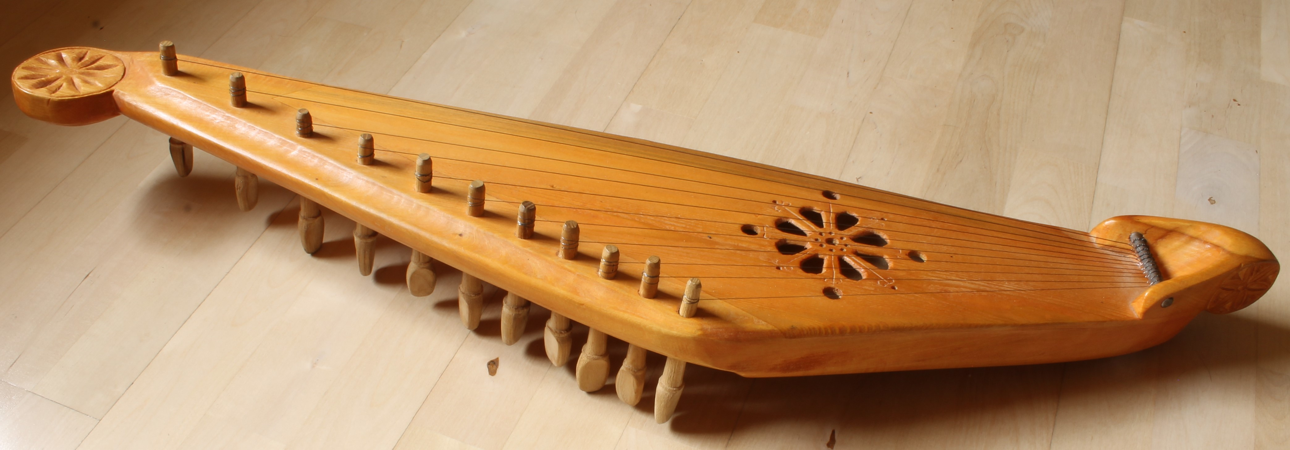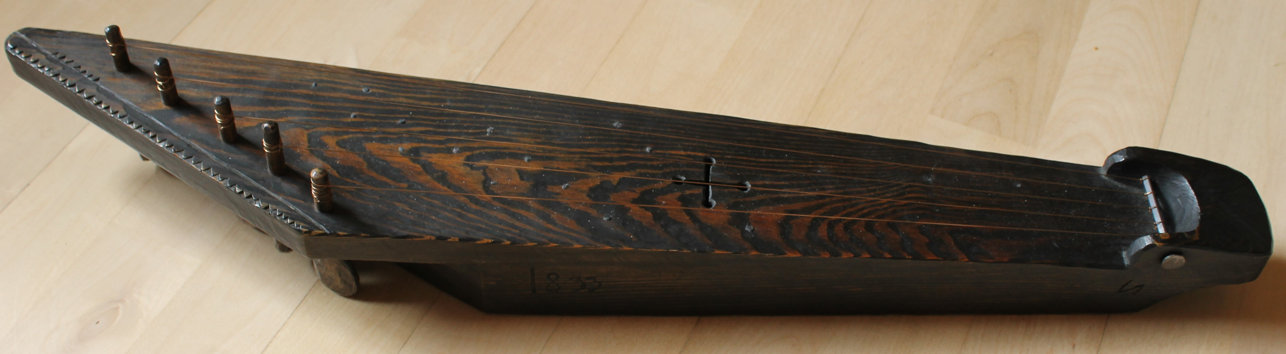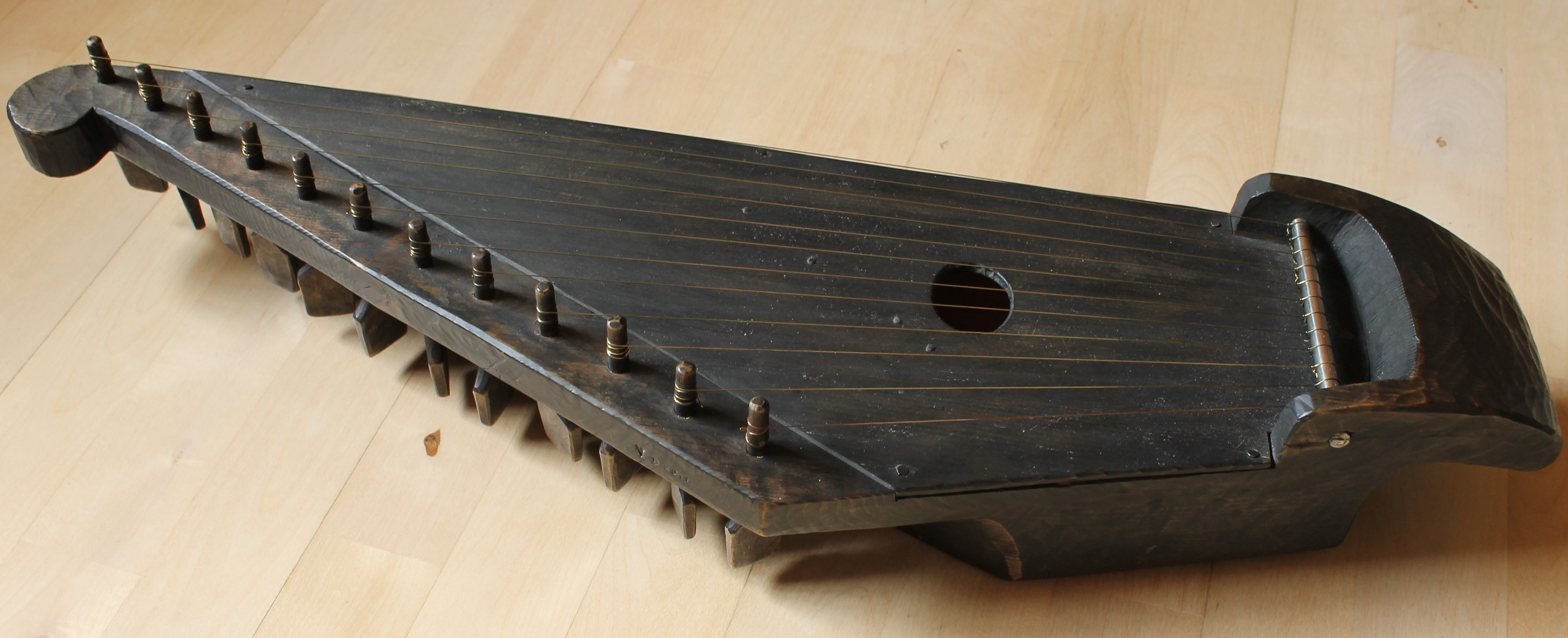 Image 17. A 12-string hollow kantele with wooden tuning pegs and brass strings. A replica of a kantele which was bought in 1906 for the museum in Perniö, Finland, from the famous runosinger and kantele player Iivana Shemeikka. The model represents the southern type of Finnish hollow kanteles; hollowed out from the top. The replica is made by Rauno Nieminen. Tuned in Ab major on the lower register, accidental Gb4 giving the minor pentachord on the higher register. Eb3–F3–G3–Ab3–Bb3–C4–Db4–Eb4–F4–G4–Ab4–Bb4.