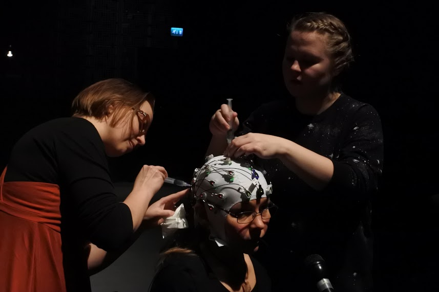 In her welcome, Mari Tervaniemi noted that even though the available equipment for making measurements is excellent, the tools for analysing the data containing the previously mentioned distractions are still under development. Thus, the aim of the project from the brain researchers’ perspective was to develop and examine the process of the research, with the focus on how brain mechanisms which regulate data processing, creativity and attentiveness or alertness, will work in a live music situation and in what way they will alternate with the listeners and the musician. In 2015, the Brain and Music group at the University of Helsinki performed a somewhat similar EEG measurement on professional singers in a concert situation, and the brain images were projected for the concert audience (https://www.helsinki.fi/fi/uutiset/koulutus-kasvatus-ja-oppiminen/muusikon-aivot-yleison-ihailtavina).