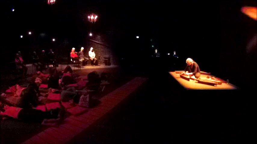 In this case, the elements of a customary concert were coaxed to fade out through several modifications (Image 9). There were carpets and pillows in the middle of the floor for the audience to lie on. The chairs were sparsely placed, not too close to each other, and it was possible to move them. The audience was instructed to leave their shoes outside the concert hall – some wool socks and slippers were available. Needless to say, the mobiles were to be turned off, and people were told not to speak at all while inside. People could come and go to and from the venue as they wished, except for a five-minute period about twenty-five minutes after the beginning when there was a moment of almost complete darkness – at that moment coming or going was not possible. There was a doorkeeper to take care of the silent movements of the door.