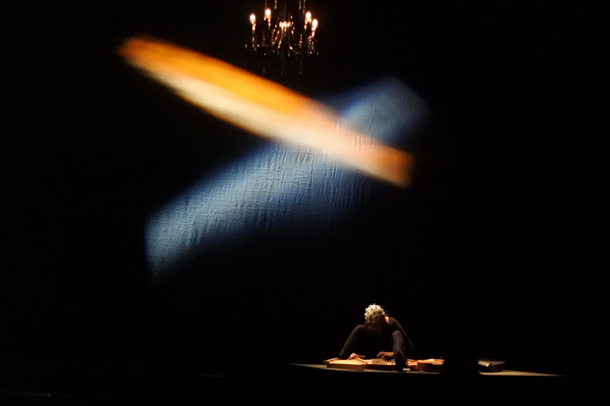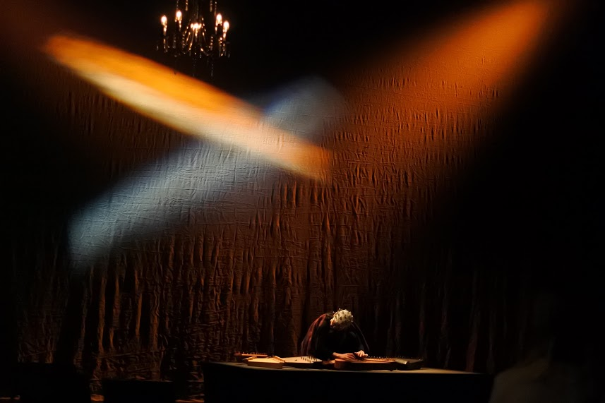 Later I learned that for some technical reasons the lighting technician had had to change the plan and lengthen the period of darkness. So, my internal clock was calculating right; 20 minutes had passed by the time I was ready to take the second instrument along. This is shown on the recorded audio as well, calming down and returning to the initial theme a little over 19 minutes in. Then searching (as I was forcing myself to continue with the 10-stringer despite the desire to move forward), searching, and about 23 minutes from the beginning, the first tones of the Korpiselkä kantele come along. Again, these kinds of things influence how I think about the music and, therefore, affect the decisions I make during ongoing improvisation.