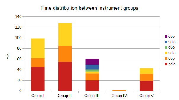Roughly defined, the music of the event can be separated into three parts: the first part including the EEG measurement; the middle part when I managed to immerse myself in timeless, introverted improvisation; and the third part where the music was more or less influenced by the silent film. There were eight instruments involved, and they were used in five different groups. Calculating the time used in each group and instrument gives the following statistics (Figures 5, 6 and 7). Between the groups the order from the most used to the less used is: Group II (Säteri & Shemeikka) 02:08:09 – Group I (Vaski10 & Korpiselkä) 01:39:05 – Group III (Ontrei & Viskoosi & Lovikka) 01:00:45 – Group V (Vaski10 & Kokle) 00:43:01 – Group IV (Vaski10 & Ontrei) 00:01:55.