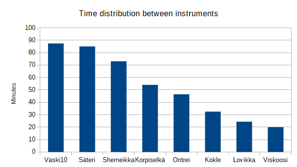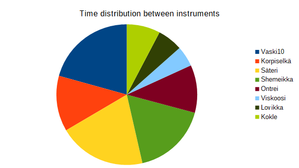 Between the instruments, the order from the most used to the least used is: Vaski10 01:27:27 – Säteri 01:25:00 – Shemeikka 01:13:10 – Korpiselkä 00:54:04 – Ontrei 00:46:27 – Kokle 00:32:32 – Lovikka 00:24:21 – Viskoosi 00:19:57. Solos as well as duos have been included in the participation rate of each instrument. In Figure 6 these statistics are shown as a pie chart where the instruments belonging in the same group are beside each other (excluding Group IV), and in Figure 7 as a bar chart where they are in order from the most used to the least used.