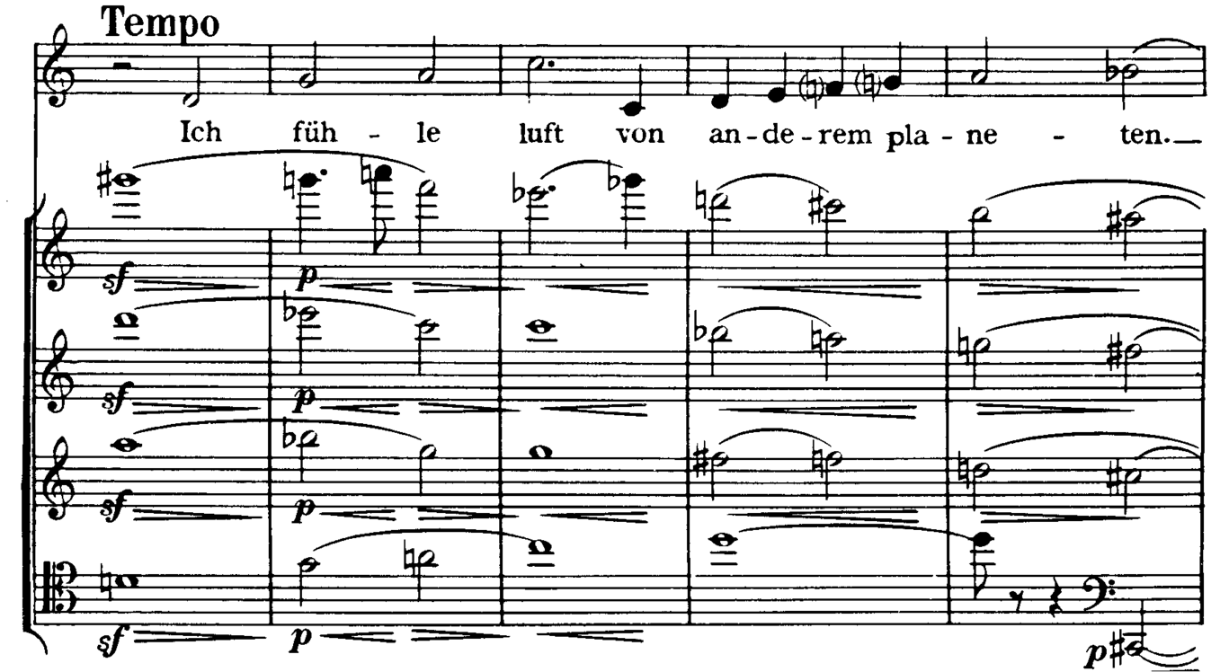 The scene is cold and inhuman, though exalted; the sense of its sublimity (as Kant had realized) depends on deep-lying alienation and even fear on the part of the awestruck hearer. Even more than in Beethoven, Stravinsky here evokes a sense of space as infinite, more-than-human, a godhead to which human sacrifice is offered to bring the spring. As Pascal thought, “the eternal silence of these infinite spaces fills me with dread [m’effraie]” (Pascal 1995: 66) and also with a new kind of wonder. For his part, Arnold Schoenberg took up this sense of wonder in his setting of Stefan George’s poem “Entrückung” as the final movement of his String Quartet No. 2 in F# minor, op. 10 (1908); the inclusion of a human voice surely looks back to Beethoven’s choral finale. George’s text “Ich fühle Luft von anderem Planeten (I feel the air of another planet)” explicitly evokes space as the “air of another planet” that engulfs the singer in “unfathomable thanks and unnamed praise” (Figure 5; SoundObject 3).