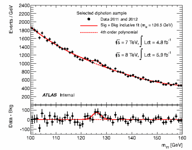Figure 6a: Higgs boson data (Credit: ATLAS collaboration; copyright CERN), showing the number of events observed plotted against the invariant mass in GeV. The lower register shows the background as a straight line, highlighting the appearance of the “bump” at 126.5 GeV, interpreted as the invariant mass of the observed Higgs particle.