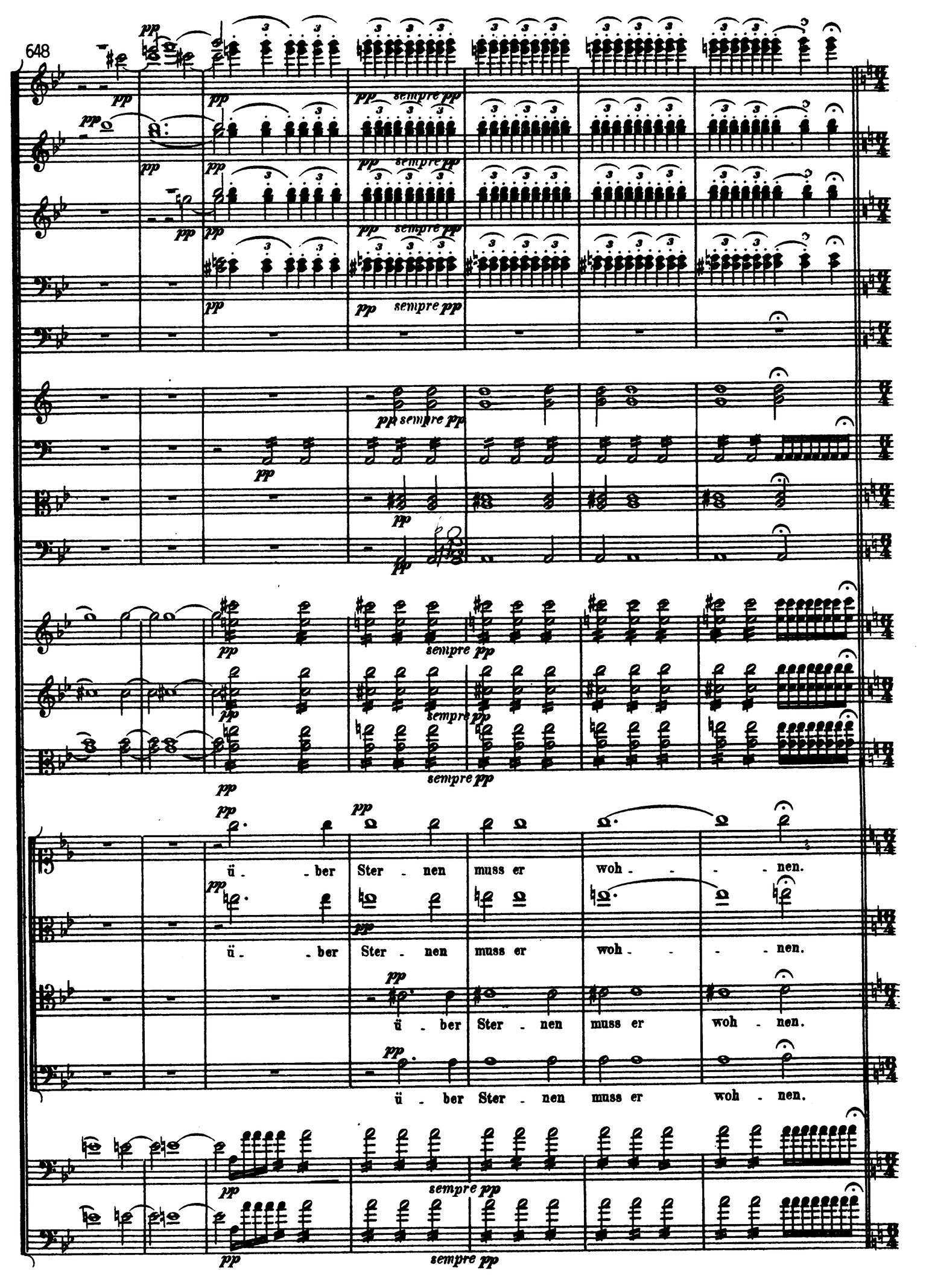 In this passage, Beethoven was perhaps the first composer to give sonic expression to the Pascalian awe of infinite space, using sound to instill a kind of direct mystical experience in ways no word or visible image could convey. Indeed, Beethoven indicates the crucial importance of this moment by its placement in his symphonic design, as the essential locus of exalted rapture whose mysterious power ignites the ensuing Dionysiac praise of Joy in the remainder of the final movement. Yet the still center of this work is not the “loving Father,” nor even the stars beyond which He dwells, but the eerie strains of space itself, for the listener perceives more the sense of infinite distance and strangeness than any kind of distinct object: a mysterious twinkling without visible stars. Paradoxically, this moment uses harmony to evoke an unheard harmony, the tonic implied (though not stated) as the virtual but invisible pole around which the dominant ninth chord revolves.