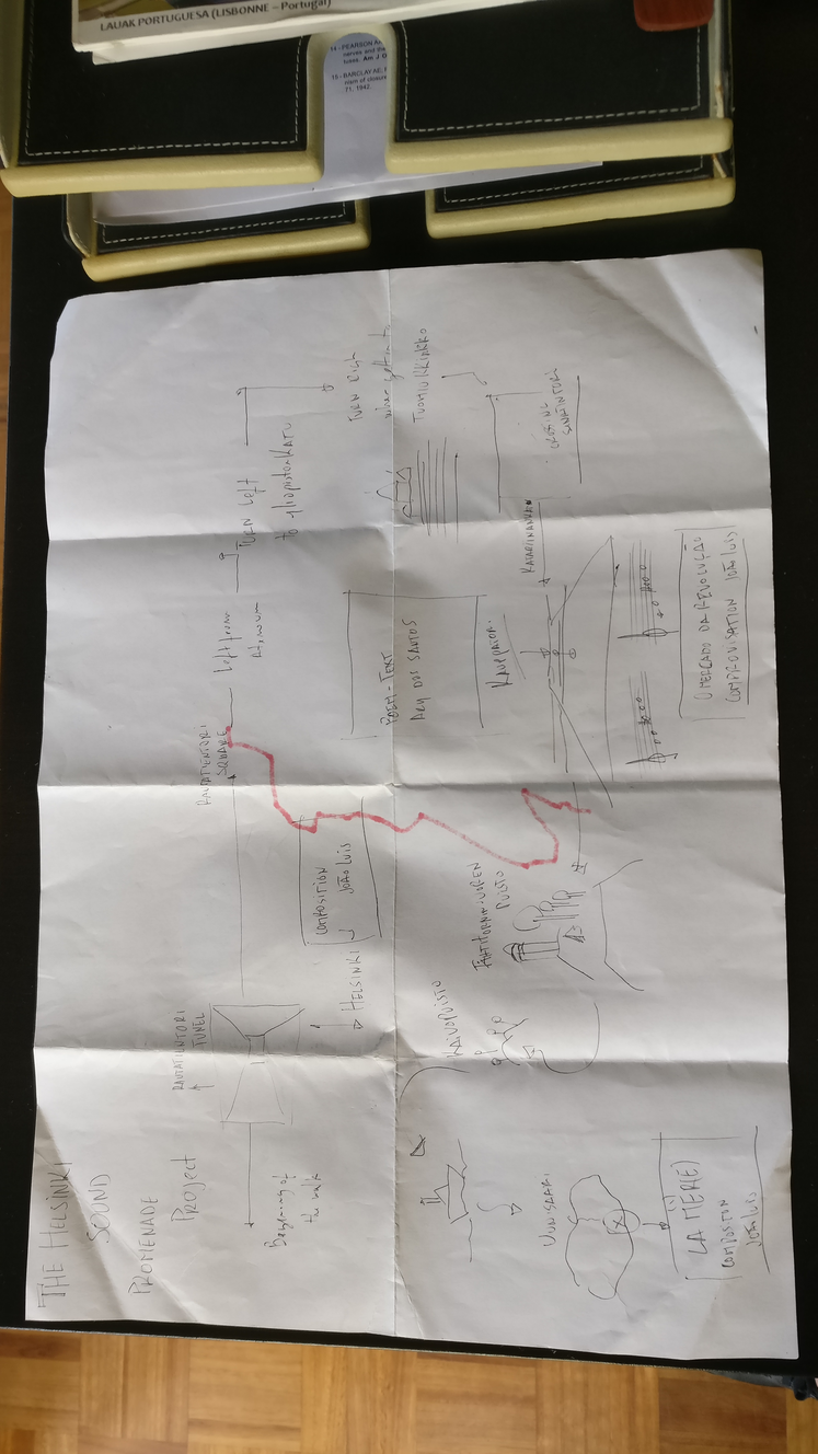 In a broaden perspective, deep mapping is a process of digging into the history of a specific place, in order to tell the story of the people or relevant happenings at some point in time and redesign a map that includes more information than just important geographical spots. As part of the creative process, was also my intention to create a chart that would include relevant information about the performance. A sketched representation of the geographical spots where the musical performances happen and also the path or promenade that the audience should follow. Like in a deep mapping exercise, I intent to invite the audience for a walk and be aware of the sounds of the urban space, having an experience of a live storytelling performance that develops along the promenade. The same “map” is used by the performers as a guide or musical chart. They are also invited on a journey along the city, but they are asked to influence and shape the story itself with occasional composed excerpts of music. Melodic lines and chord progressions that are both examples of sonification of the landscape and conceptual interpretations of the spaces (tunnel, market square and natural environment).