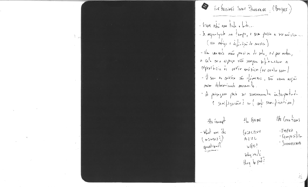 The Helsinki Sound Promenade Project was primarily idealized over the idea of exploring and taking the soundscape as part of a musical performance. According to the concept of listening to a concert in a traditional context, one just simply focusses on the composition and the execution itself, often in spaces created to most benefit the acoustic qualities of the instruments and/or voices, frequently absorbing or annulling the noise produced by the soundscape. In other hand, other styles of music accept and even celebrate the acoustic environment that is not controlled by the performers. In my perspective, the soundscape is not just a source of sounds but is also a live representation of the people´s quotidian who co-habit the space itself. Urban sounds like the cosmopolitan daily activities, the traffic, the industries, the constructions and demolitions, the dynamics between rush hours and less busy moments in a specific place and the occasional wildlife, become symbols of cultural and sociological aspects, and these sounds are able to provide information on how the community relates with the environment and with itself. In my vision of this project, one would explore the acoustic taking advantage of its variety and its unpredictability, unpacking an infinite box of possible dialogs that would enrich the performance itself.