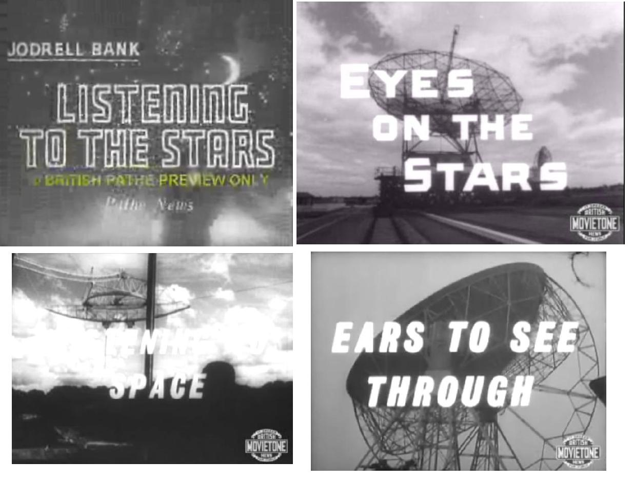 Figure 1: Screen shots of opening title from newsreels on radio astronomy Listening to the Stars (1957), Eyes on the Stars (1961), Listening to Space (1963), and Ears to See Through (1964)