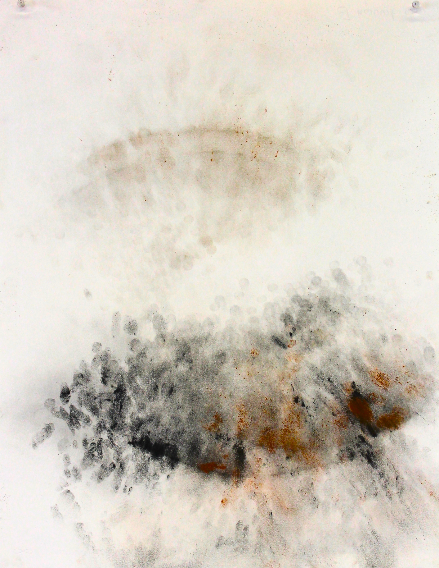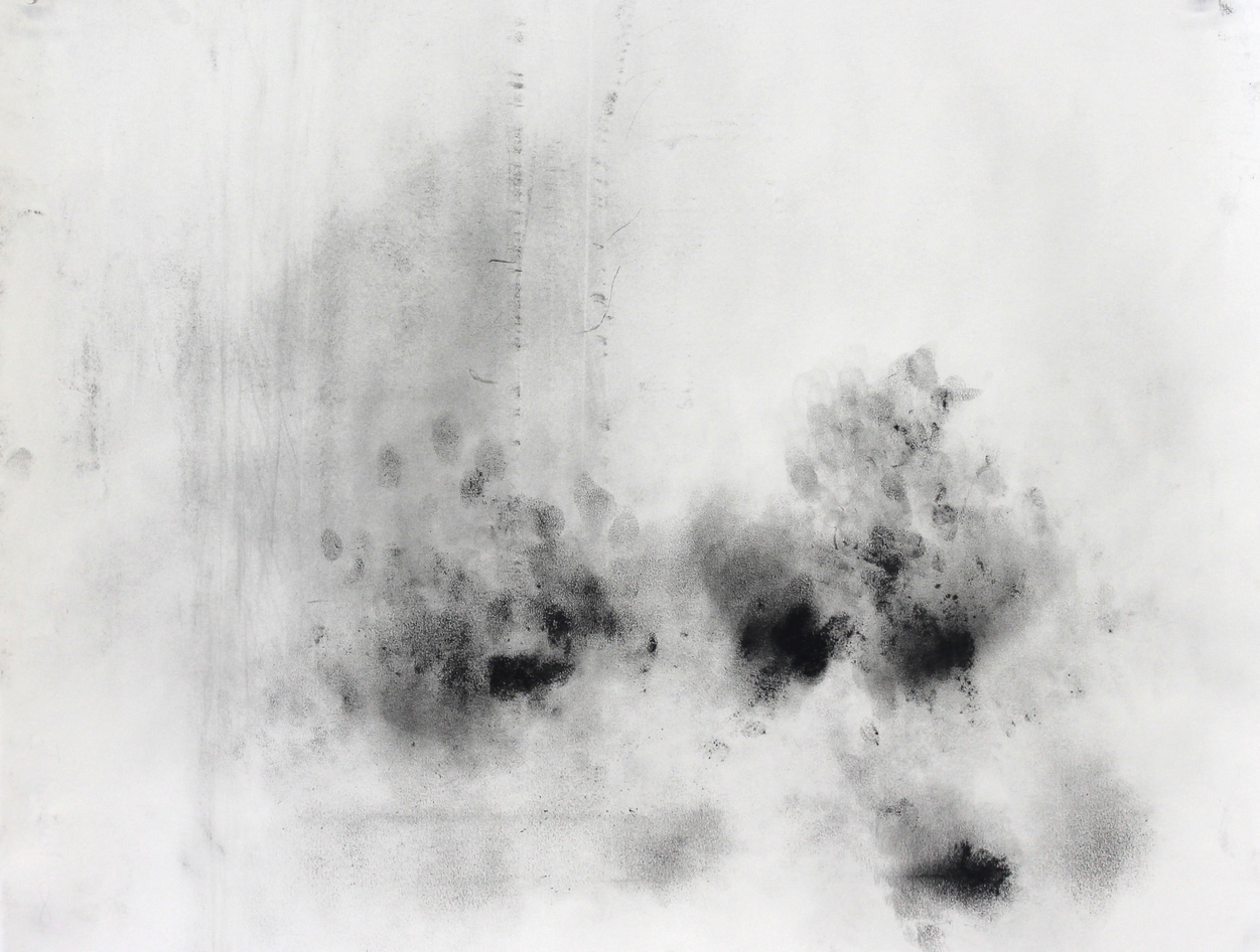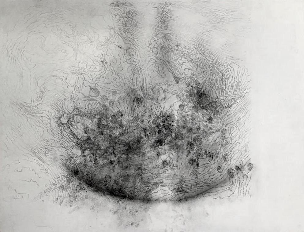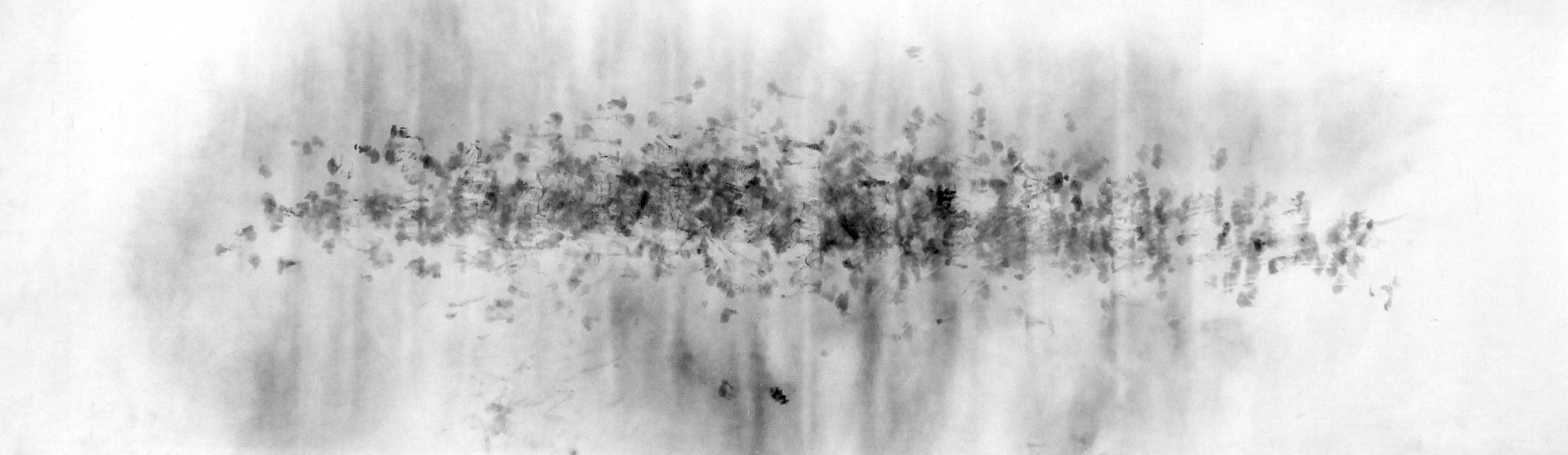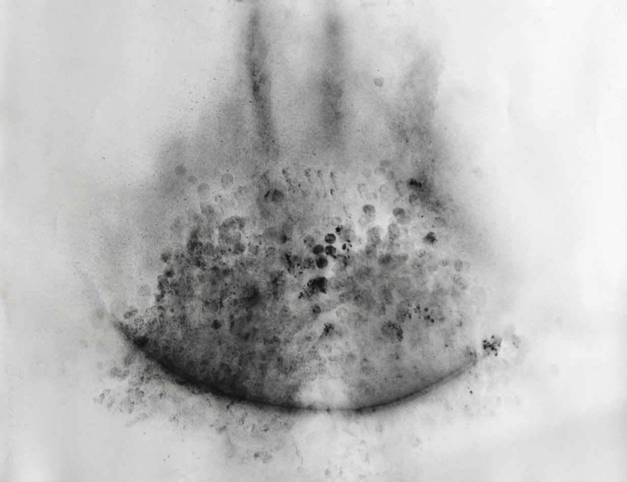 The series of collaborative drawings and videos (involving the percussionist Michel Bonneau and myself) attempts to seize the flow and resonance of sound, tracing the ephemerality of the musician’s gestures as he improvises in the interval of rhythms and their corporeal-material manifestation. Charcoal (and pigment) powder was sprinkled onto resilient surfaces of paper that were loosely stretched over various percussion instruments. (Different colored natural pigments were explored for their distinctive qualities of weight and volatility.) The musician then improvised with these instruments, leaving traces of rhythmic forces as they responded to the thin resounding membranes and coalesced in the space in-between volatile charcoal powder and sonorous reverberation. The fingers, as Ingold points out about the cello player, ‘show up simultaneously in two quite different ways, at once corporeal, in the haptic space of performance, and as phantom, in the atmospheric space of explosion’. Here, ‘sound wraps around [fingers, palms or mallets] forming eddies in the process. Every eddy is a center of auditory awareness.’ (ibid.) Re-sounding Movements exposes the haptic in the optical and auditory as corporeal forces carry the charcoal in the air, flowing, fluctuating, and fusing over the interacting membranes of paper and goat’s hide. A smooth space emerges, ‘occupied by intensities, wind and noise, forces, and sonorous and tactile qualities’. (Deleuze and Guattari 1987) It is a ‘nomadic absolute that is one with becoming itself, with process. It is the absolute passage, which in nomad art merges with its manifestation’. (ibid.) Smooth space is continually being traversed and transformed by the striated space of markings (or finger-prints) on the paper that punctuate and fix the charcoal to the surface while simultaneously propelling it above. Striated space is at once immobilized and dissolved, enabling smooth space to develop in the process; nomad space and sedentary space co-exist in their formation.