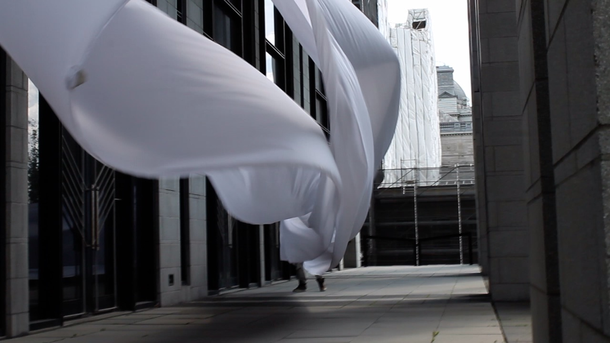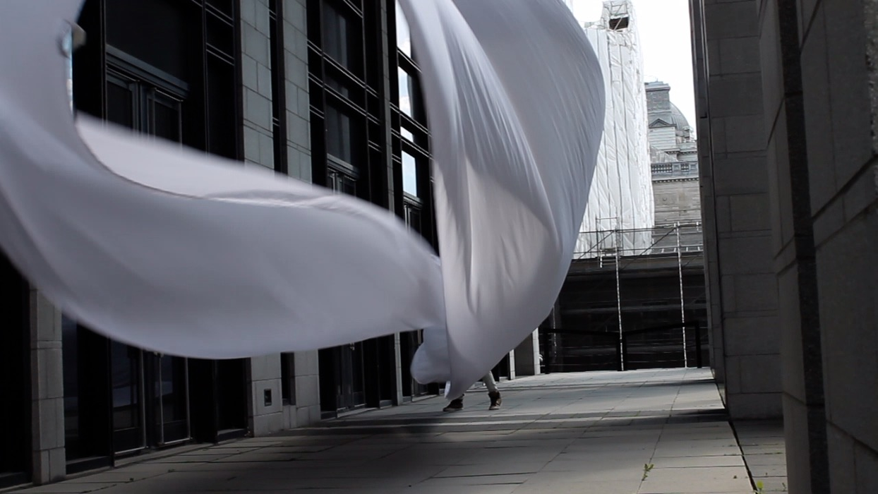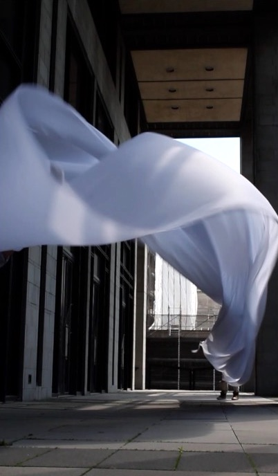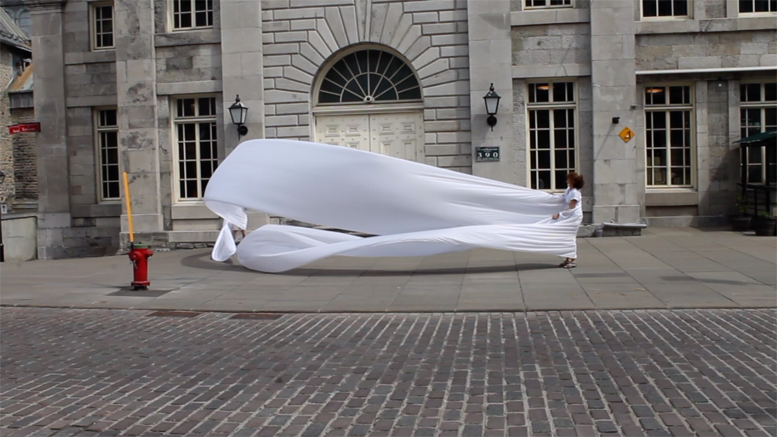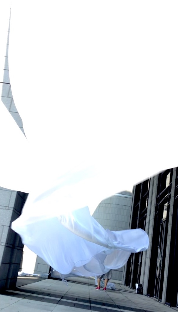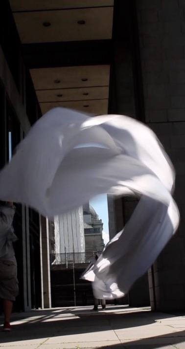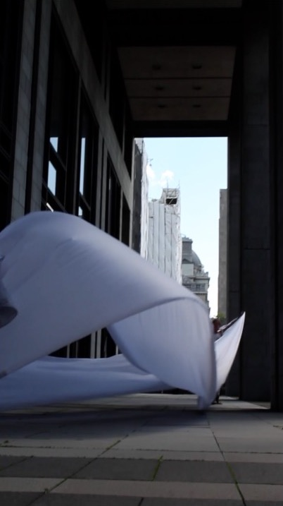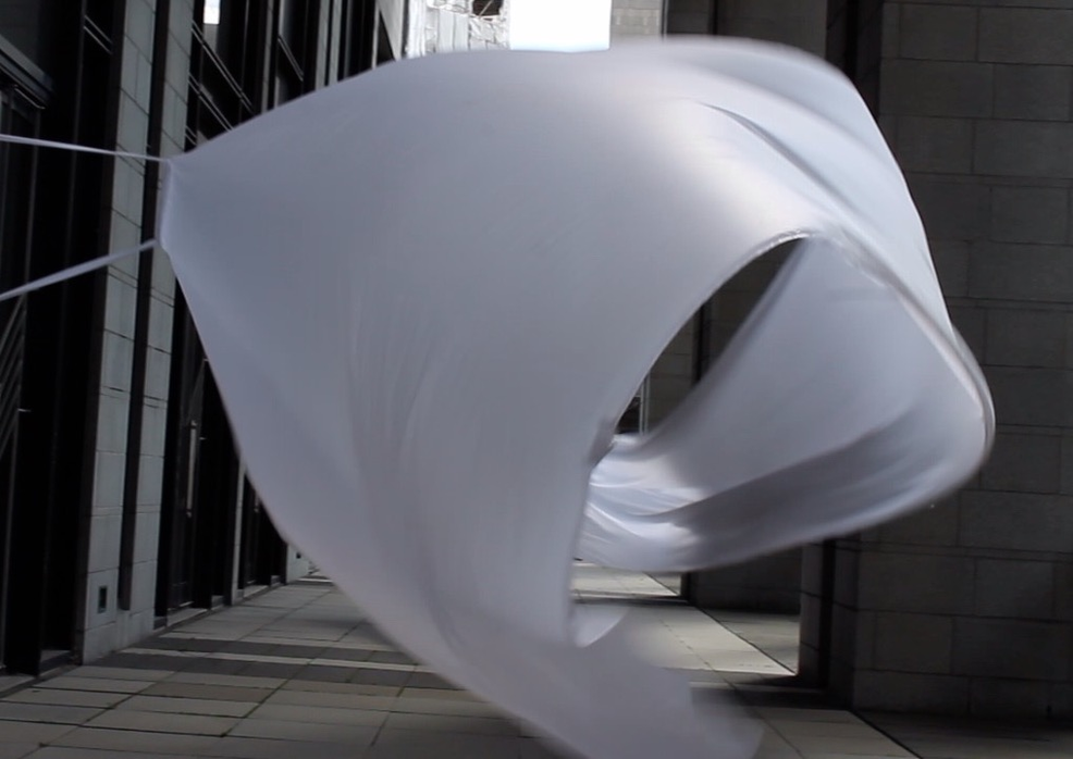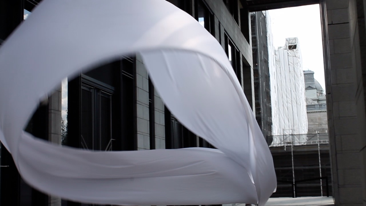 The first thing the nomadic surflines set out to do was to inhabit the city, find a urban territory itching to deterritorialize, sail on its various rhythms, taking the pulse of its flows and turbulences, attempting to liberate its light, modulate its textures, feel its haptic aerial breath, and ephemerally resurface smooth out of its striated spaces. What appeared throughout their journey, in the encounter of fixed and fluctuating matter, was the vital power of urban interstitial thresholds composed in the mutual translation and traversing of striated-smooth space. It brought to life what was imminently there for the making and transforming, in potential future co-compositions. As mutant line-surfaces, the membranes became a formative power of expression, blurring distinctions of exterior and interior. Moving between architectural solids, structures, forms, brushing against or fleetingly clinging to their geometricized, historicized surfaces, molding their topographies just long enough to engender their dissipation, topological involutions. What stood silent and cristalline against the background of inert perspectival forms and framings anchored to seemless horizons seemed to liberate its power of involution in the vortical deviations of the membranes’ ghostly lineings. The force of winds : speeds, accelerations-deceleration, and intensities transformed into rhythms by their assemblage with the massive slowness of striated bodies was the main activator of these topological variations captured by the membranes in their encounter with light. Or perhaps it was the winds that captured the light, and the light, the membranes…or yet again the light resonating in contraction-dilation, cold-heat, dampness-dryness that captured the winds and the winds, the membranes. Regardless, molecular lines of membranes and molar lines of architecture interpenetrated across urban interstices, milieux traversed and transformed each other in a cartography of planes.
