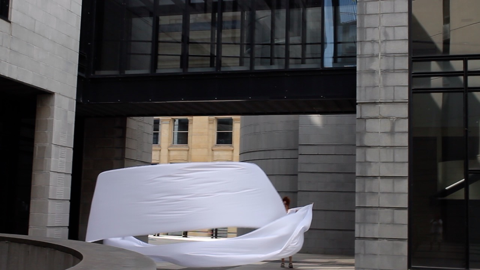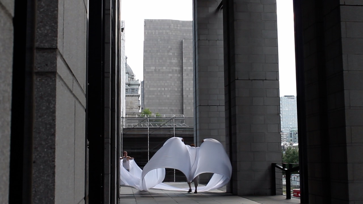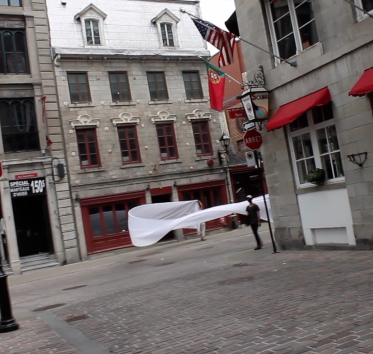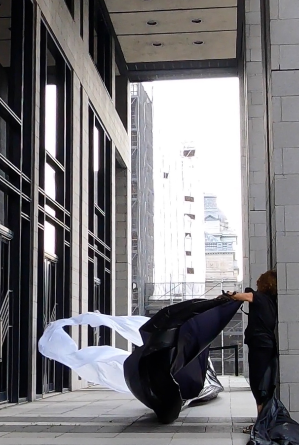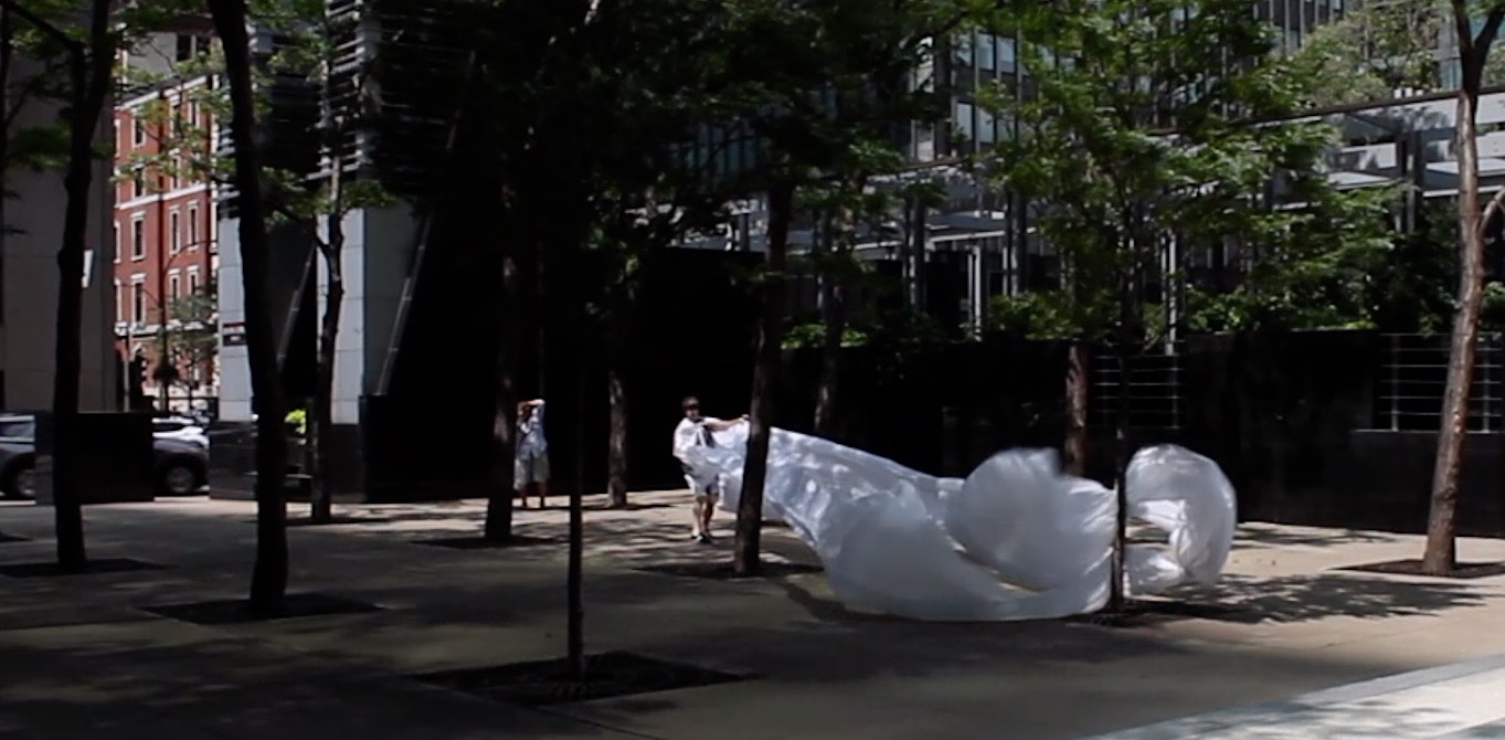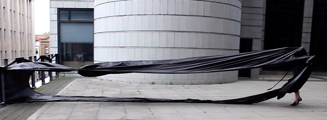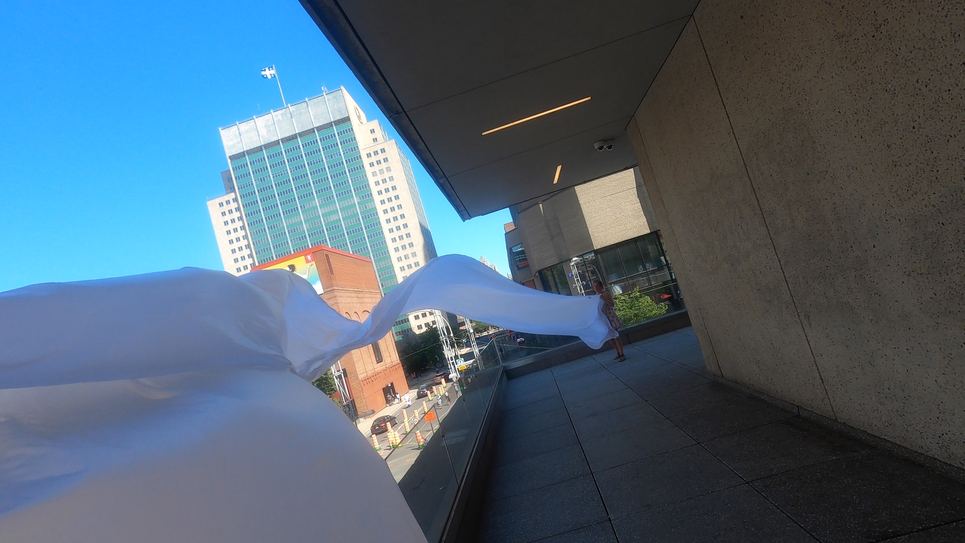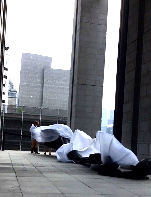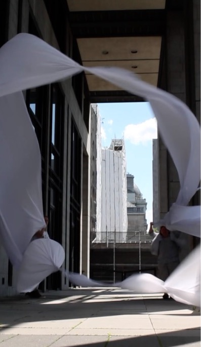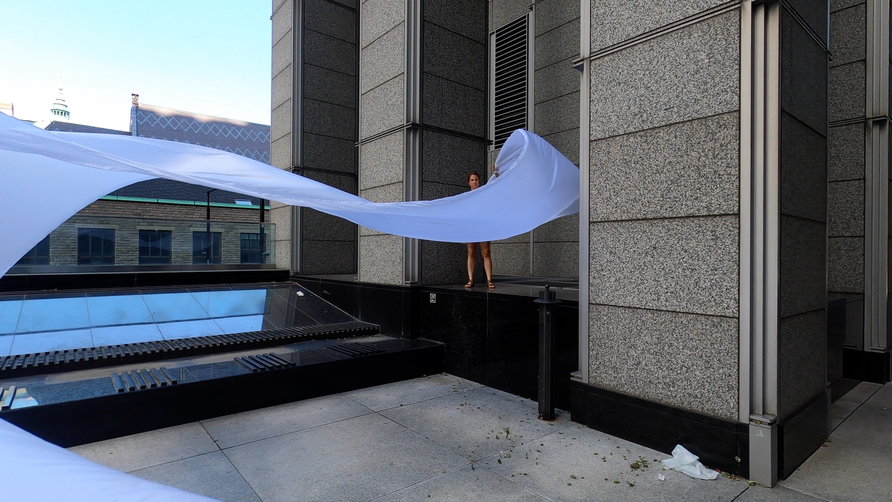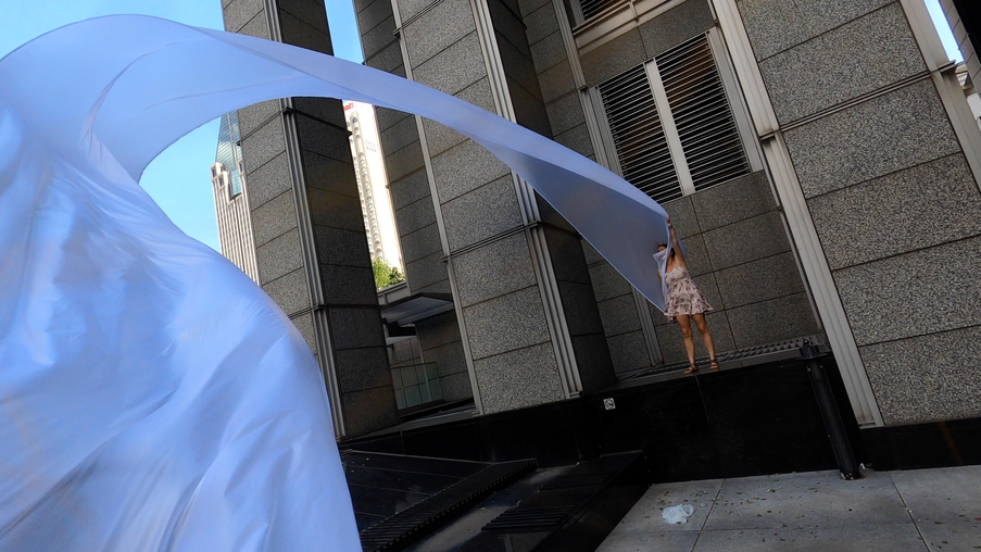 The first thing the nomadic surflines set out to do was to inhabit the city, find a urban territory itching to deterritorialize, sail on its various rhythms, taking the pulse of its flows and turbulences, attempting to liberate its light, modulate its textures, feel its haptic aerial breath, and ephemerally resurface smooth out of its striated spaces. What appeared throughout their journey, in the encounter of fixed and fluctuating matter, was the vital power of urban interstitial thresholds composed in the mutual translation and traversing of striated-smooth space. It brought to life what was imminently there for the making and transforming, in potential future co-compositions. As mutant line-surfaces, the membranes became a formative power of expression, blurring distinctions of exterior and interior. Moving between architectural solids, structures, forms, brushing against or fleetingly clinging to their geometricized, historicized surfaces, molding their topographies just long enough to engender their dissipation, topological involutions. What stood silent and cristalline against the background of inert perspectival forms and framings anchored to seemless horizons seemed to liberate its power of involution in the vortical deviations of the membranes’ ghostly lineings. The force of winds : speeds, accelerations-deceleration, and intensities transformed into rhythms by their assemblage with the massive slowness of striated bodies was the main activator of these topological variations captured by the membranes in their encounter with light. Or perhaps it was the winds that captured the light, and the light, the membranes…or yet again the light resonating in contraction-dilation, cold-heat, dampness-dryness that captured the winds and the winds, the membranes. Regardless, molecular lines of membranes and molar lines of architecture interpenetrated across urban interstices, milieux traversed and transformed each other in a cartography of planes.