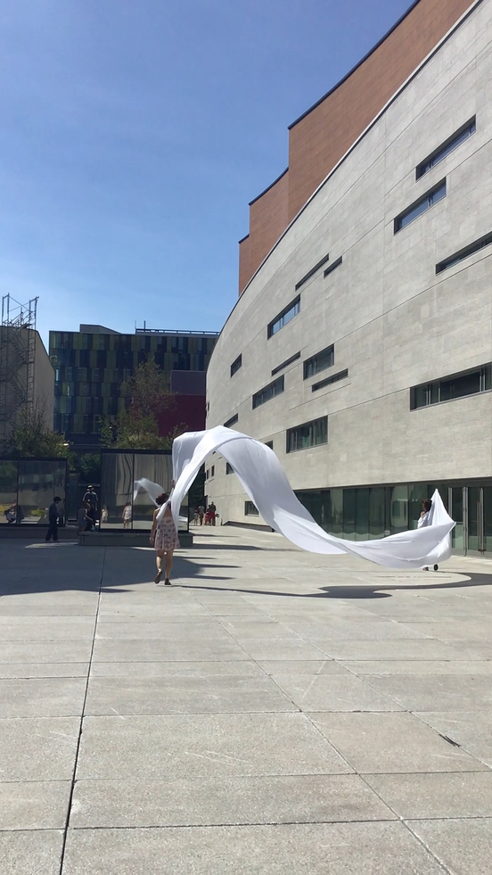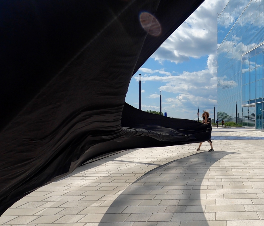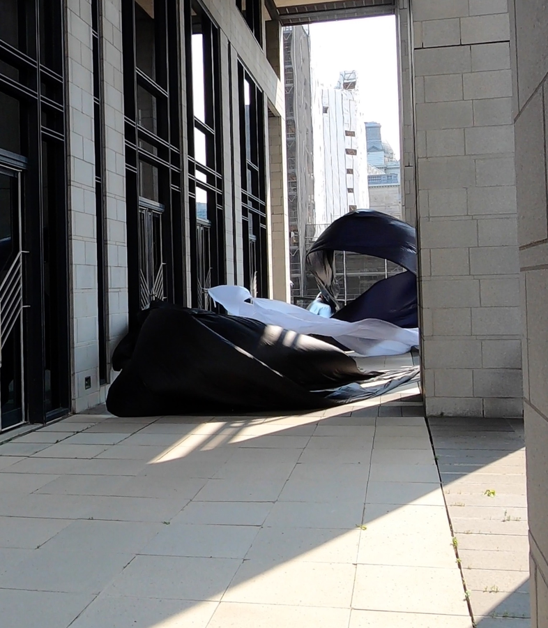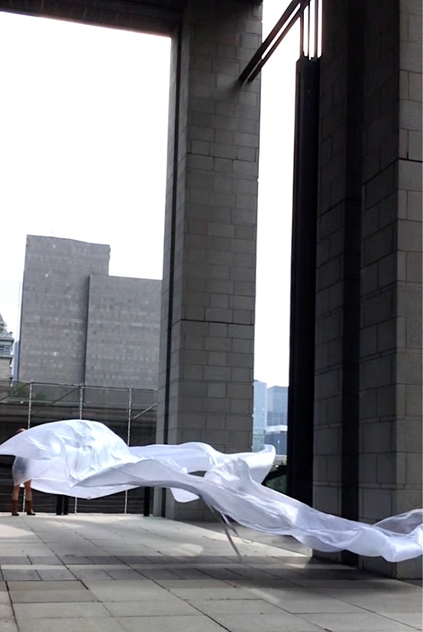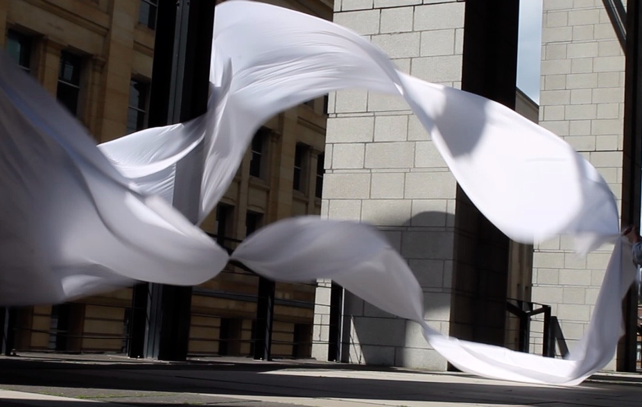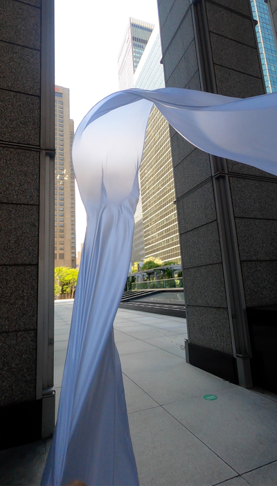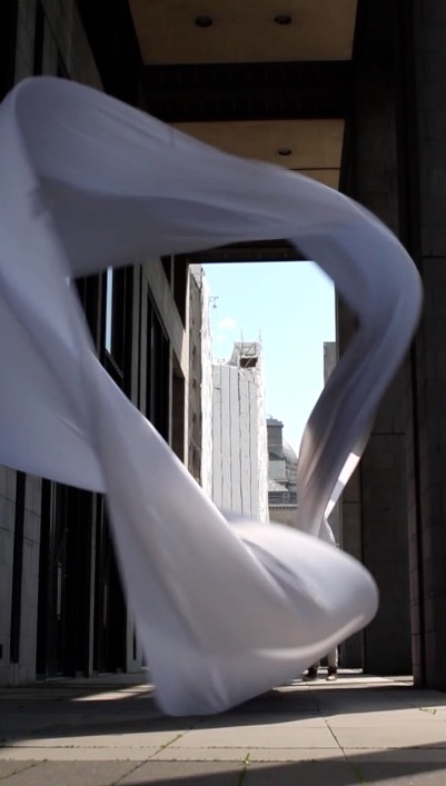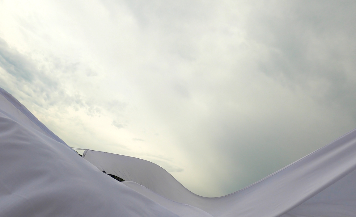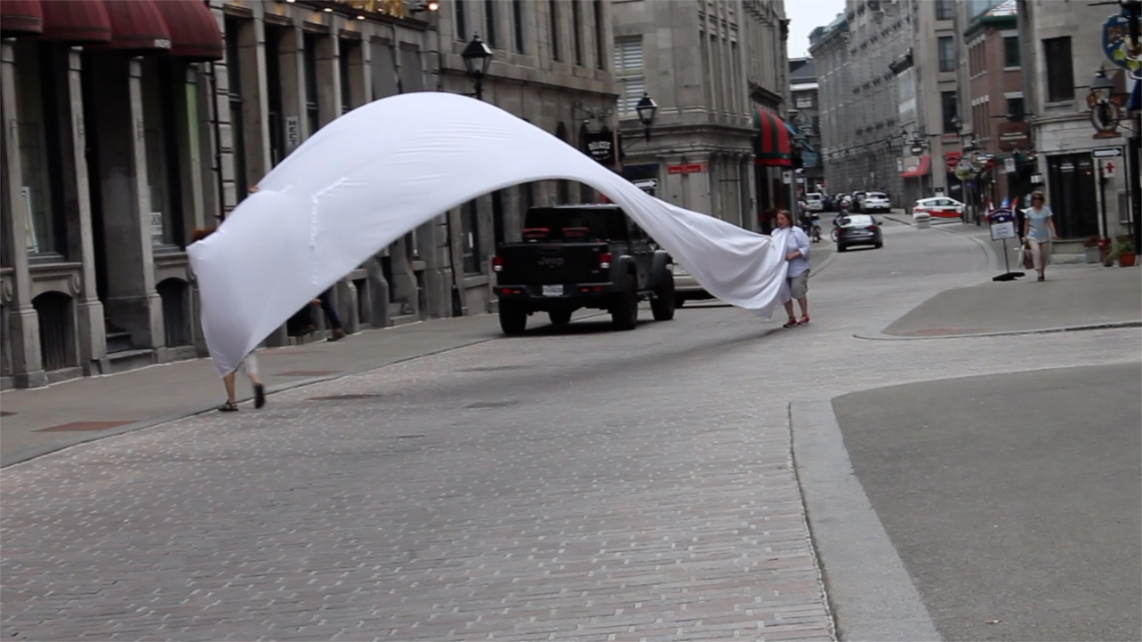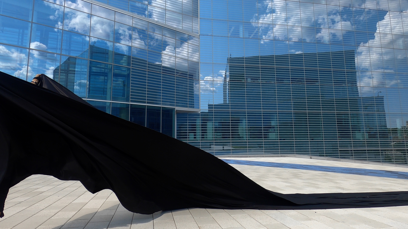 The first thing the nomadic surflines set out to do was to inhabit the city, find a urban territory itching to deterritorialize, sail on its various rhythms, taking the pulse of its flows and turbulences, attempting to liberate its light, modulate its textures, feel its haptic aerial breath, and ephemerally resurface smooth out of its striated spaces. What appeared throughout their journey, in the encounter of fixed and fluctuating matter, was the vital power of urban interstitial thresholds composed in the mutual translation and traversing of striated-smooth space. It brought to life what was imminently there for the making and transforming, in potential future co-compositions. As mutant line-surfaces, the membranes became a formative power of expression, blurring distinctions of exterior and interior. Moving between architectural solids, structures, forms, brushing against or fleetingly clinging to their geometricized, historicized surfaces, molding their topographies just long enough to engender their dissipation, topological involutions. What stood silent and cristalline against the background of inert perspectival forms and framings anchored to seemless horizons seemed to liberate its power of involution in the vortical deviations of the membranes’ ghostly lineings. The force of winds : speeds, accelerations-deceleration, and intensities transformed into rhythms by their assemblage with the massive slowness of striated bodies was the main activator of these topological variations captured by the membranes in their encounter with light. Or perhaps it was the winds that captured the light, and the light, the membranes…or yet again the light resonating in contraction-dilation, cold-heat, dampness-dryness that captured the winds and the winds, the membranes. Regardless, molecular lines of membranes and molar lines of architecture interpenetrated across urban interstices, milieux traversed and transformed each other in a cartography of planes.