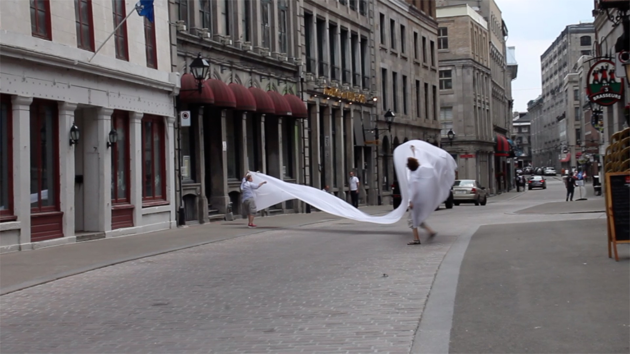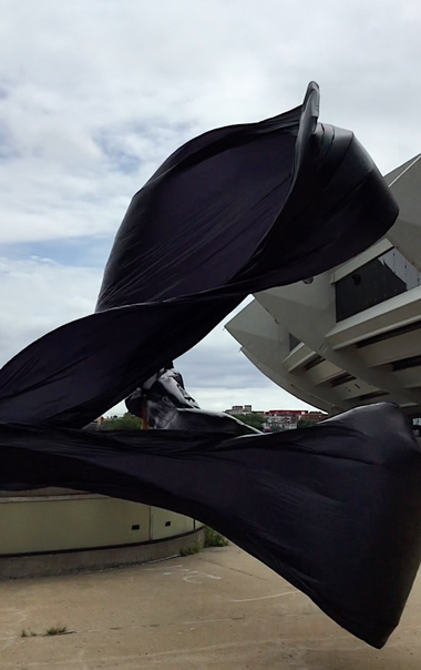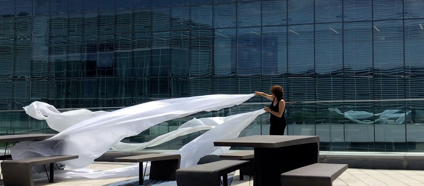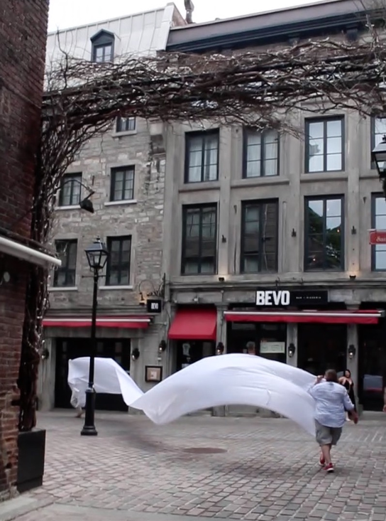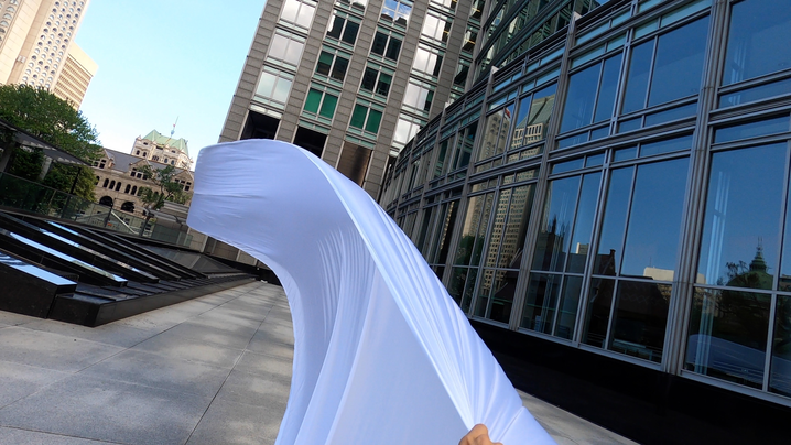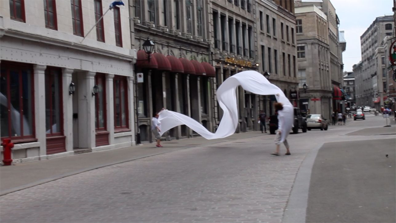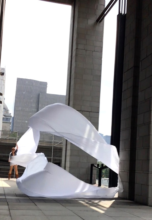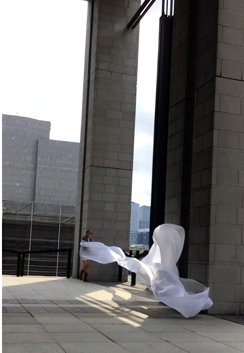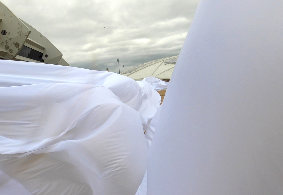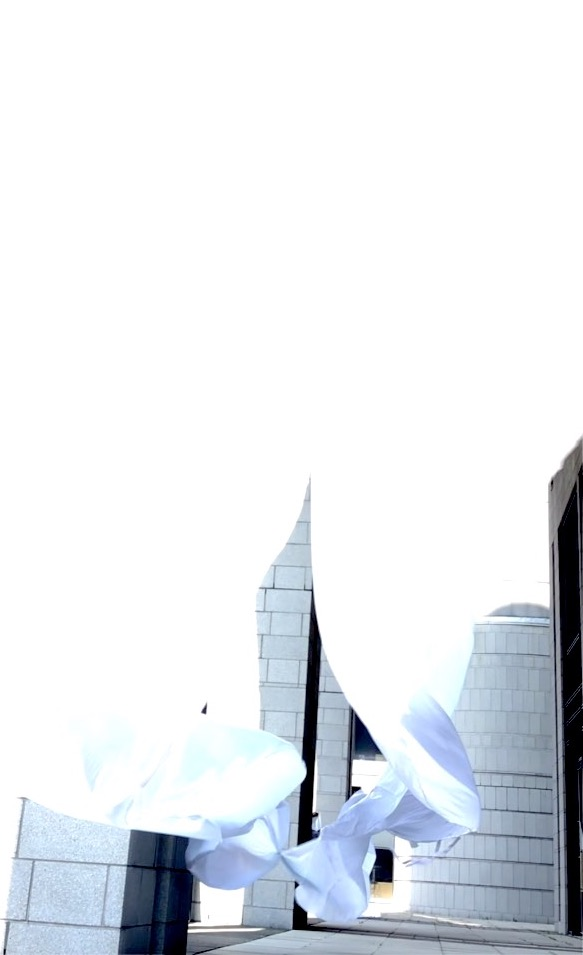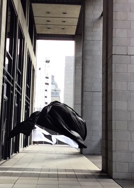The first thing the nomadic surflines set out to do was to inhabit the city, find a urban territory itching to deterritorialize, sail on its various rhythms, taking the pulse of its flows and turbulences, attempting to liberate its light, modulate its textures, feel its haptic aerial breath, and ephemerally resurface smooth out of its striated spaces. What appeared throughout their journey, in the encounter of fixed and fluctuating matter, was the vital power of urban interstitial thresholds composed in the mutual translation and traversing of striated-smooth space. It brought to life what was imminently there for the making and transforming, in potential future co-compositions. As mutant line-surfaces, the membranes became a formative power of expression, blurring distinctions of exterior and interior. Moving between architectural solids, structures, forms, brushing against or fleetingly clinging to their geometricized, historicized surfaces, molding their topographies just long enough to engender their dissipation, topological involutions. What stood silent and cristalline against the background of inert perspectival forms and framings anchored to seemless horizons seemed to liberate its power of involution in the vortical deviations of the membranes’ ghostly lineings. The force of winds : speeds, accelerations-deceleration, and intensities transformed into rhythms by their assemblage with the massive slowness of striated bodies was the main activator of these topological variations captured by the membranes in their encounter with light. Or perhaps it was the winds that captured the light, and the light, the membranes…or yet again the light resonating in contraction-dilation, cold-heat, dampness-dryness that captured the winds and the winds, the membranes. Regardless, molecular lines of membranes and molar lines of architecture interpenetrated across urban interstices, milieux traversed and transformed each other in a cartography of planes.