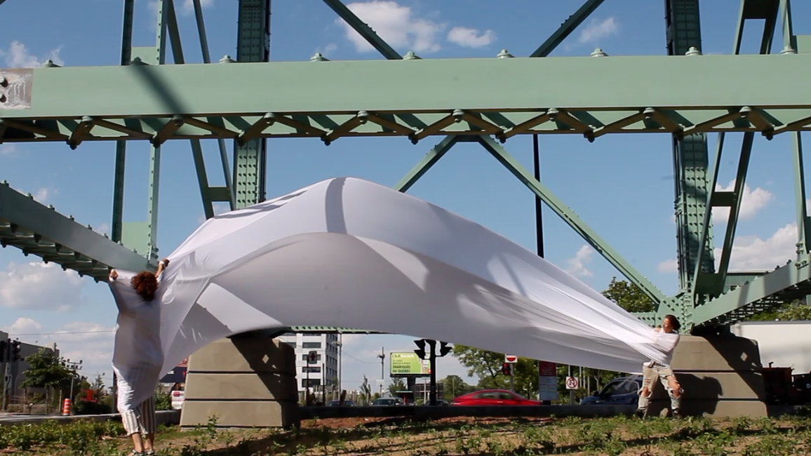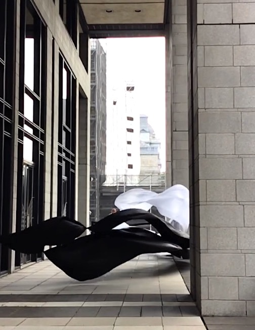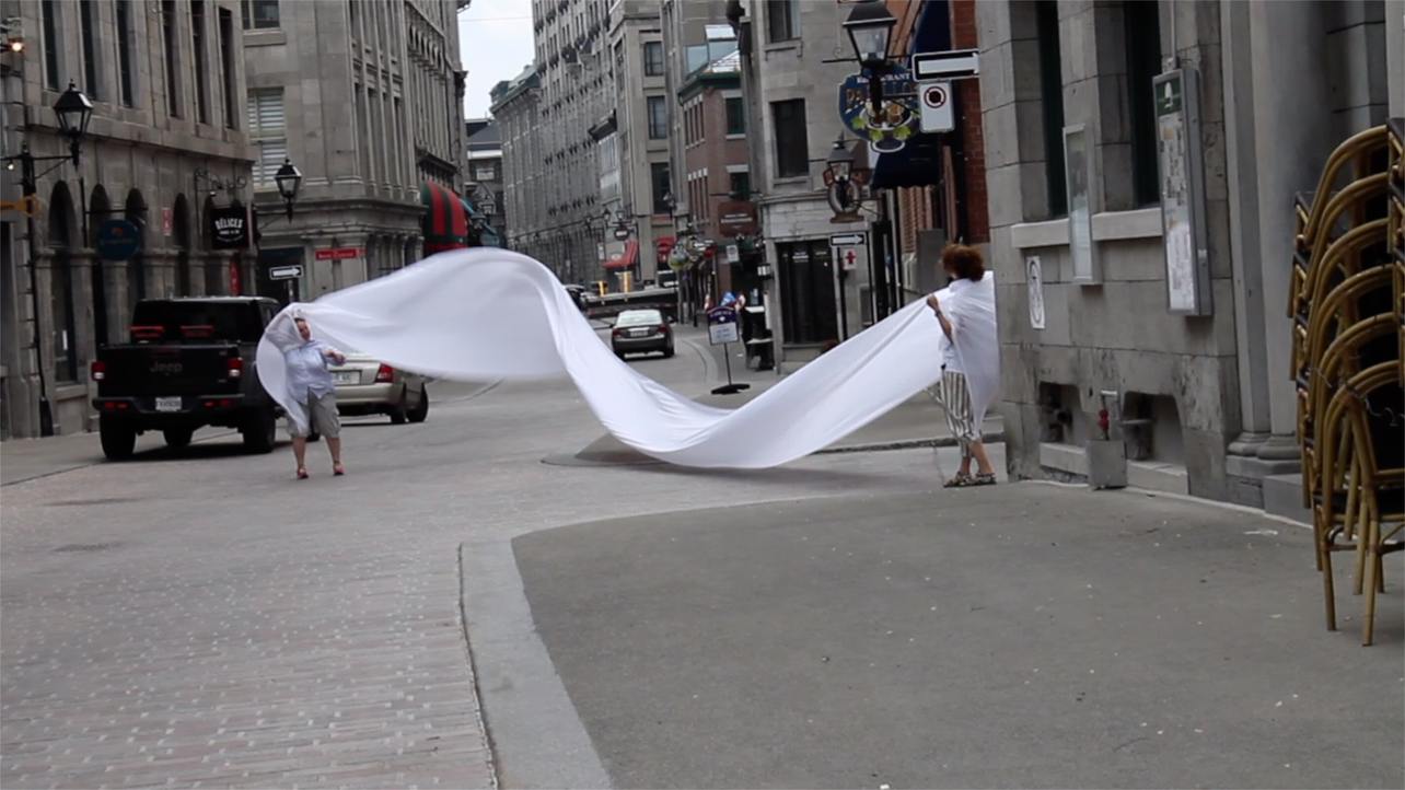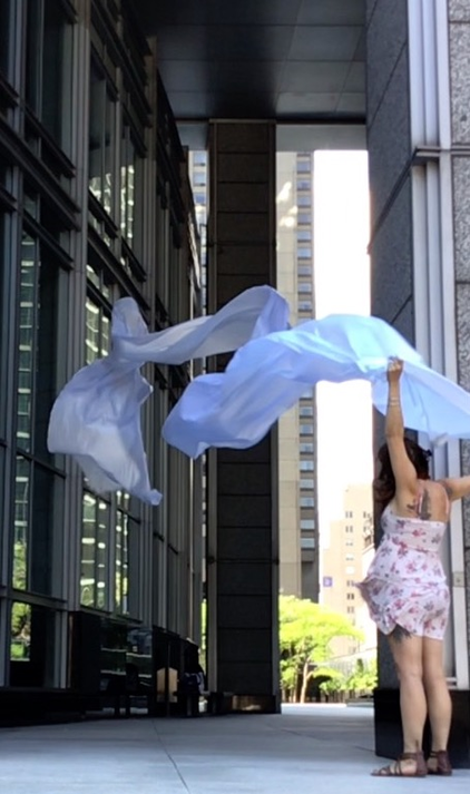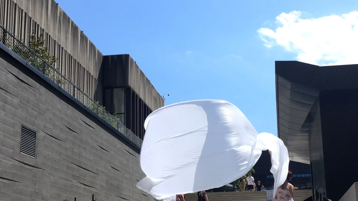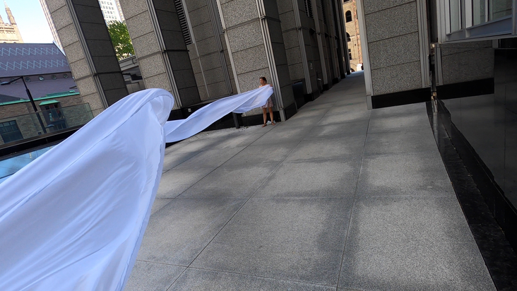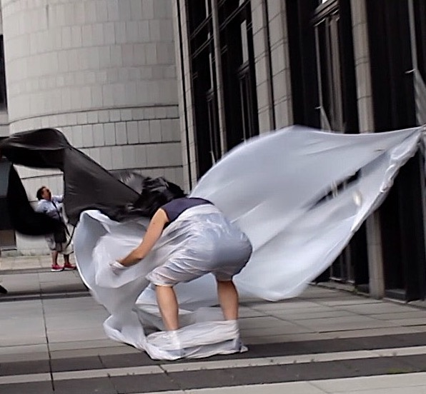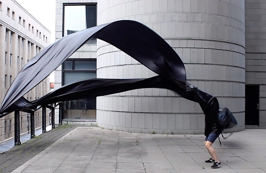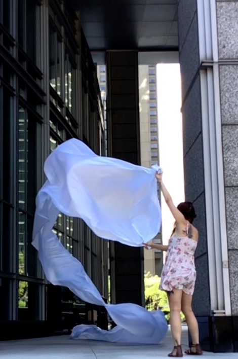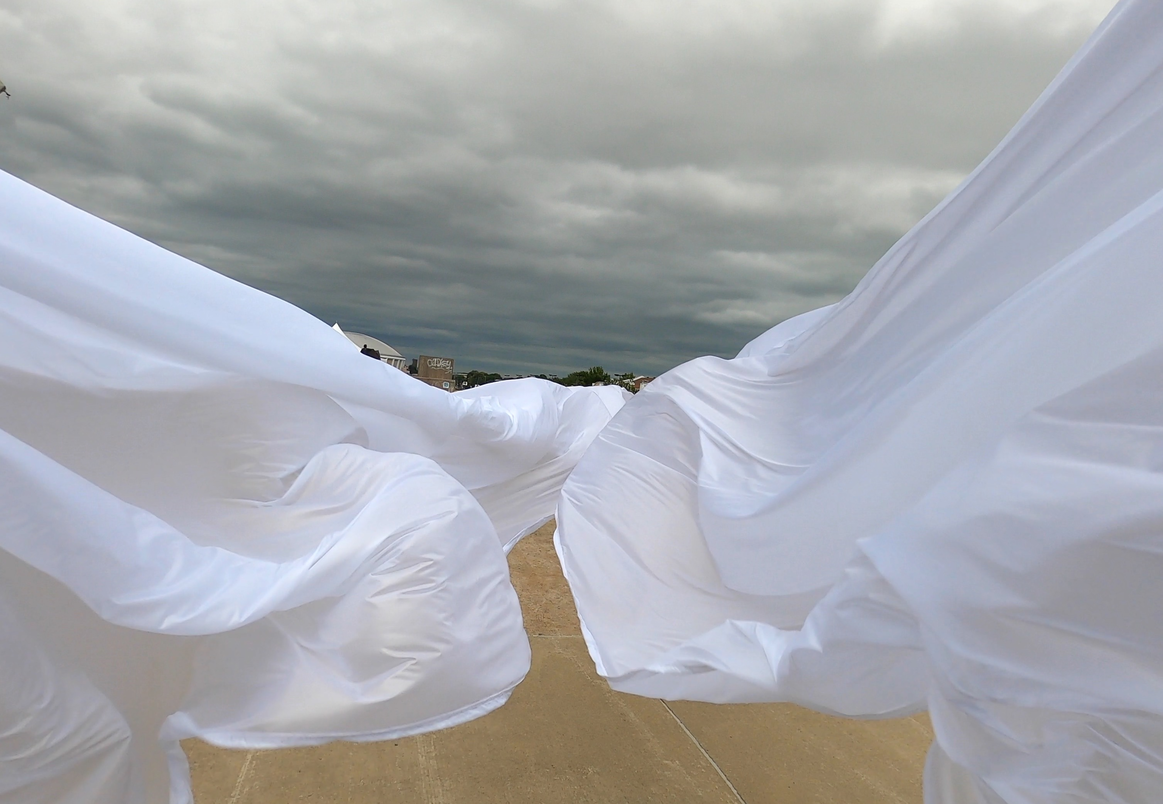 The first thing the nomadic surflines set out to do was to inhabit the city, find a urban territory itching to deterritorialize, sail on its various rhythms, taking the pulse of its flows and turbulences, attempting to liberate its light, modulate its textures, feel its haptic aerial breath, and ephemerally resurface smooth out of its striated spaces. What appeared throughout their journey, in the encounter of fixed and fluctuating matter, was the vital power of urban interstitial thresholds composed in the mutual translation and traversing of striated-smooth space. It brought to life what was imminently there for the making and transforming, in potential future co-compositions. As mutant line-surfaces, the membranes became a formative power of expression, blurring distinctions of exterior and interior. Moving between architectural solids, structures, forms, brushing against or fleetingly clinging to their geometricized, historicized surfaces, molding their topographies just long enough to engender their dissipation, topological involutions. What stood silent and cristalline against the background of inert perspectival forms and framings anchored to seemless horizons seemed to liberate its power of involution in the vortical deviations of the membranes’ ghostly lineings. The force of winds : speeds, accelerations-deceleration, and intensities transformed into rhythms by their assemblage with the massive slowness of striated bodies was the main activator of these topological variations captured by the membranes in their encounter with light. Or perhaps it was the winds that captured the light, and the light, the membranes…or yet again the light resonating in contraction-dilation, cold-heat, dampness-dryness that captured the winds and the winds, the membranes. Regardless, molecular lines of membranes and molar lines of architecture interpenetrated across urban interstices, milieux traversed and transformed each other in a cartography of planes.