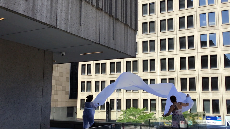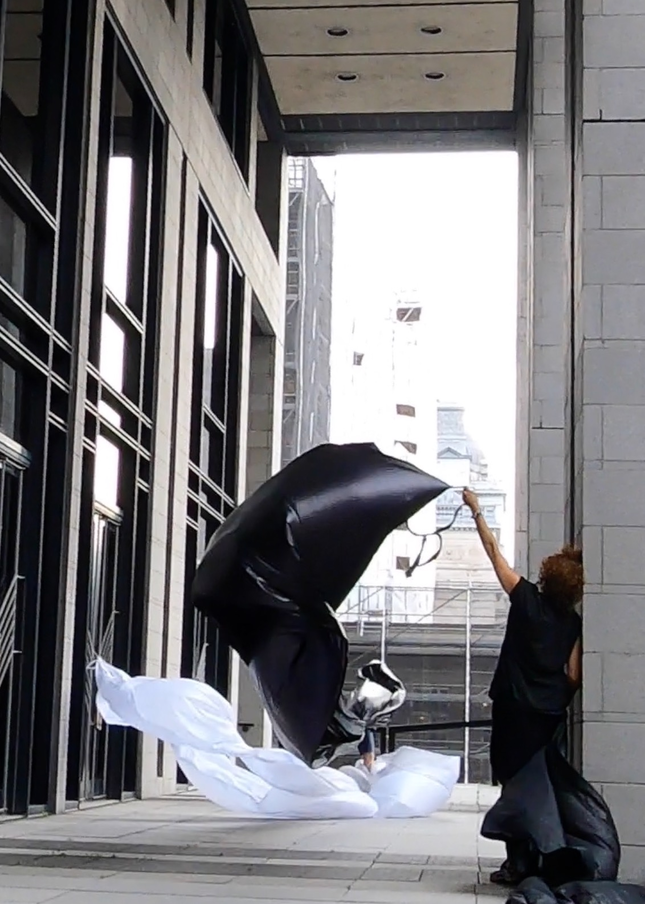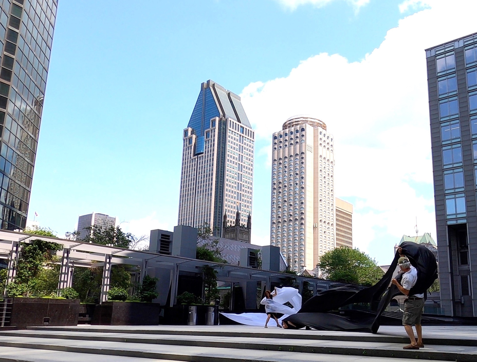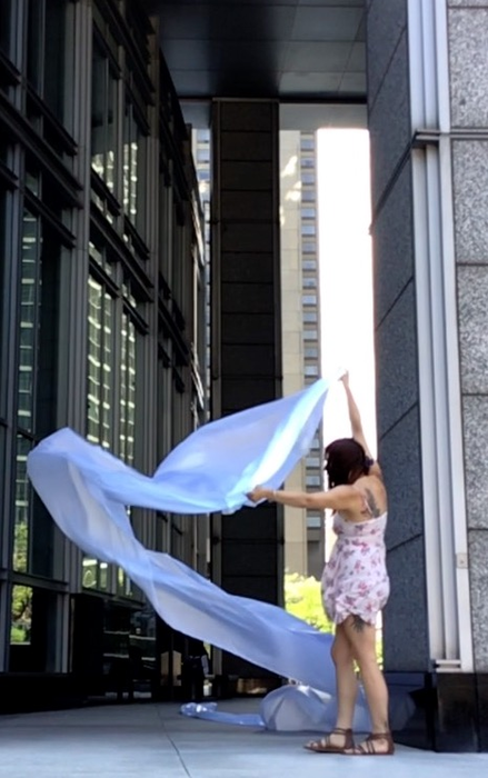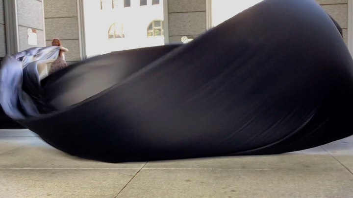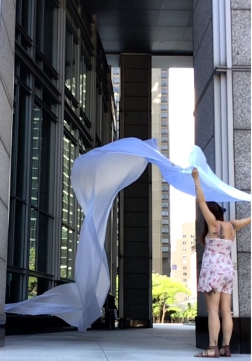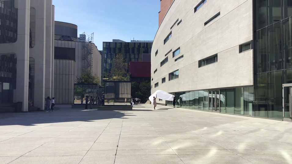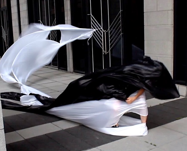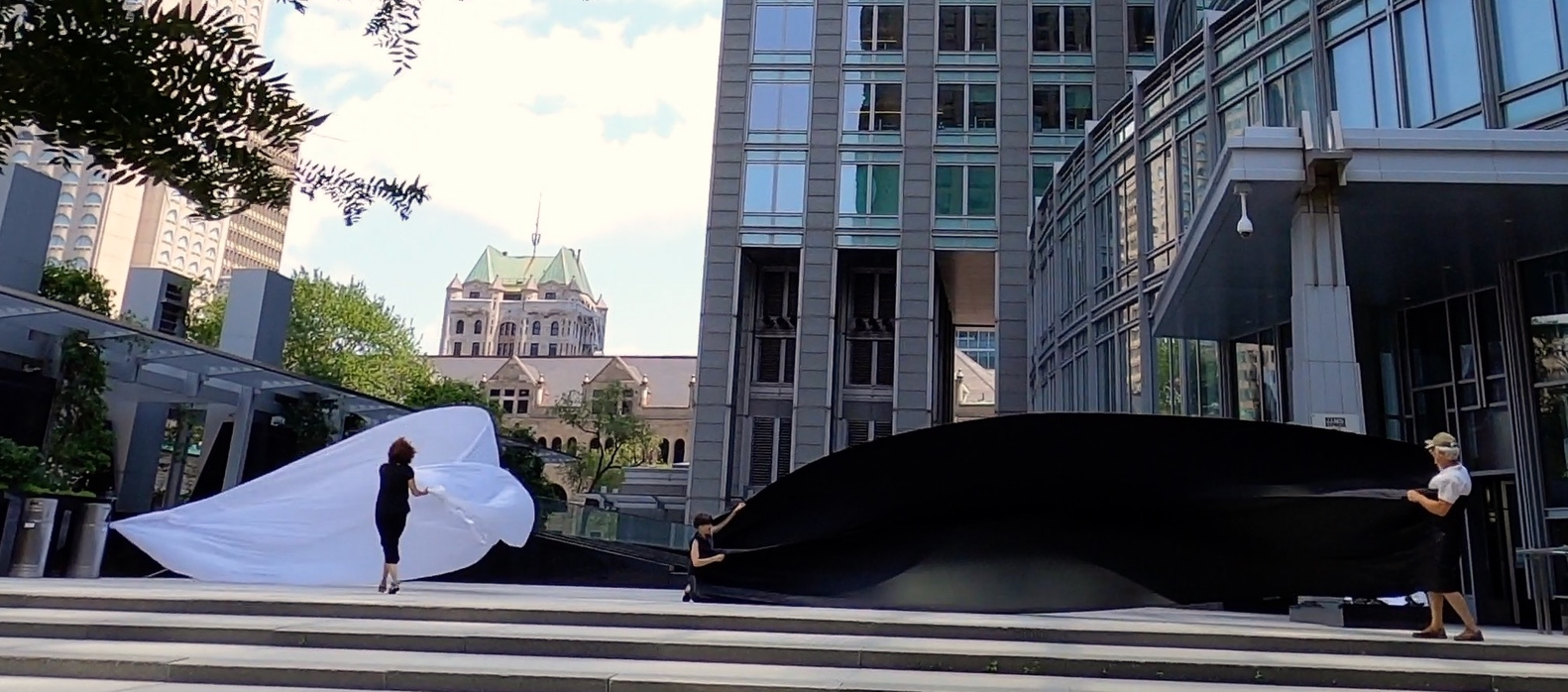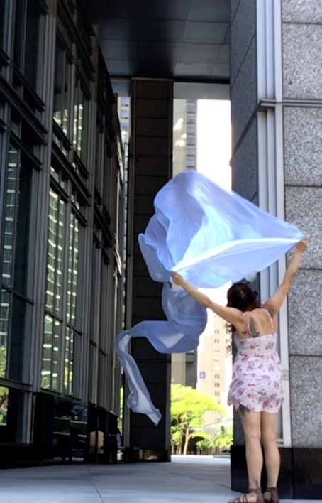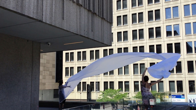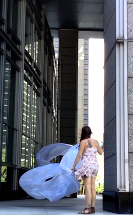 The first thing the nomadic surflines set out to do was to inhabit the city, find a urban territory itching to deterritorialize, sail on its various rhythms, taking the pulse of its flows and turbulences, attempting to liberate its light, modulate its textures, feel its haptic aerial breath, and ephemerally resurface smooth out of its striated spaces. What appeared throughout their journey, in the encounter of fixed and fluctuating matter, was the vital power of urban interstitial thresholds composed in the mutual translation and traversing of striated-smooth space. It brought to life what was imminently there for the making and transforming, in potential future co-compositions. As mutant line-surfaces, the membranes became a formative power of expression, blurring distinctions of exterior and interior. Moving between architectural solids, structures, forms, brushing against or fleetingly clinging to their geometricized, historicized surfaces, molding their topographies just long enough to engender their dissipation, topological involutions. What stood silent and cristalline against the background of inert perspectival forms and framings anchored to seemless horizons seemed to liberate its power of involution in the vortical deviations of the membranes’ ghostly lineings. The force of winds : speeds, accelerations-deceleration, and intensities transformed into rhythms by their assemblage with the massive slowness of striated bodies was the main activator of these topological variations captured by the membranes in their encounter with light. Or perhaps it was the winds that captured the light, and the light, the membranes…or yet again the light resonating in contraction-dilation, cold-heat, dampness-dryness that captured the winds and the winds, the membranes. Regardless, molecular lines of membranes and molar lines of architecture interpenetrated across urban interstices, milieux traversed and transformed each other in a cartography of planes.