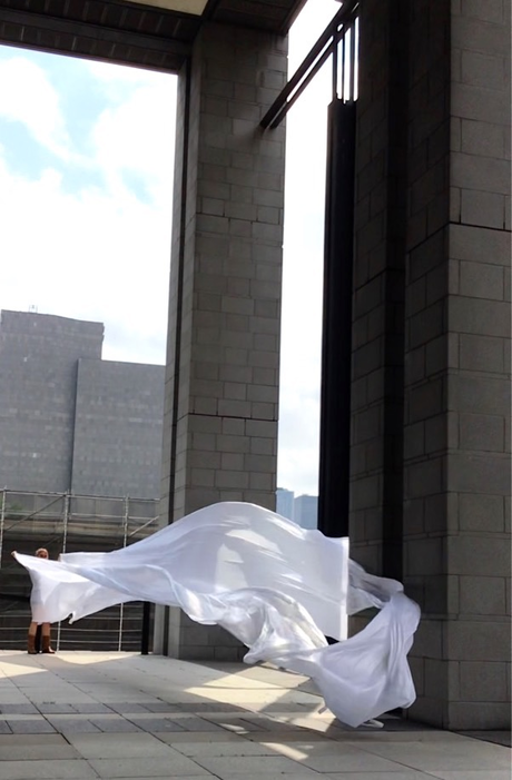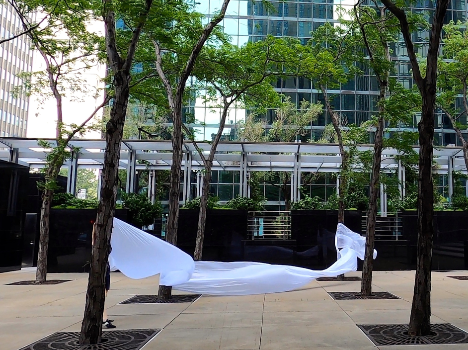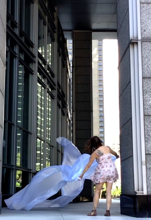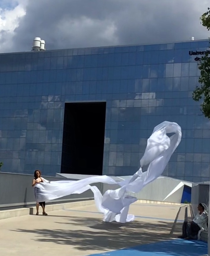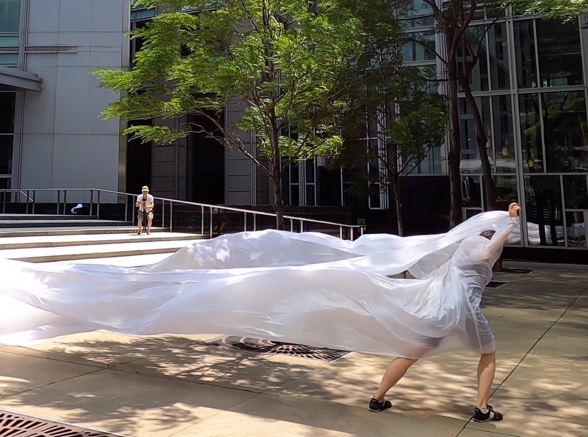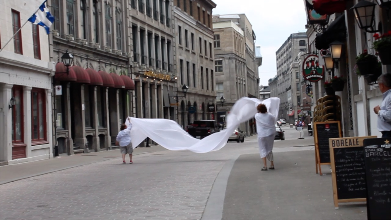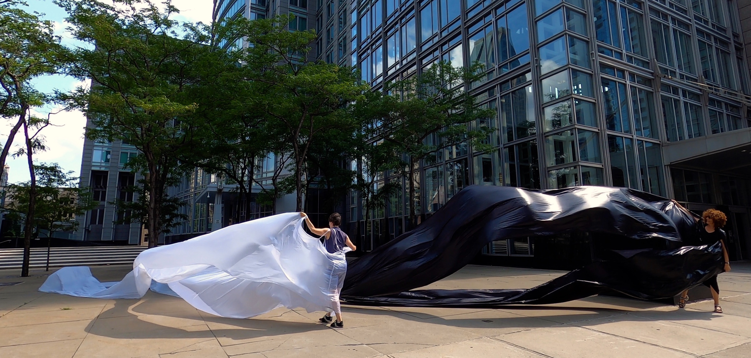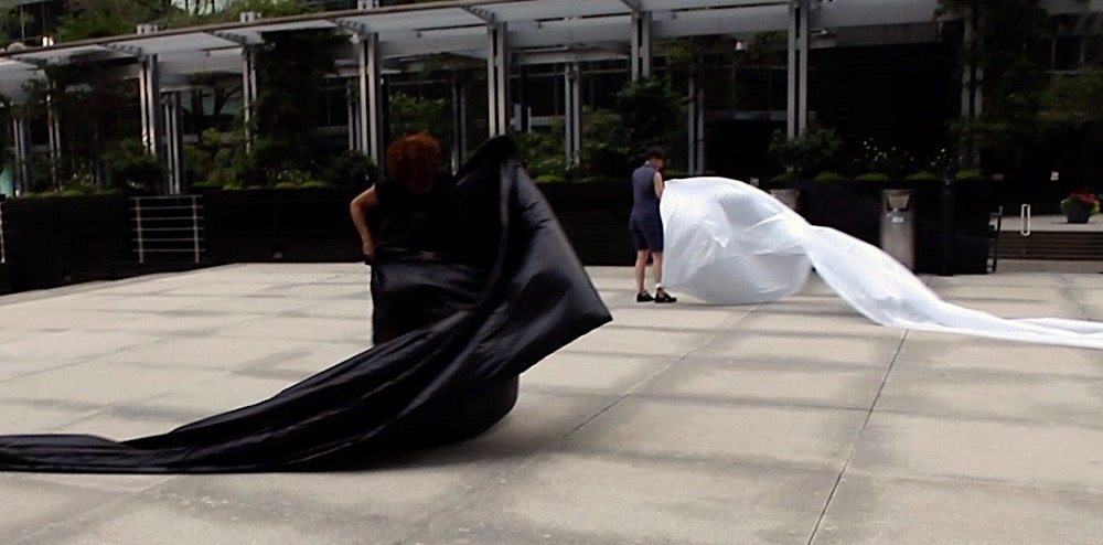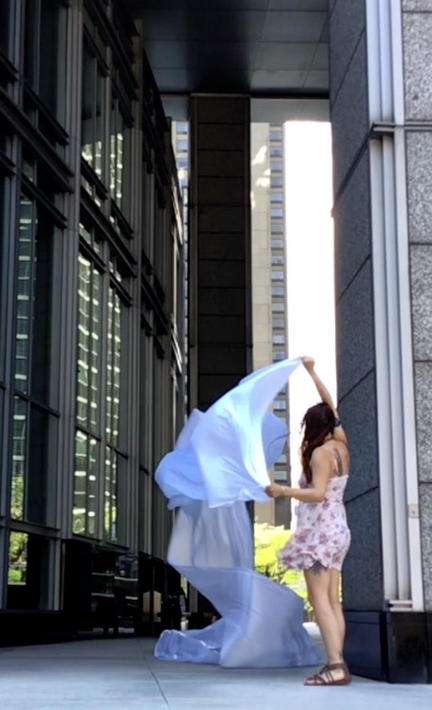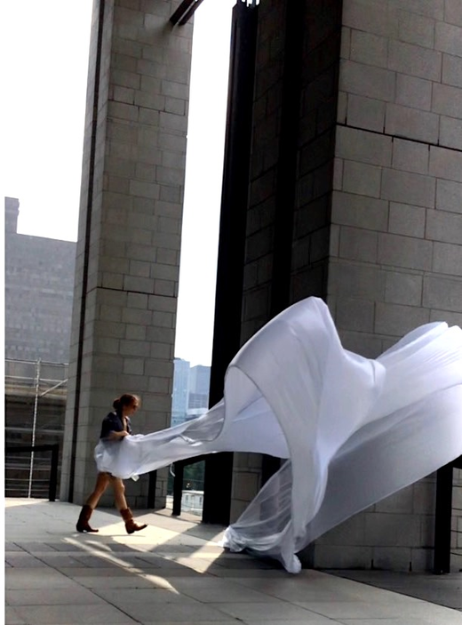 The first thing the nomadic surflines set out to do was to inhabit the city, find a urban territory itching to deterritorialize, sail on its various rhythms, taking the pulse of its flows and turbulences, attempting to liberate its light, modulate its textures, feel its haptic aerial breath, and ephemerally resurface smooth out of its striated spaces. What appeared throughout their journey, in the encounter of fixed and fluctuating matter, was the vital power of urban interstitial thresholds composed in the mutual translation and traversing of striated-smooth space. It brought to life what was imminently there for the making and transforming, in potential future co-compositions. As mutant line-surfaces, the membranes became a formative power of expression, blurring distinctions of exterior and interior. Moving between architectural solids, structures, forms, brushing against or fleetingly clinging to their geometricized, historicized surfaces, molding their topographies just long enough to engender their dissipation, topological involutions. What stood silent and cristalline against the background of inert perspectival forms and framings anchored to seemless horizons seemed to liberate its power of involution in the vortical deviations of the membranes’ ghostly lineings. The force of winds : speeds, accelerations-deceleration, and intensities transformed into rhythms by their assemblage with the massive slowness of striated bodies was the main activator of these topological variations captured by the membranes in their encounter with light. Or perhaps it was the winds that captured the light, and the light, the membranes…or yet again the light resonating in contraction-dilation, cold-heat, dampness-dryness that captured the winds and the winds, the membranes. Regardless, molecular lines of membranes and molar lines of architecture interpenetrated across urban interstices, milieux traversed and transformed each other in a cartography of planes.