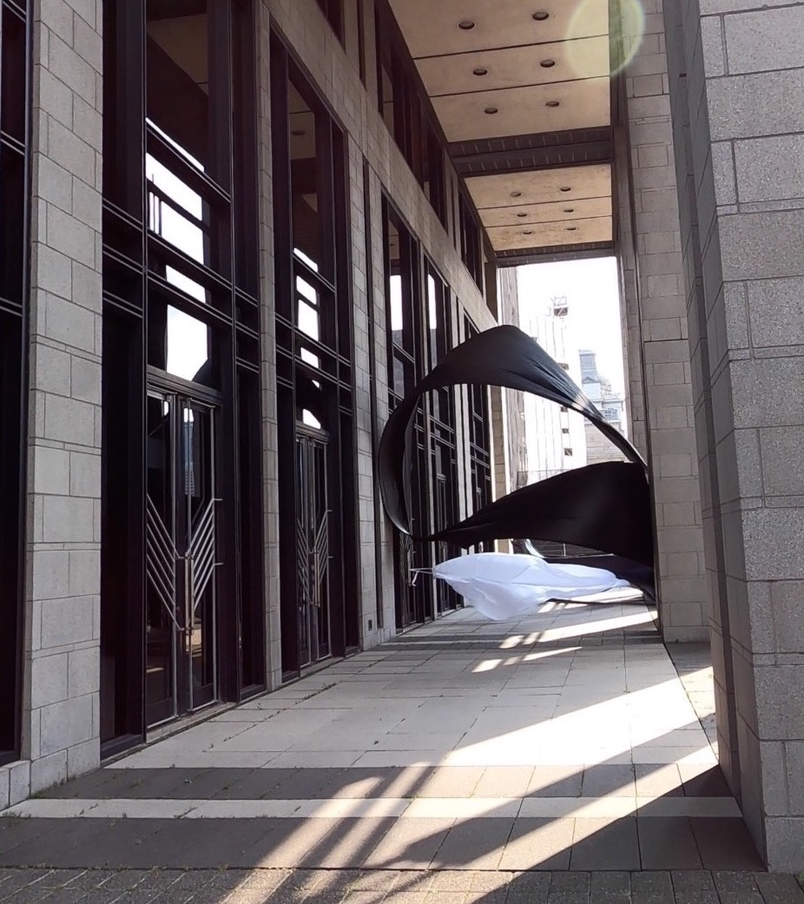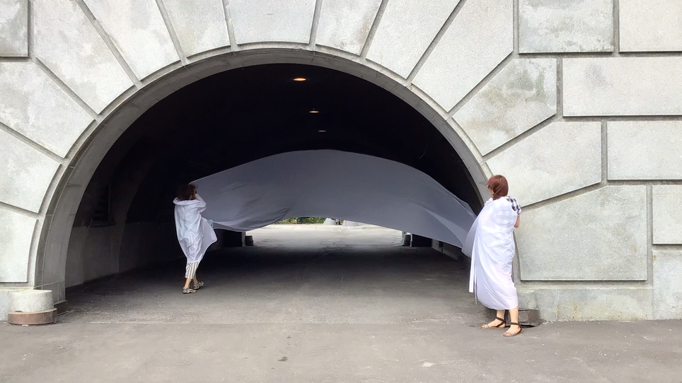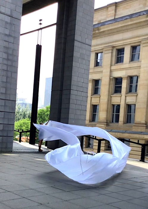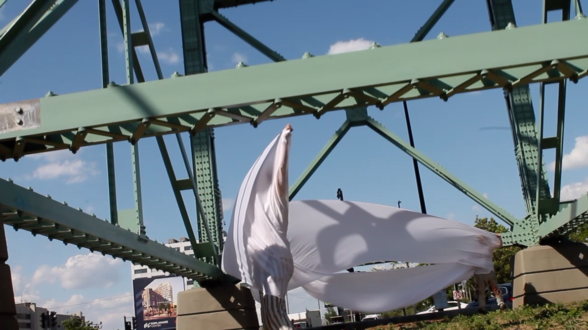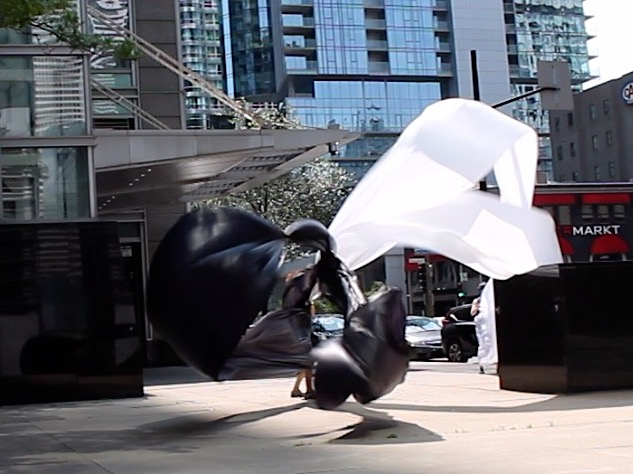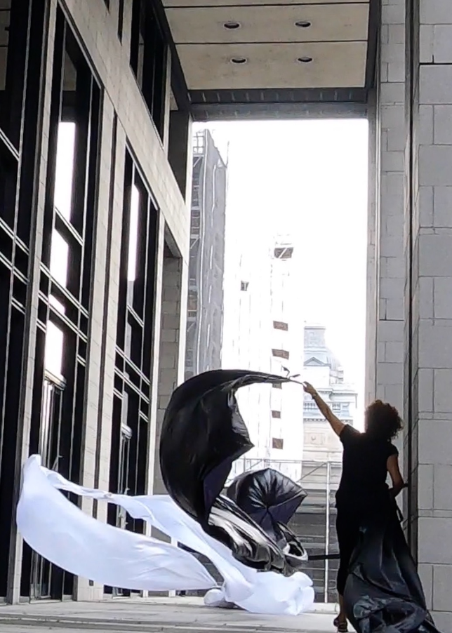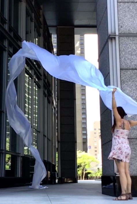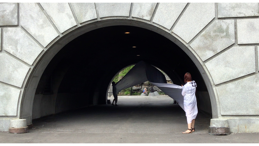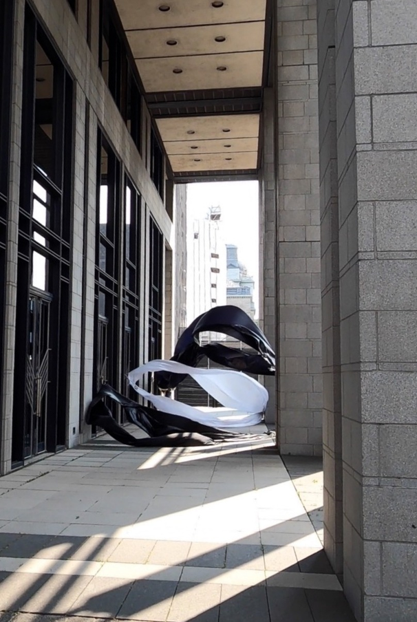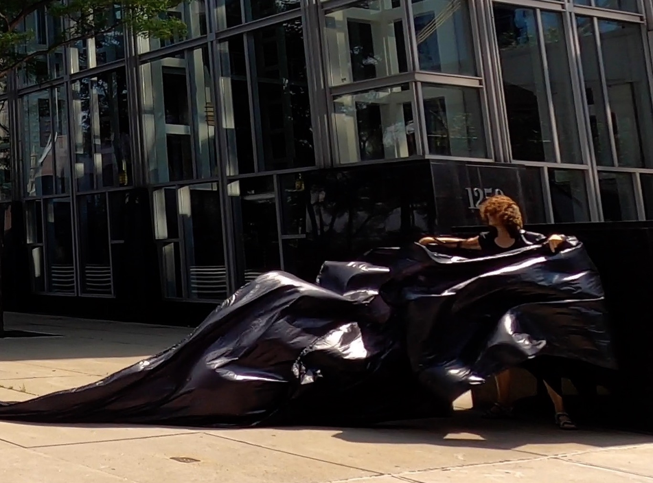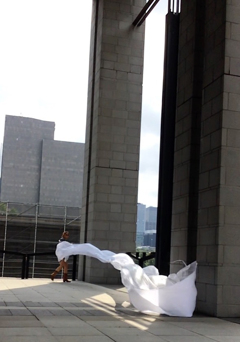 The first thing the nomadic surflines set out to do was to inhabit the city, find a urban territory itching to deterritorialize, sail on its various rhythms, taking the pulse of its flows and turbulences, attempting to liberate its light, modulate its textures, feel its haptic aerial breath, and ephemerally resurface smooth out of its striated spaces. What appeared throughout their journey, in the encounter of fixed and fluctuating matter, was the vital power of urban interstitial thresholds composed in the mutual translation and traversing of striated-smooth space. It brought to life what was imminently there for the making and transforming, in potential future co-compositions. As mutant line-surfaces, the membranes became a formative power of expression, blurring distinctions of exterior and interior. Moving between architectural solids, structures, forms, brushing against or fleetingly clinging to their geometricized, historicized surfaces, molding their topographies just long enough to engender their dissipation, topological involutions. What stood silent and cristalline against the background of inert perspectival forms and framings anchored to seemless horizons seemed to liberate its power of involution in the vortical deviations of the membranes’ ghostly lineings. The force of winds : speeds, accelerations-deceleration, and intensities transformed into rhythms by their assemblage with the massive slowness of striated bodies was the main activator of these topological variations captured by the membranes in their encounter with light. Or perhaps it was the winds that captured the light, and the light, the membranes…or yet again the light resonating in contraction-dilation, cold-heat, dampness-dryness that captured the winds and the winds, the membranes. Regardless, molecular lines of membranes and molar lines of architecture interpenetrated across urban interstices, milieux traversed and transformed each other in a cartography of planes.