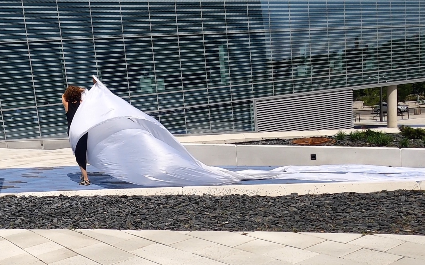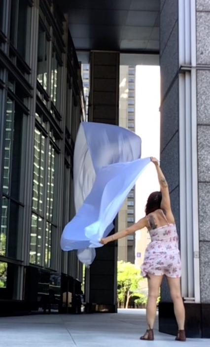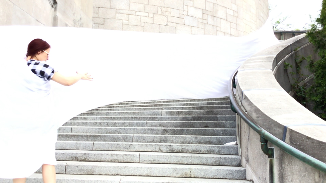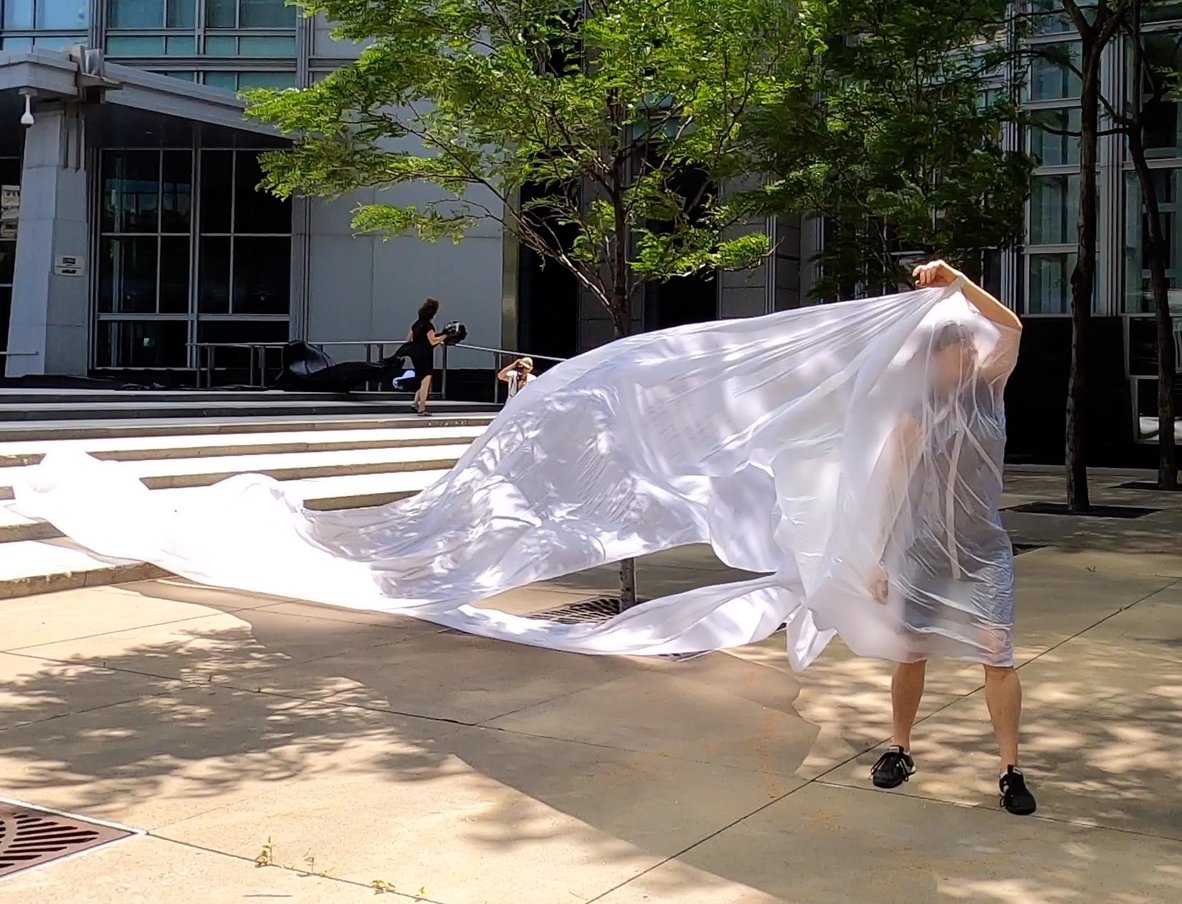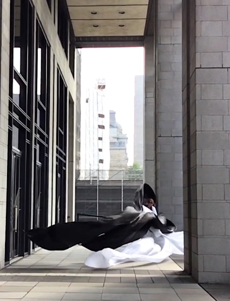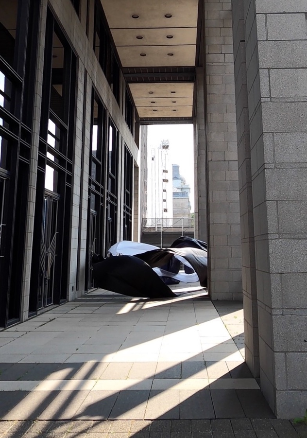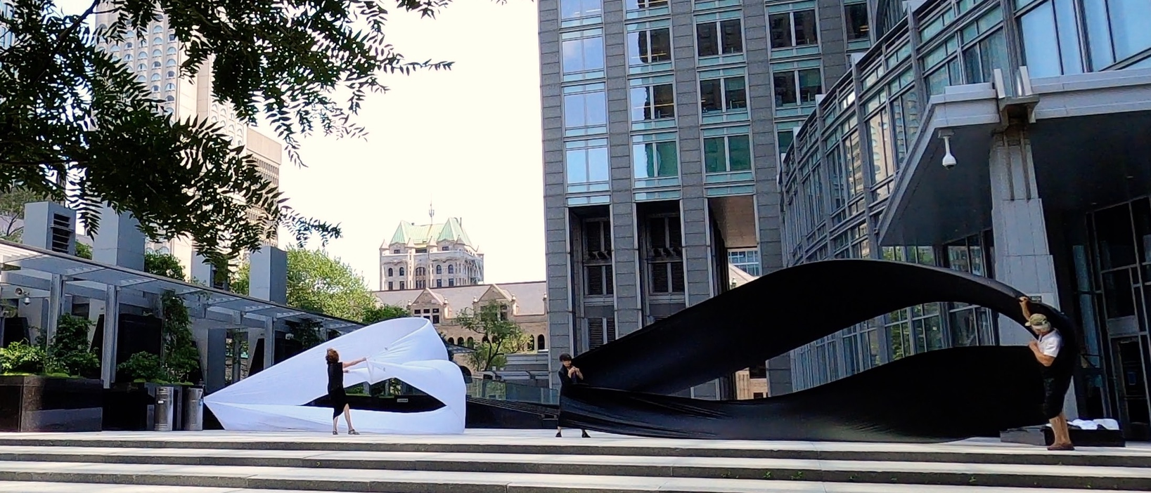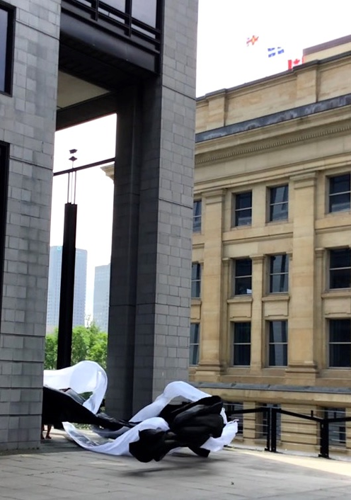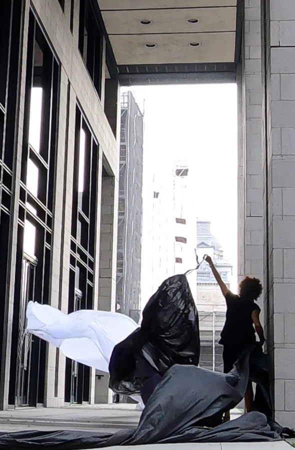 The first thing the nomadic surflines set out to do was to inhabit the city, find a urban territory itching to deterritorialize, sail on its various rhythms, taking the pulse of its flows and turbulences, attempting to liberate its light, modulate its textures, feel its haptic aerial breath, and ephemerally resurface smooth out of its striated spaces. What appeared throughout their journey, in the encounter of fixed and fluctuating matter, was the vital power of urban interstitial thresholds composed in the mutual translation and traversing of striated-smooth space. It brought to life what was imminently there for the making and transforming, in potential future co-compositions. As mutant line-surfaces, the membranes became a formative power of expression, blurring distinctions of exterior and interior. Moving between architectural solids, structures, forms, brushing against or fleetingly clinging to their geometricized, historicized surfaces, molding their topographies just long enough to engender their dissipation, topological involutions. What stood silent and cristalline against the background of inert perspectival forms and framings anchored to seemless horizons seemed to liberate its power of involution in the vortical deviations of the membranes’ ghostly lineings. The force of winds : speeds, accelerations-deceleration, and intensities transformed into rhythms by their assemblage with the massive slowness of striated bodies was the main activator of these topological variations captured by the membranes in their encounter with light. Or perhaps it was the winds that captured the light, and the light, the membranes…or yet again the light resonating in contraction-dilation, cold-heat, dampness-dryness that captured the winds and the winds, the membranes. Regardless, molecular lines of membranes and molar lines of architecture interpenetrated across urban interstices, milieux traversed and transformed each other in a cartography of planes.