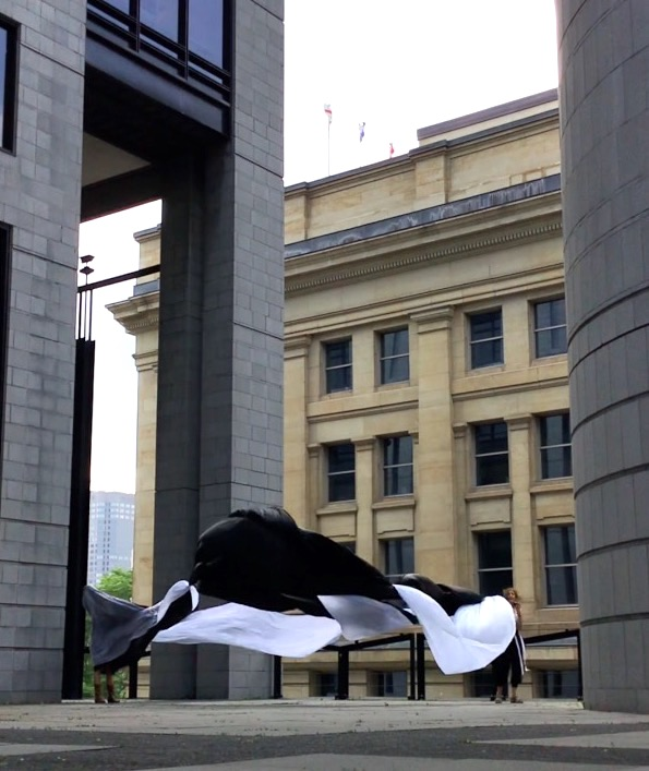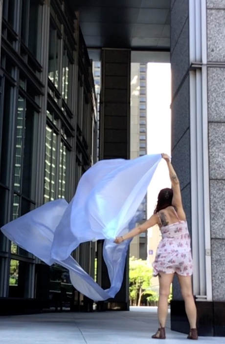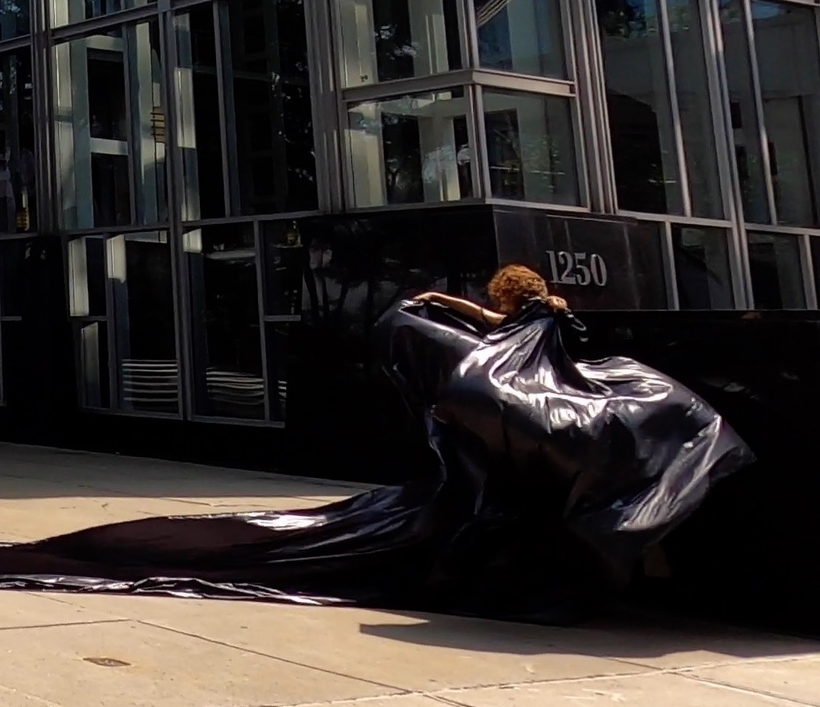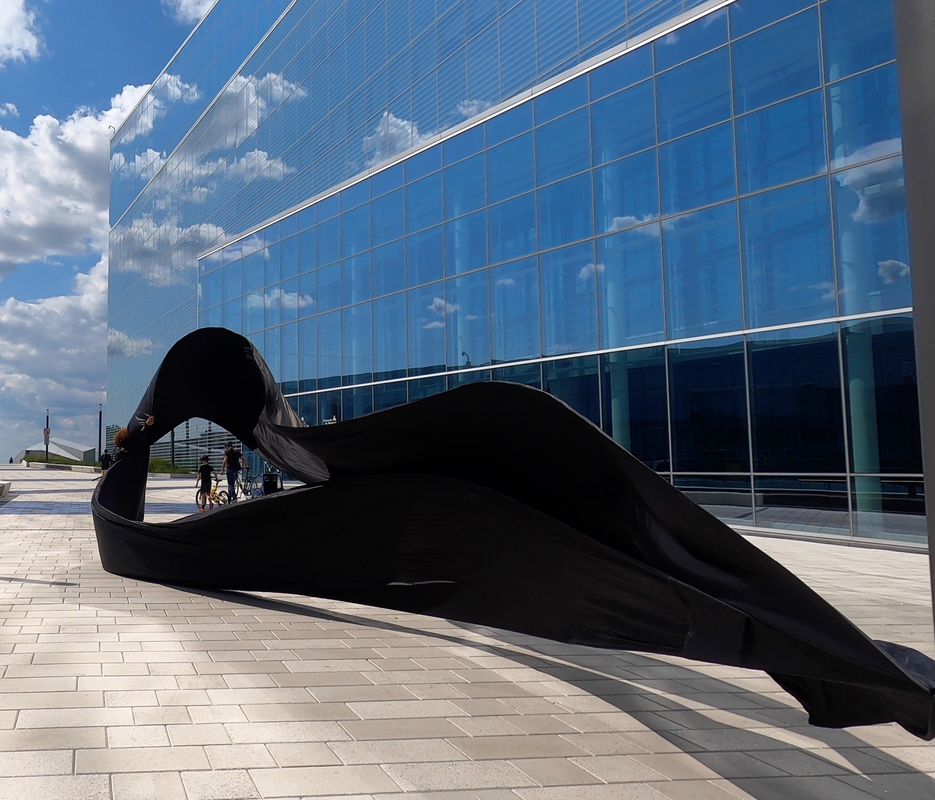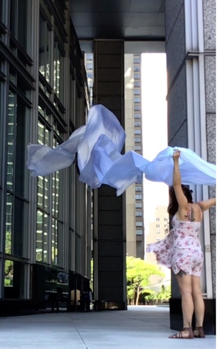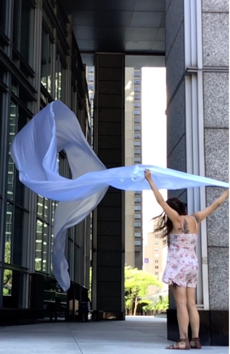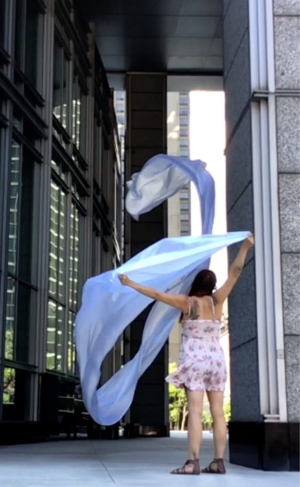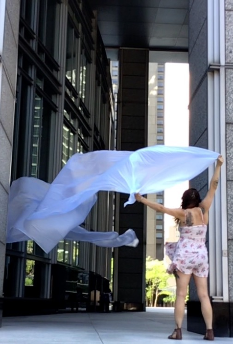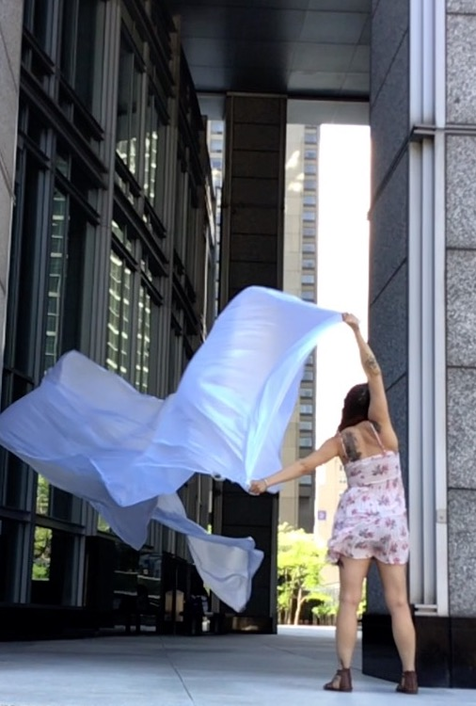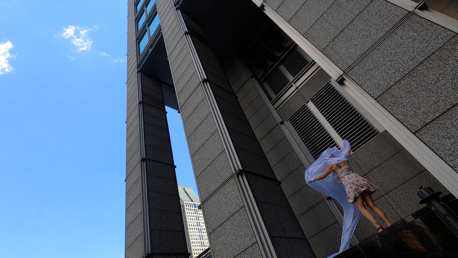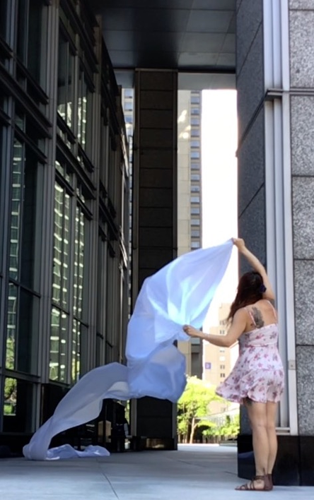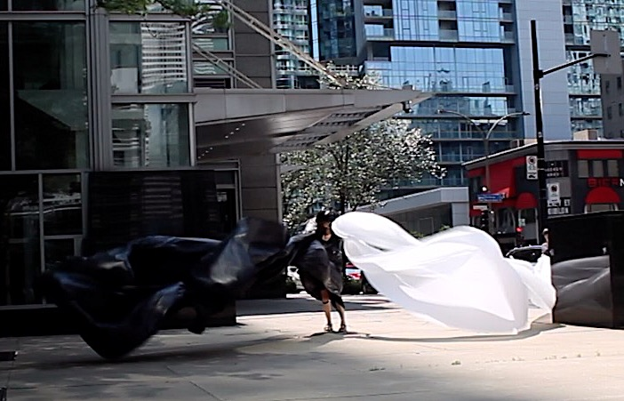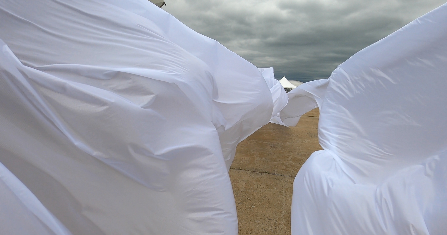 The first thing the nomadic surflines set out to do was to inhabit the city, find a urban territory itching to deterritorialize, sail on its various rhythms, taking the pulse of its flows and turbulences, attempting to liberate its light, modulate its textures, feel its haptic aerial breath, and ephemerally resurface smooth out of its striated spaces. What appeared throughout their journey, in the encounter of fixed and fluctuating matter, was the vital power of urban interstitial thresholds composed in the mutual translation and traversing of striated-smooth space. It brought to life what was imminently there for the making and transforming, in potential future co-compositions. As mutant line-surfaces, the membranes became a formative power of expression, blurring distinctions of exterior and interior. Moving between architectural solids, structures, forms, brushing against or fleetingly clinging to their geometricized, historicized surfaces, molding their topographies just long enough to engender their dissipation, topological involutions. What stood silent and cristalline against the background of inert perspectival forms and framings anchored to seemless horizons seemed to liberate its power of involution in the vortical deviations of the membranes’ ghostly lineings. The force of winds : speeds, accelerations-deceleration, and intensities transformed into rhythms by their assemblage with the massive slowness of striated bodies was the main activator of these topological variations captured by the membranes in their encounter with light. Or perhaps it was the winds that captured the light, and the light, the membranes…or yet again the light resonating in contraction-dilation, cold-heat, dampness-dryness that captured the winds and the winds, the membranes. Regardless, molecular lines of membranes and molar lines of architecture interpenetrated across urban interstices, milieux traversed and transformed each other in a cartography of planes.