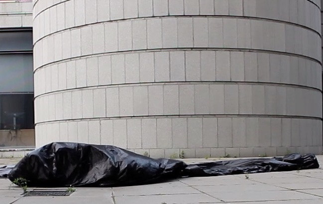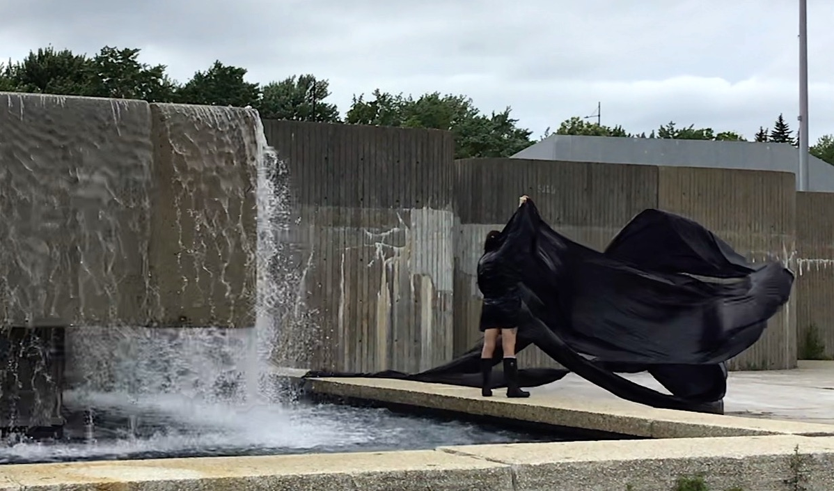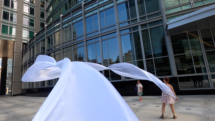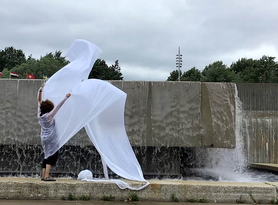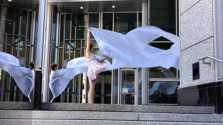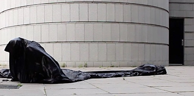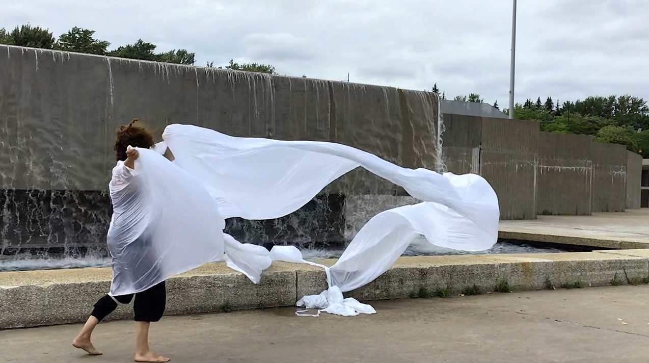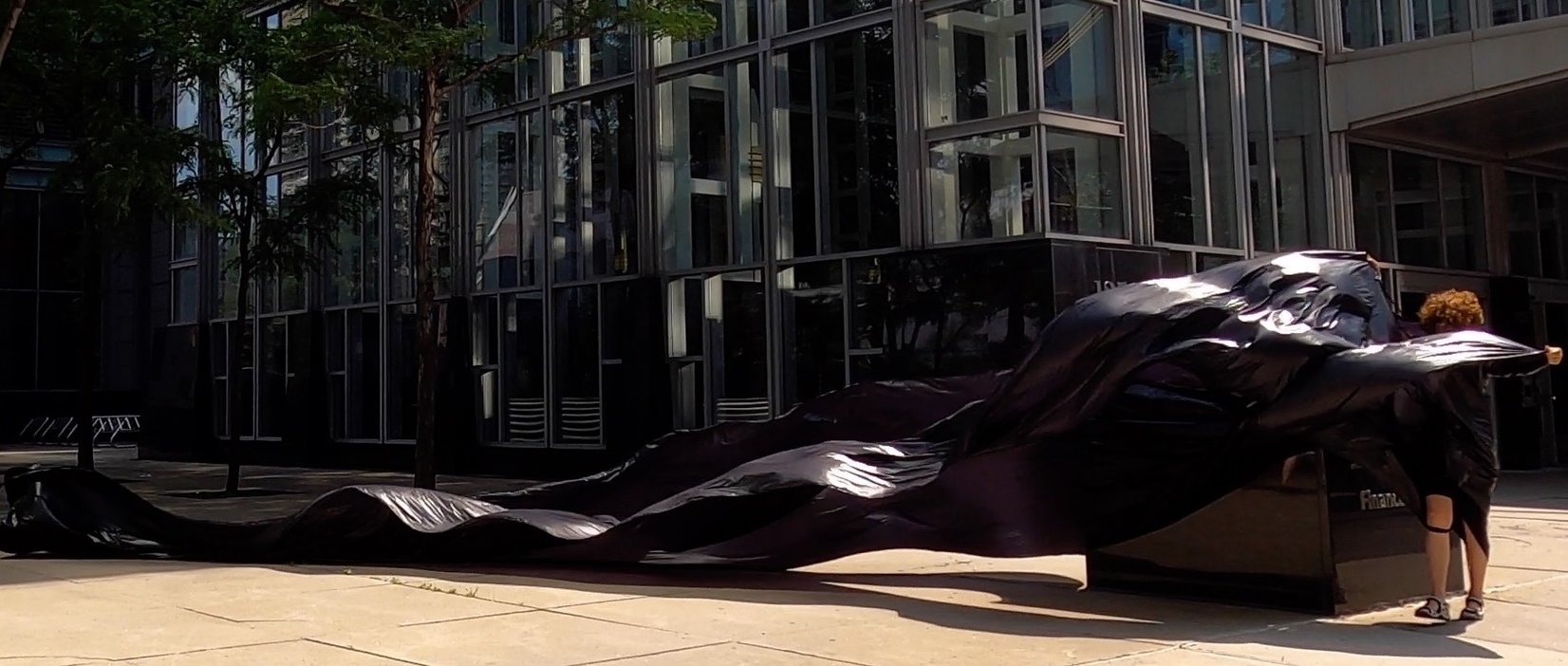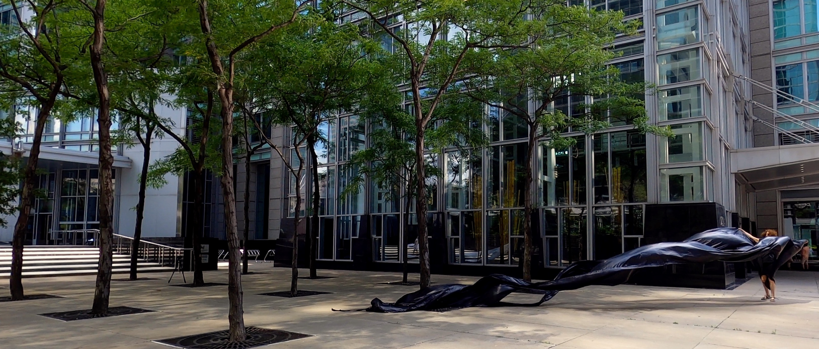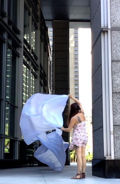 The first thing the nomadic surflines set out to do was to inhabit the city, find a urban territory itching to deterritorialize, sail on its various rhythms, taking the pulse of its flows and turbulences, attempting to liberate its light, modulate its textures, feel its haptic aerial breath, and ephemerally resurface smooth out of its striated spaces. What appeared throughout their journey, in the encounter of fixed and fluctuating matter, was the vital power of urban interstitial thresholds composed in the mutual translation and traversing of striated-smooth space. It brought to life what was imminently there for the making and transforming, in potential future co-compositions. As mutant line-surfaces, the membranes became a formative power of expression, blurring distinctions of exterior and interior. Moving between architectural solids, structures, forms, brushing against or fleetingly clinging to their geometricized, historicized surfaces, molding their topographies just long enough to engender their dissipation, topological involutions. What stood silent and cristalline against the background of inert perspectival forms and framings anchored to seemless horizons seemed to liberate its power of involution in the vortical deviations of the membranes’ ghostly lineings. The force of winds : speeds, accelerations-deceleration, and intensities transformed into rhythms by their assemblage with the massive slowness of striated bodies was the main activator of these topological variations captured by the membranes in their encounter with light. Or perhaps it was the winds that captured the light, and the light, the membranes…or yet again the light resonating in contraction-dilation, cold-heat, dampness-dryness that captured the winds and the winds, the membranes. Regardless, molecular lines of membranes and molar lines of architecture interpenetrated across urban interstices, milieux traversed and transformed each other in a cartography of planes.
