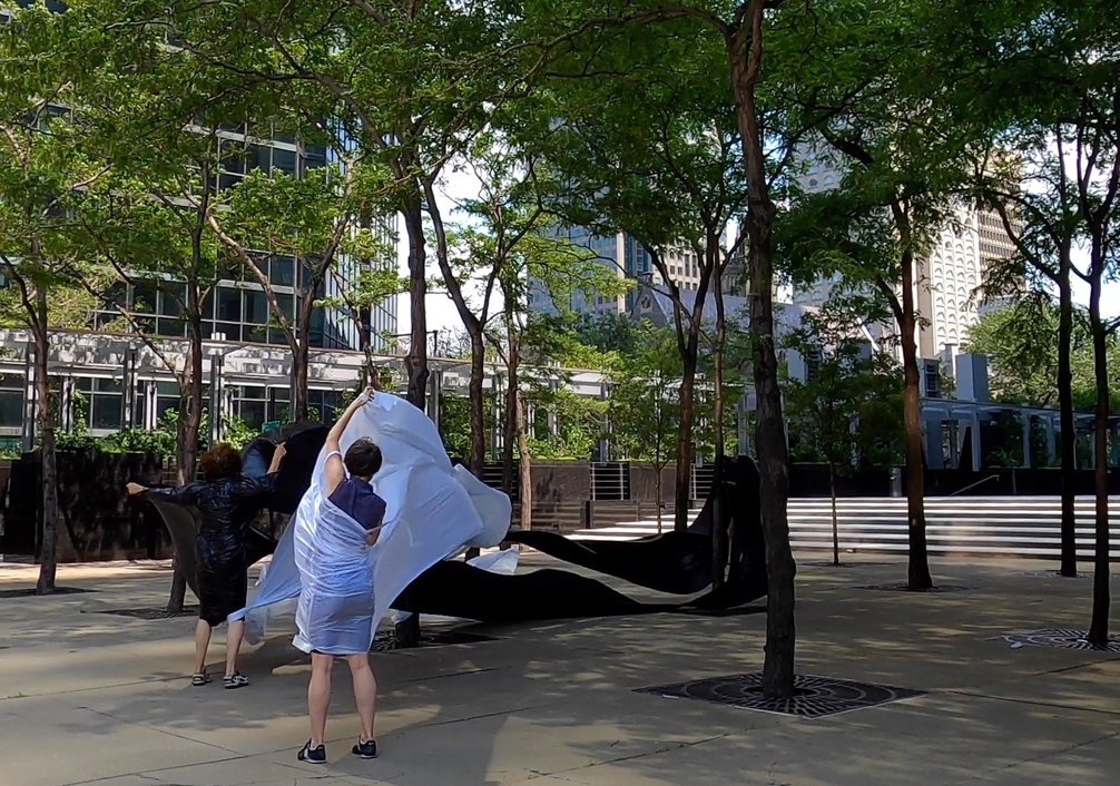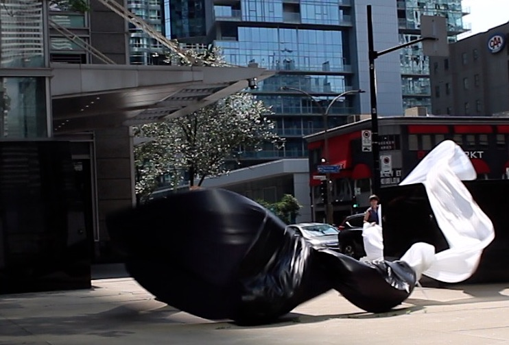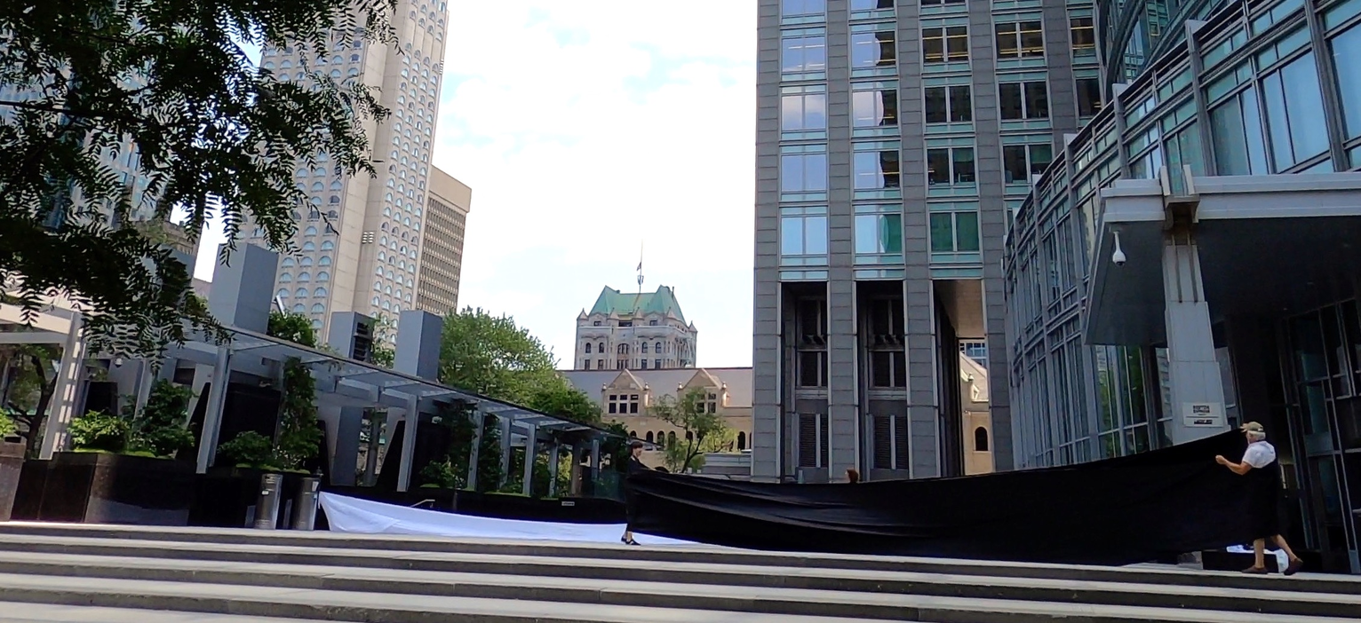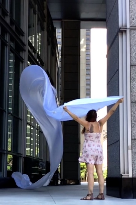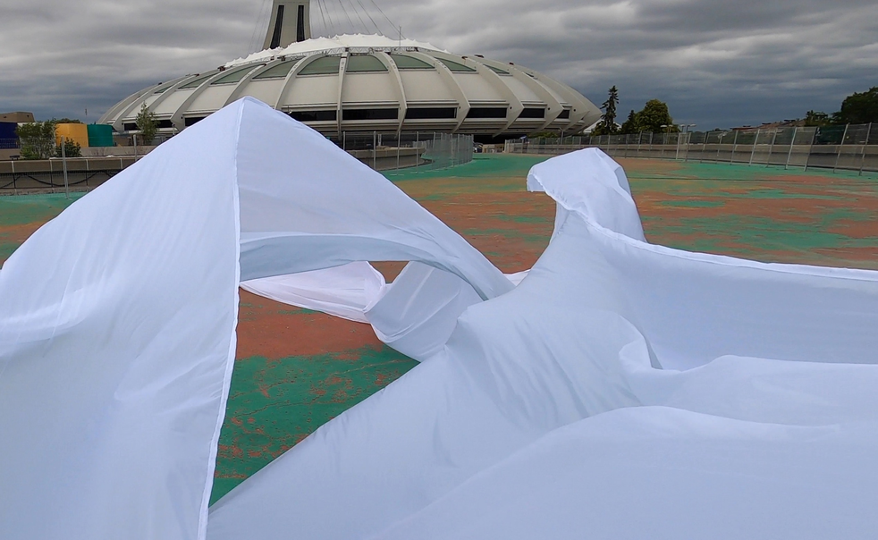 The first thing the nomadic surflines set out to do was to inhabit the city, find a urban territory itching to deterritorialize, sail on its various rhythms, taking the pulse of its flows and turbulences, attempting to liberate its light, modulate its textures, feel its haptic aerial breath, and ephemerally resurface smooth out of its striated spaces. What appeared throughout their journey, in the encounter of fixed and fluctuating matter, was the vital power of urban interstitial thresholds composed in the mutual translation and traversing of striated-smooth space. It brought to life what was imminently there for the making and transforming, in potential future co-compositions. As mutant line-surfaces, the membranes became a formative power of expression, blurring distinctions of exterior and interior. Moving between architectural solids, structures, forms, brushing against or fleetingly clinging to their geometricized, historicized surfaces, molding their topographies just long enough to engender their dissipation, topological involutions. What stood silent and cristalline against the background of inert perspectival forms and framings anchored to seemless horizons seemed to liberate its power of involution in the vortical deviations of the membranes’ ghostly lineings. The force of winds : speeds, accelerations-deceleration, and intensities transformed into rhythms by their assemblage with the massive slowness of striated bodies was the main activator of these topological variations captured by the membranes in their encounter with light. Or perhaps it was the winds that captured the light, and the light, the membranes…or yet again the light resonating in contraction-dilation, cold-heat, dampness-dryness that captured the winds and the winds, the membranes. Regardless, molecular lines of membranes and molar lines of architecture interpenetrated across urban interstices, milieux traversed and transformed each other in a cartography of planes.