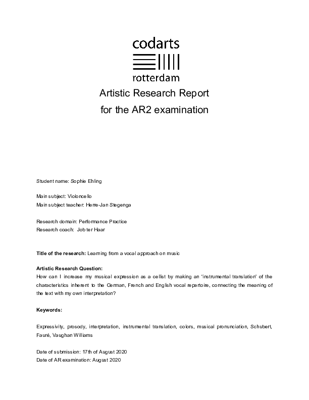 When we speak, there is rhythm, intonation and expression in the words that we choose. When we sing, a melody is added, the story surrounded by musical context. When I play the cello, I can express feelings, thoughts and stories without using any words. I based my research on the relation between language and music, because I wanted to know how to be more expressive in my cello playing. Singers have the text to guide them into making clear what the story is about. As instrumentalists, we might not use words during a performance, but we can definitely learn from involving vocal elements into our approach to music. That is why I consulted experts in the German, French and English language, as well as singers and cellists, to guide me in my process of making an ‘instrumental translation’ of vocal repertoire, in order to broaden my spectrum of possibilities to be expressive. Based on the results of desk research, text and score analysis, interviews and work sessions with the experts and experimentation on the cello, I made a comparison that led me towards the final result, recording the third movement of César Franck’s sonata, a piece in which I could put a lot of the new things that I had learned. I hope that this research can assist anyone who is looking for a way to become more ‘outspoken’ in their instrumental playing, and to stimulate instrumentalists to always stay open for new ways to interpret a piece.