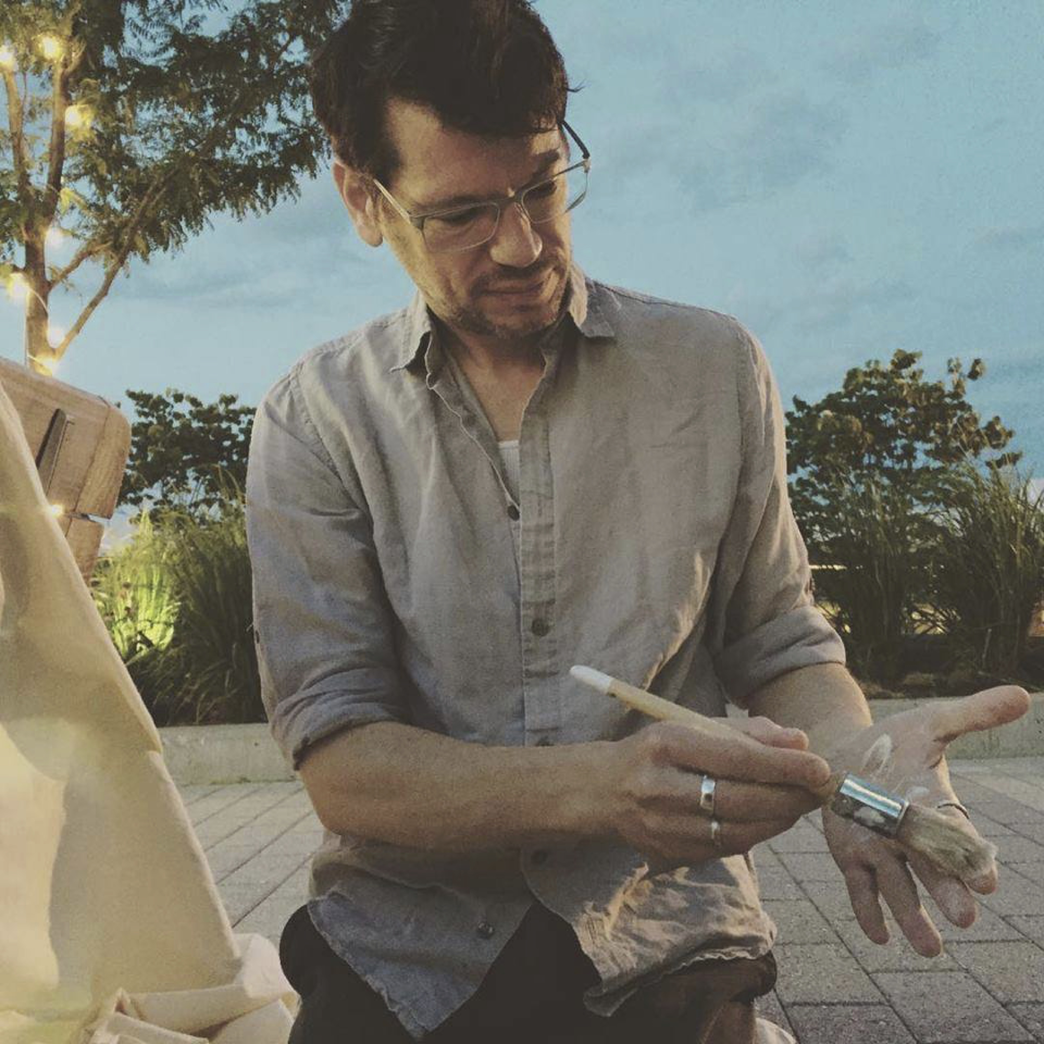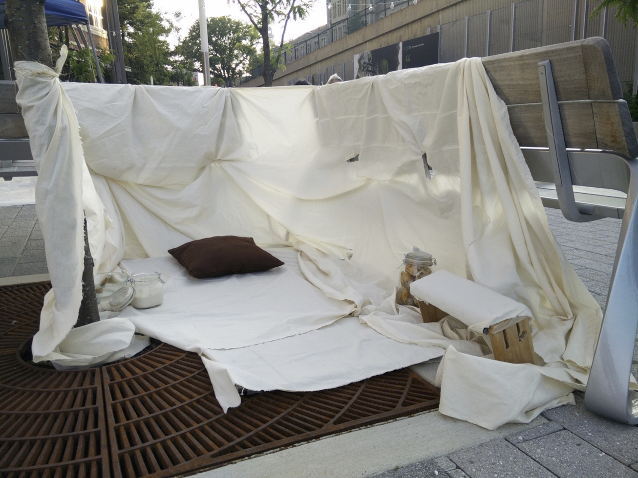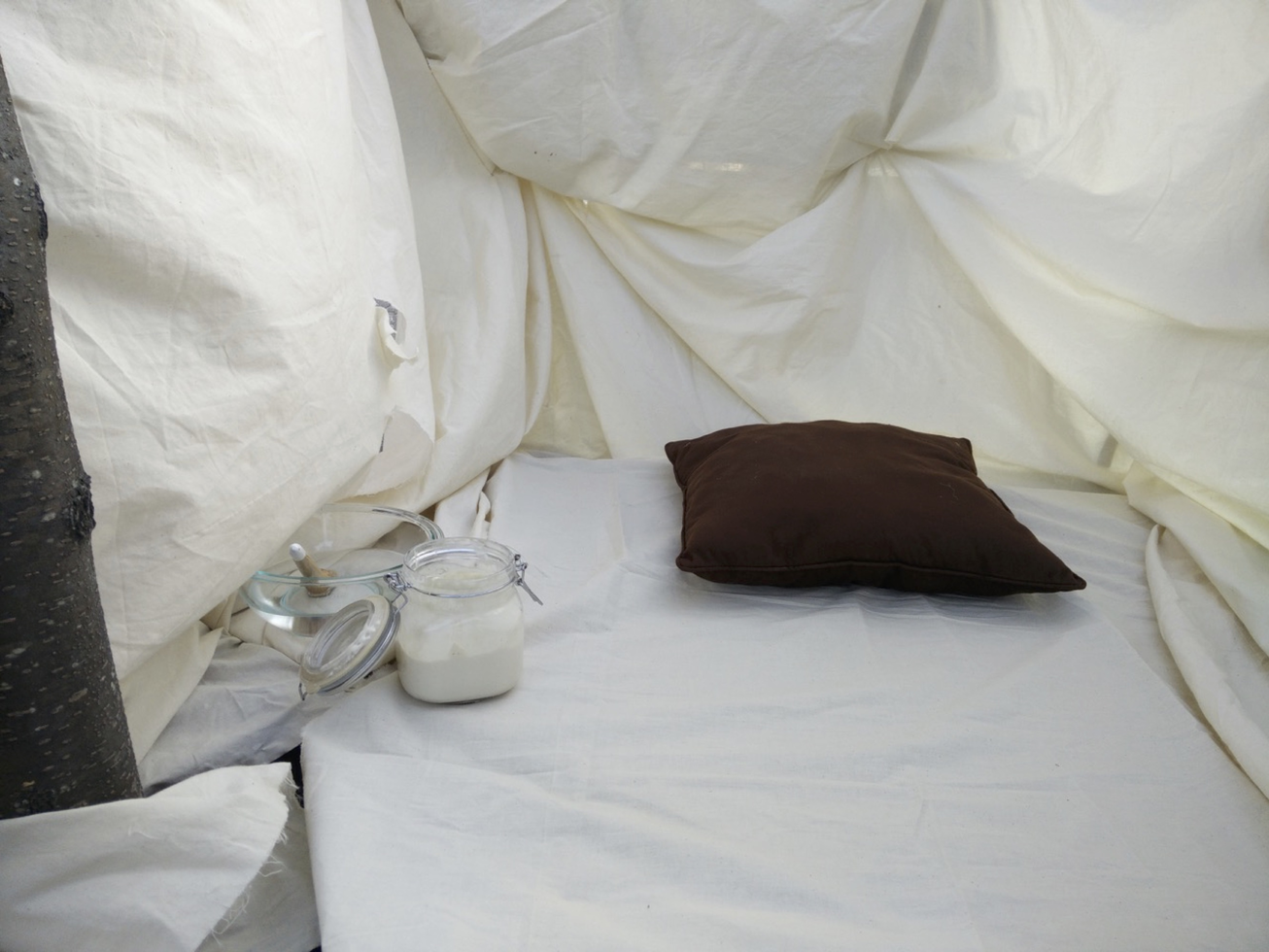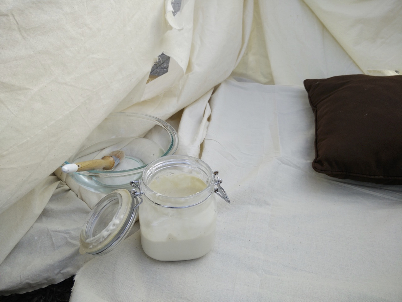 The second iteration of GIY was produced at Capital Fringe, an arts festival that spanned numerous locations in Washington DC during July 2015. Over the course of a ten-day run, I gave up to thirty-five nightly one-on-one micro-performances. The score addressed Gigi and his anti-bullshit attitude when it came to food, as well as the dynamic exchanges that constitute human microbiomes and thus our very existence. The material aspects of my staging, however, evoked the co-nurturing relationship of humans, food, space, and environment. A nest-like shelter of canvas, cushions, and cord formed a stage that was both private and public, intimate enough for a quiet story and yet open to the public square around it. Smelling a large glass jar loaded with pieces of bread made with Gigi’s starter began each performance. This was followed by a prompt that the audience-participant eat a small piece. As they chewed and listened, I recounted Gigi’s love of coffee and calcio (football) and enacted some of his distinctive gestures. I rubbed the skin of my forearms and spoke of the microbes living in and on us; I invoked the co-creation of life by human and non-human beings. Then, as I spoke about Gigi’s eventual death, I painted my palm with the sticky yeast paste and held it toward the person in front of me. In all but one case, the audience member allowed me to clasp their hand in mine, creating a haptic, material, and affective bond—and a direct transfer of the starter’s Gigi-ness onto their skin. As a final gesture, I invited each participant to wipe their now slightly crusty hand on the canvas wall around us, layering a mixed microbial print onto the surrounding environment.