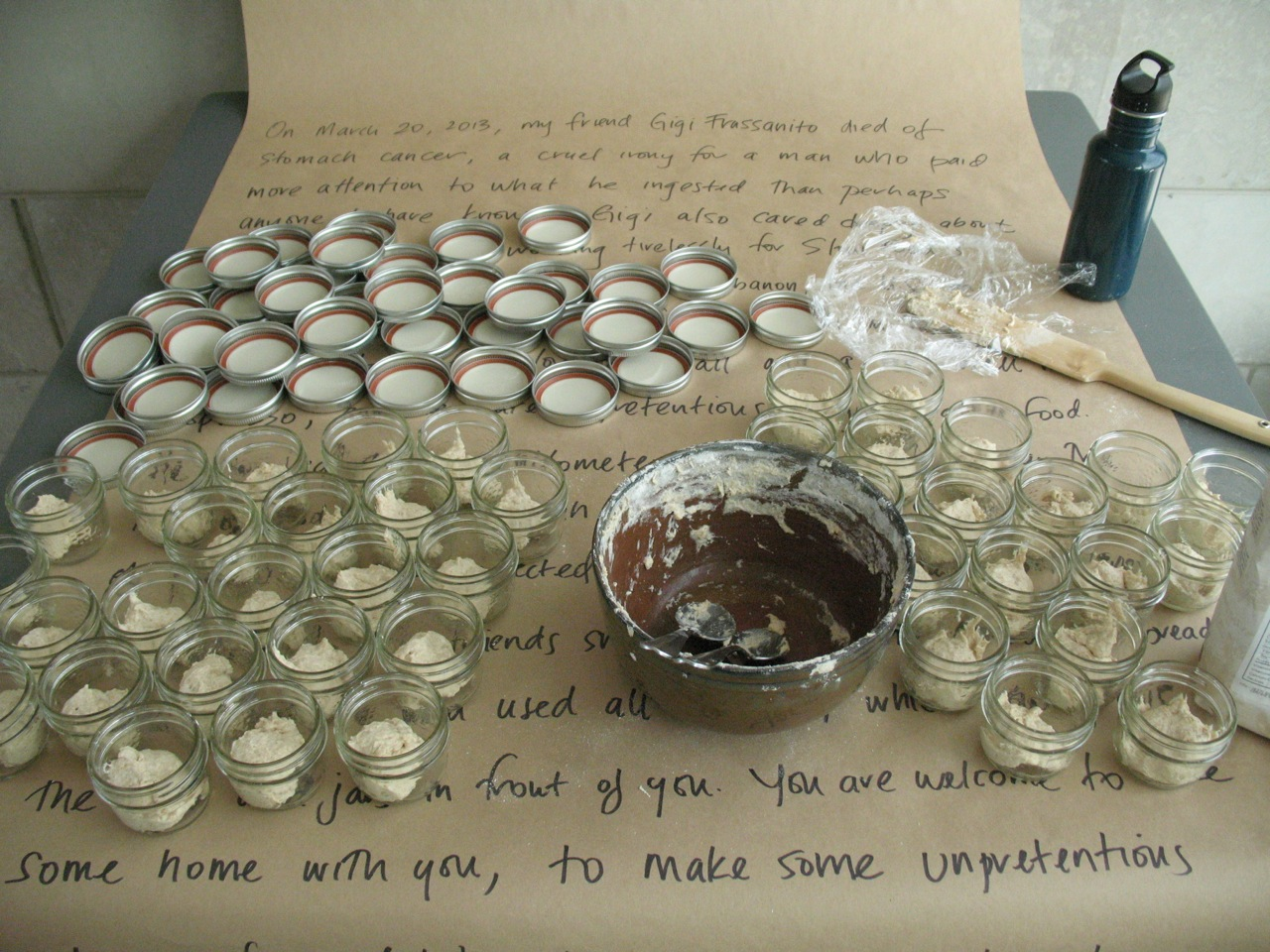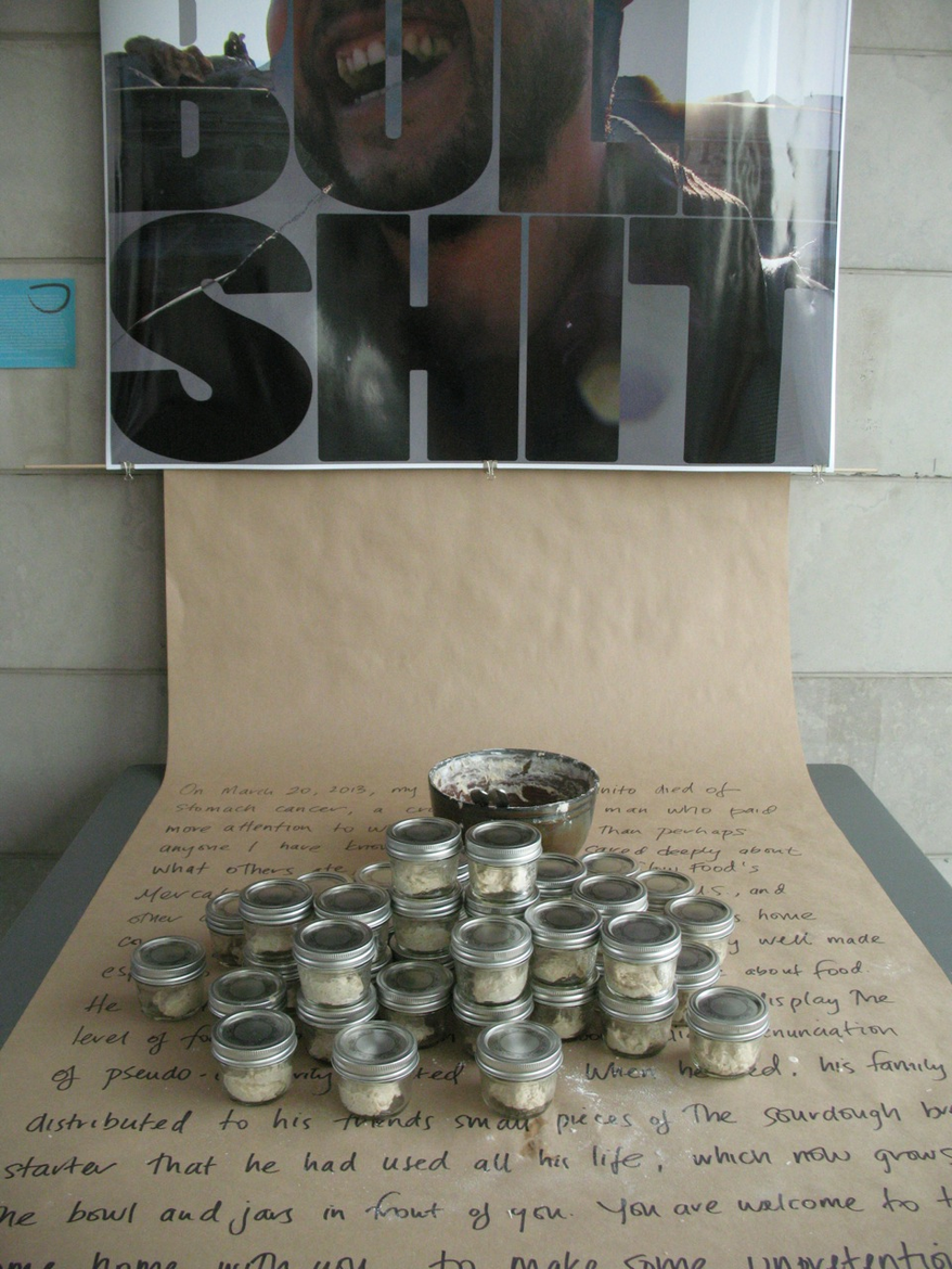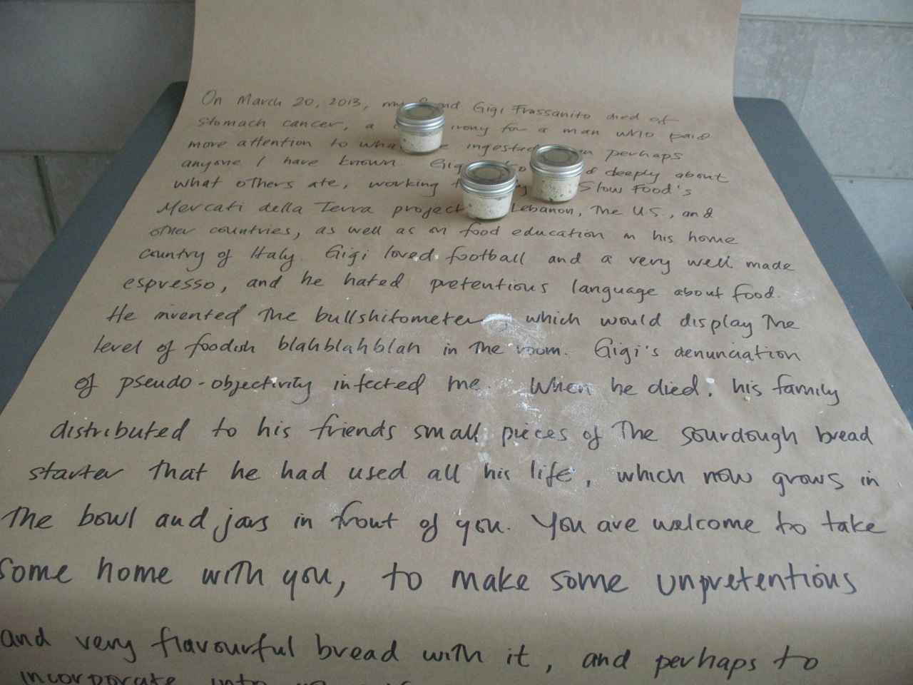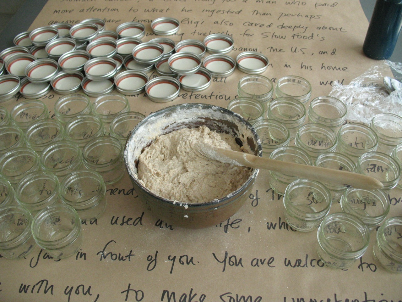 The first iteration of GIY took the form of an installation and performance within the Exploration Gallery of the 2014 conference of the Canadian Association for Food Studies at Brock University in St. Catharines, ON. It focused on the gastronomic integrity and energy of Gigi Frassanito, a friend and colleague who had died of stomach cancer the previous year. His twenty-year-old sourdough yeast culture (distributed to friends and family at his memorial service), served as the starting point for this work. Over the course of three days, I propagated a small sample of the culture into a large, lively, aromatic mass. During this time, I tended to the flour, yeast, and water a few times a day, checking the humidity, ensuring the microbial community had enough to eat, and documenting my movements in time-lapse imagery. I felt, at times, as if I were tending Gigi’s gravesite, trimming grass and flicking away pebbles, but also caring for new life, a midwife to Gigi’s offspring. By the third day, the gallery space smelled both sour and sweet—that unique aroma of fermenting complex sugars that stimulates salivary glands and reminds bread makers of the life-death cycles inherent to collaborations with yeast. The embryonic lump of starter that I had brought with me was now many dozens of times larger, bubbling and burping like a giddy newborn. I divided the mass into seventy small mason jars and then left them available for collection by the conference participants. In so doing, my intent was to have the ‘audience’ of this work incorporate both the starter (in the eventual form of bread) and the humanism of my late friend (through absorption of my story about him). Gigi’s own bodily yeast cells, having in life been in continual exchange with those in the sourdough culture, thus became agents of his continued existence.