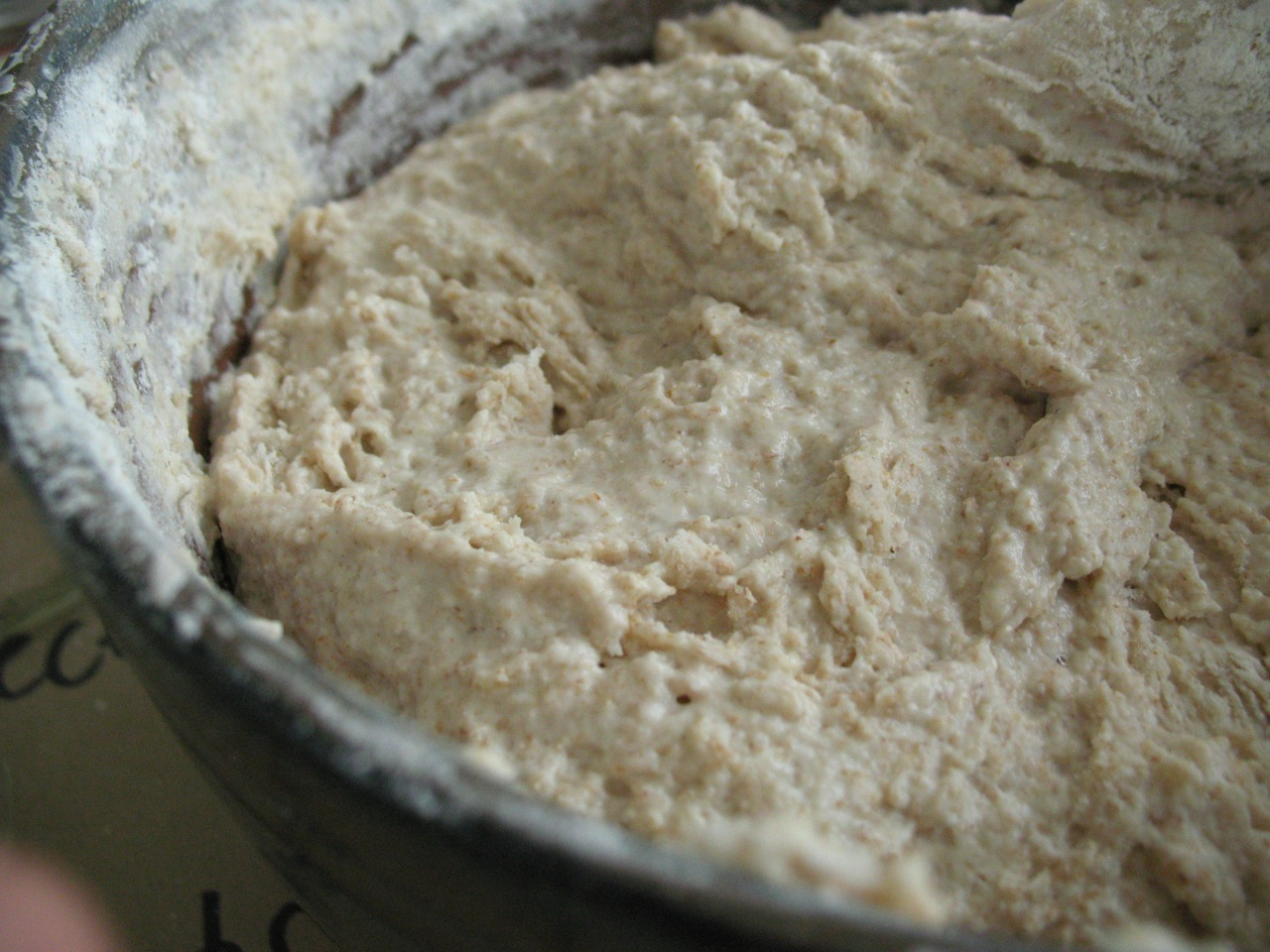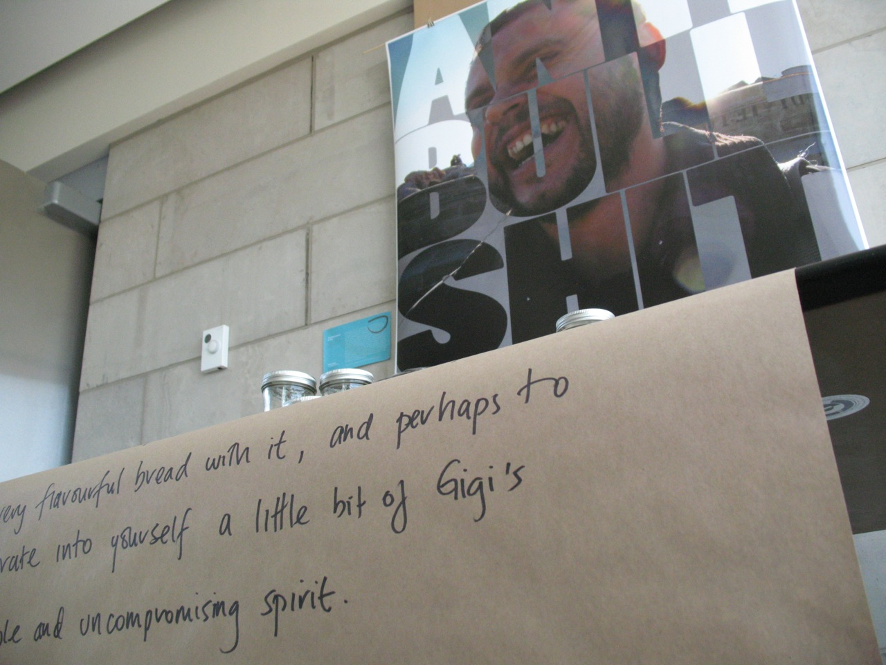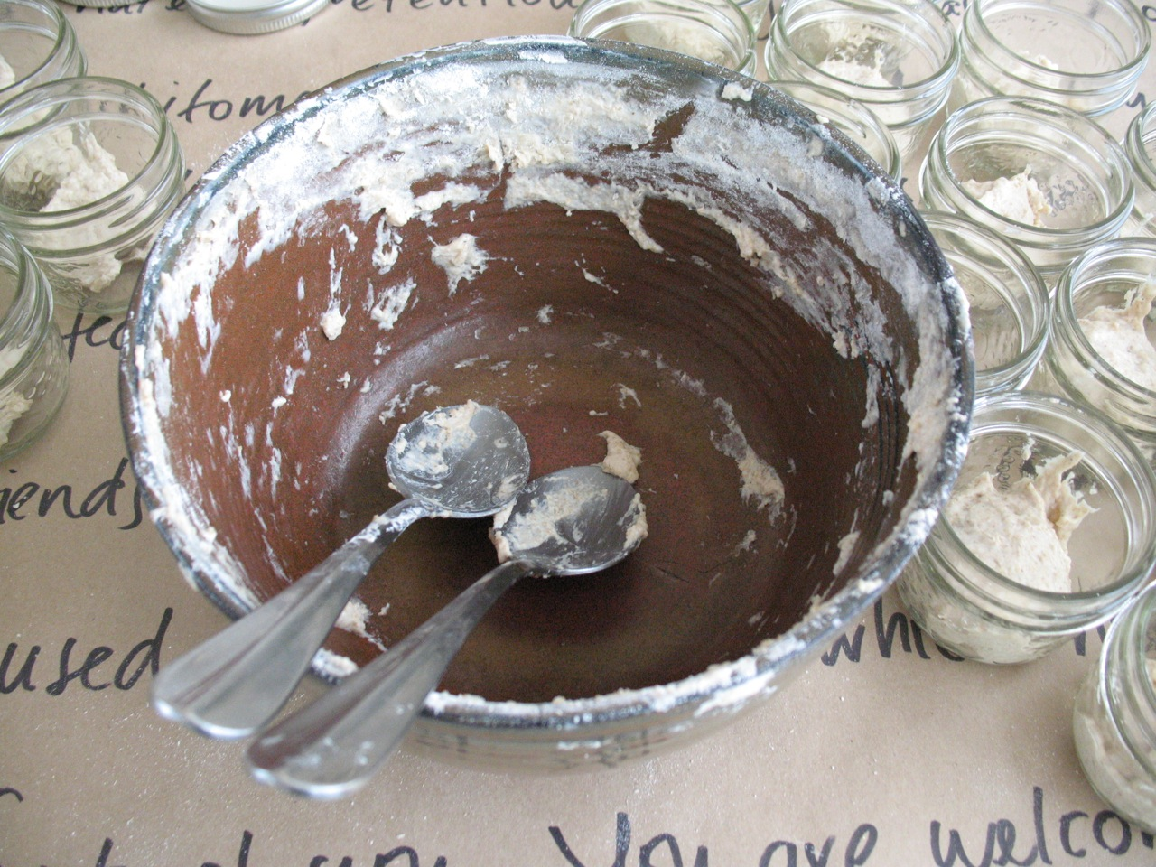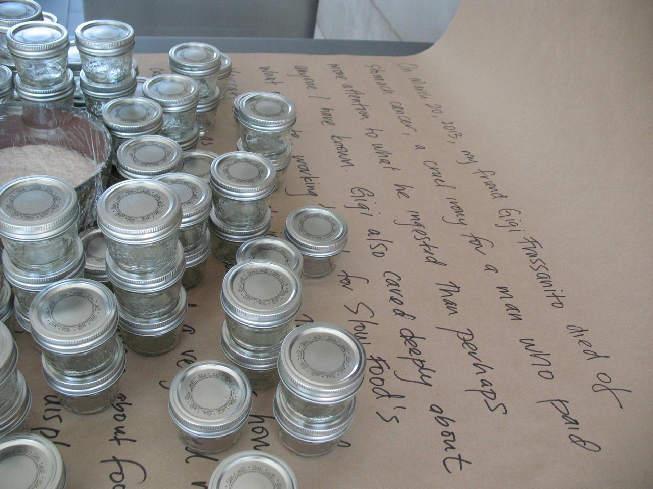 The first iteration of GIY took the form of an installation and performance within the Exploration Gallery of the 2014 conference of the Canadian Association for Food Studies at Brock University in St. Catharines, ON. It focused on the gastronomic integrity and energy of Gigi Frassanito, a friend and colleague who had died of stomach cancer the previous year. His twenty-year-old sourdough yeast culture (distributed to friends and family at his memorial service), served as the starting point for this work. Over the course of three days, I propagated a small sample of the culture into a large, lively, aromatic mass. During this time, I tended to the flour, yeast, and water a few times a day, checking the humidity, ensuring the microbial community had enough to eat, and documenting my movements in time-lapse imagery. I felt, at times, as if I were tending Gigi’s gravesite, trimming grass and flicking away pebbles, but also caring for new life, a midwife to Gigi’s offspring. By the third day, the gallery space smelled both sour and sweet—that unique aroma of fermenting complex sugars that stimulates salivary glands and reminds bread makers of the life-death cycles inherent to collaborations with yeast. The embryonic lump of starter that I had brought with me was now many dozens of times larger, bubbling and burping like a giddy newborn. I divided the mass into seventy small mason jars and then left them available for collection by the conference participants. In so doing, my intent was to have the ‘audience’ of this work incorporate both the starter (in the eventual form of bread) and the humanism of my late friend (through absorption of my story about him). Gigi’s own bodily yeast cells, having in life been in continual exchange with those in the sourdough culture, thus became agents of his continued existence.
