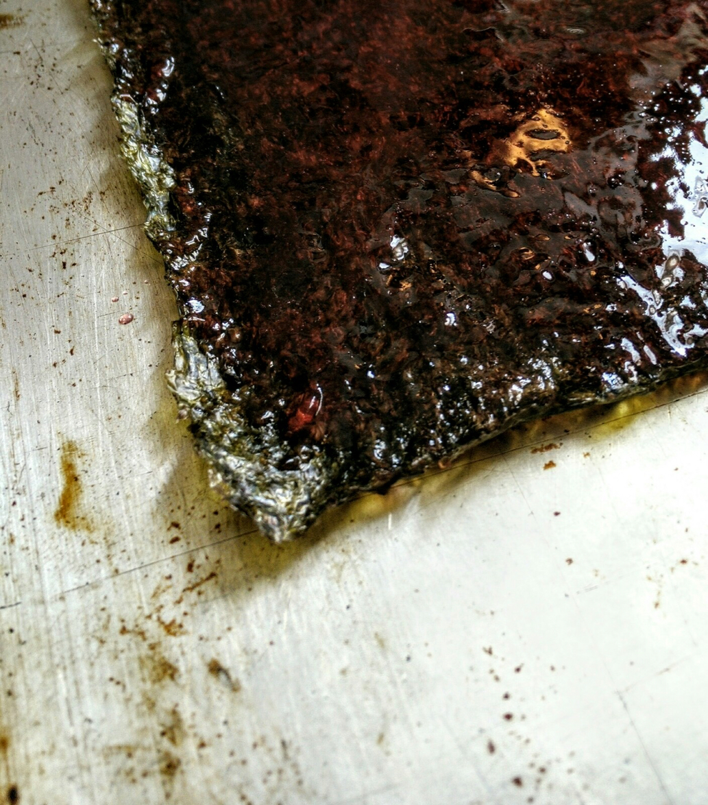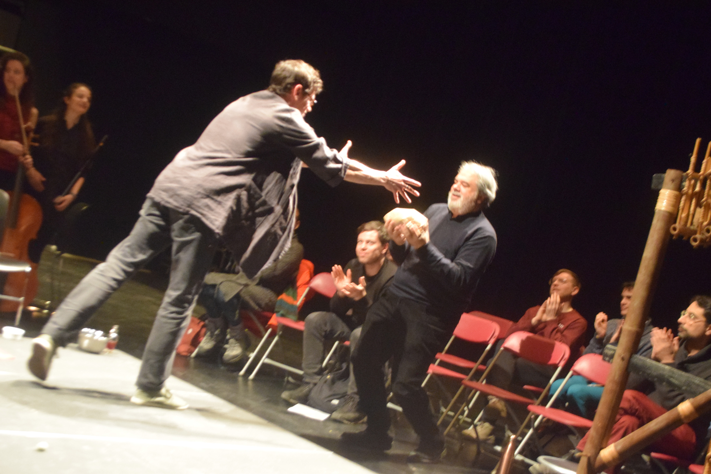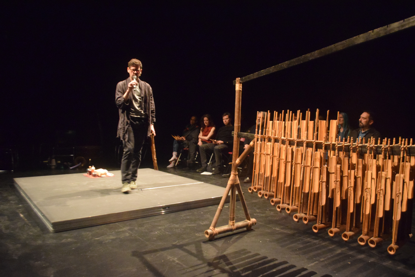 The third iteration of GIY merged with Ecstasies of Influence (E°I), a collaboration with composer-conductor-scholar Sandeep Bhagwati and the Ensemble Ekstasis in Montreal, QC. E°I explored the ‘translation’ of different types of artistic practice into musical composition and performance. Over the course of four months, eight musicians and I ‘rehearsed’ in a series of exploratory sessions, each riffing on the key themes of ecology and improvisation. Food offerings served to prompt the group in various directions. Initially, these were based on Gigi’s starter, including freshly baked bread, sweet-salty cookies, and kvass (a fermented beverage made with old bread). Later, we moved on to ‘skins’ made from agar agar, caramels dusted with a range of spicy, pungent, and acrid powders, and fatty pastes and sharp liquids made from edible stuff that wasn’t quite eatable. The tastes and smells and textures that filled the black-box rehearsal space translated into sounds and movement and affect. But they also brought increasing awareness to the materiality of the musicians’ own instruments—the exotic woods and rare metals of a cello, the cold and sharp elements of found percussion devices, the saliva and sweat of a vocalist’s body. At the final ‘un-concert’, we came back to this sensoriality, as each performer spoke of their instrument and its ecologies, both material and social. We then assembled a giant angklung, an Indonesian percussion instrument made of tuned bamboo pieces. We were silent, we were raucous; we played in light, we sat in dark. From a small, raised platform, I distributed new food offerings to each musician, to be incorporated—or not—into their continuing performance. These offerings took form as my material interpretations of our relationality, sometimes riffing on rehearsal foods, sometimes drawing inspiration from a different moment during the previous four months. A final gesture—tossing a paper-wrapped loaf of Gigi-bread toward Sandeep—closed the piece. Afterward, the loaf was shared with the audience, each person tearing off a piece, inhaling its aromas, and then chewing and swallowing thoughtfully.