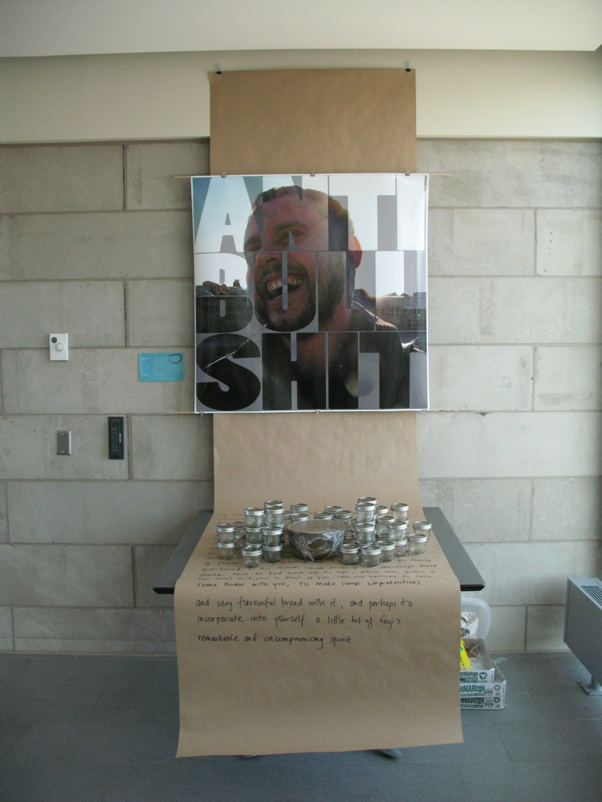 The first iteration of GIY took the form of an installation and performance within the Exploration Gallery of the 2014 conference of the Canadian Association for Food Studies at Brock University in St. Catharines, ON. It focused on the gastronomic integrity and energy of Gigi Frassanito, a friend and colleague who had died of stomach cancer the previous year. His twenty-year-old sourdough yeast culture (distributed to friends and family at his memorial service), served as the starting point for this work. Over the course of three days, I propagated a small sample of the culture into a large, lively, aromatic mass. During this time, I tended to the flour, yeast, and water a few times a day, checking the humidity, ensuring the microbial community had enough to eat, and documenting my movements in time-lapse imagery. I felt, at times, as if I were tending Gigi’s gravesite, trimming grass and flicking away pebbles, but also caring for new life, a midwife to Gigi’s offspring. By the third day, the gallery space smelled both sour and sweet—that unique aroma of fermenting complex sugars that stimulates salivary glands and reminds bread makers of the life-death cycles inherent to collaborations with yeast. The embryonic lump of starter that I had brought with me was now many dozens of times larger, bubbling and burping like a giddy newborn. I divided the mass into seventy small mason jars and then left them available for collection by the conference participants. In so doing, my intent was to have the ‘audience’ of this work incorporate both the starter (in the eventual form of bread) and the humanism of my late friend (through absorption of my story about him). Gigi’s own bodily yeast cells, having in life been in continual exchange with those in the sourdough culture, thus became agents of his continued existence.