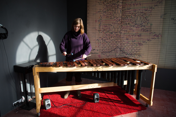 Score: Mechanical Asynchronicity developed out of the artistic research project Bummock: The Lace Archive in which Maier was working with historical lace drafts found within The Lace Archvice held at Nottingham Trent University. Maier experimented with transposing the technical drawing into a music score and began discussions with composer Dr. Martin Scheuregger in developing the sound(s) these drawings create. Similar to the process of machine-made lace of transferring the drawing into machine's punch cards, Maier translated the lines found in the technical drawing into a single line of a music box punch card. Her piece titled Score was played daily on either a 30 note or 20 note music box at 3 pm. Scheuregger’s Mechanical Asynchronicity I explored the inherent musicality of the individual lines of a multi-part texture. A Bach chorale harmonisation – a four-part piece that epitomises contrapuntal composition – is heard with each part recorded individuality. The texture becomes about the individuality of each line, as the intended harmony of the original is blurred. This asynchronicity robs the original of its purpose, whilst showing the inherent beauty of its constituent parts. Scheuregger’s piece was also accompanied by a marimba during live events throughout the exhibition.