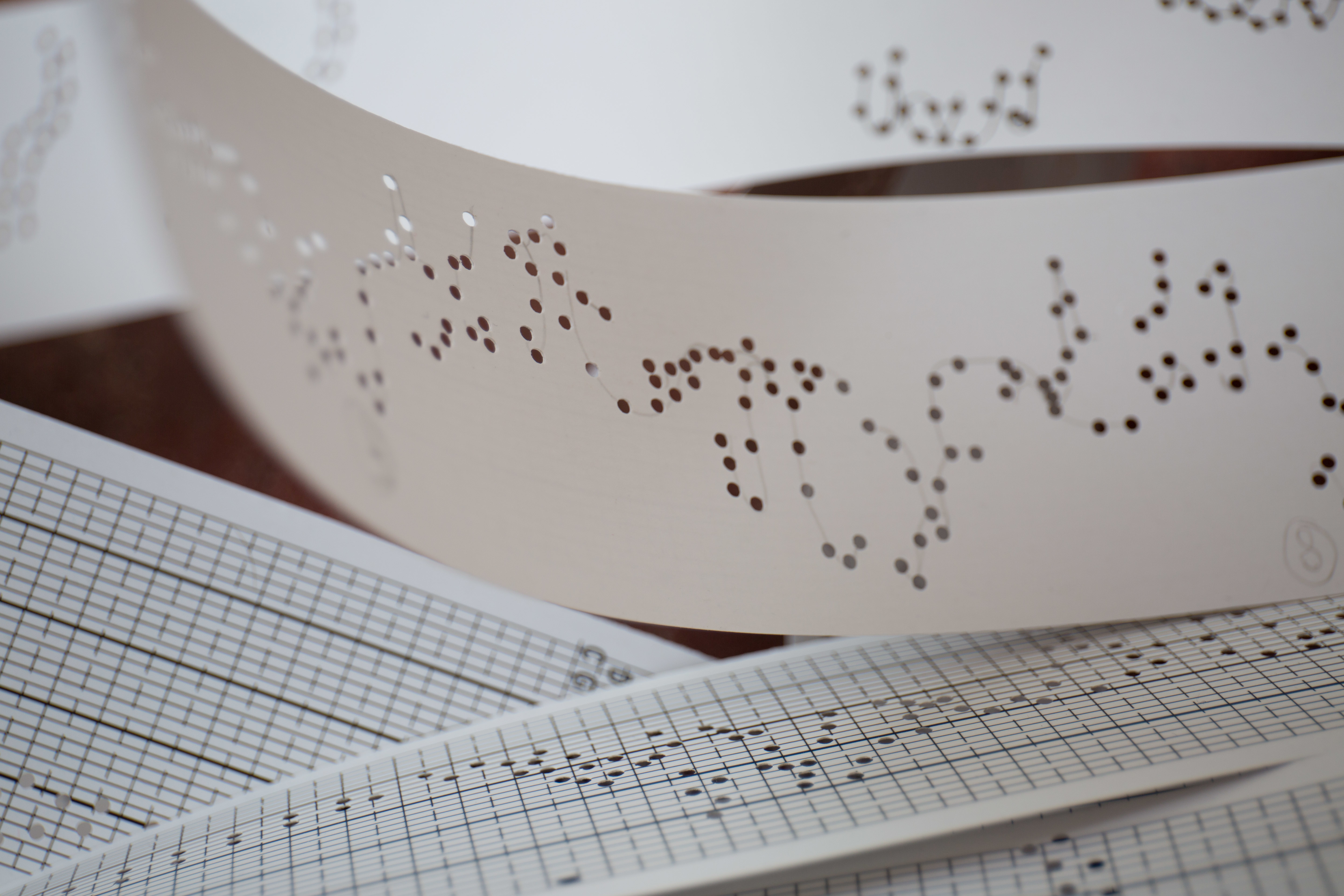 Overall, the work explores the manner in which an iterative re-encoding process has been employed to develop the work while embracing imperfection and glitch as an intrinsic part of its aesthetic. Key ideas of transcribing, encoding and re-encoding are explored through the work which has seen the original data of the lace patterns first transcribed ‘naively’ into lines, then inscribed as punch-cards to be used with programmable music boxes. These initial musical results have furthermore been transcribed into traditional music notation before additional graphic renditions are created as both drawing and score.