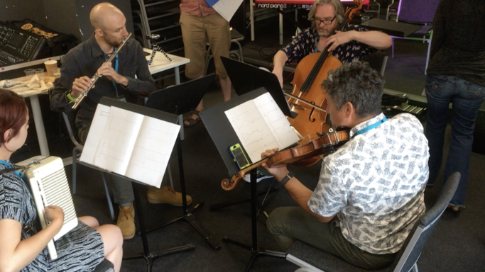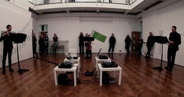 The performers play a part in continuing the collaborative process as they develop approaches to the scores – which include graphic and choice-based elements – presented to them in a public rehearsal process. By working together, the musicians are able to create a coherent approach to the work, forming interpretative strategies that create effective musical results yet are ‘imperfectly’ matched to the mechanical recordings.