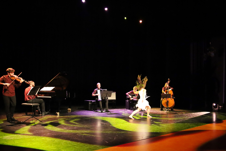 It was mainly the quintet that decided the order of the pieces to make a proper dramatic arch, and we always kept in contact with the rest of the group. The performance would start and end with the ensemble playing Piazzola, which is what we specialise in. It is a highly dramatic and energetic repertoire that can be taken advantage of by the dancer. The structure, which very much resembled the one of a conventional concert, aimed for an organic combination of fast and slow pieces, as well as tutti and solo pieces. The three solo pieces, scattered through the performance, had a key role in the dramatical arch, both in decreasing or increasing the tension.