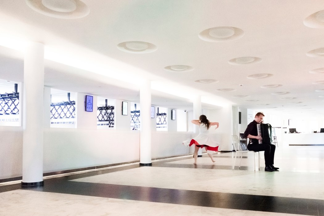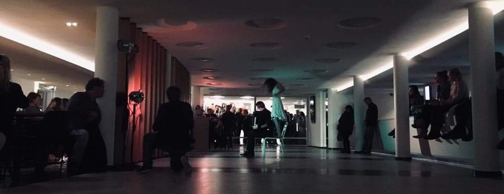 The space was non-conventional and had very impressive features that could be taken advantage of. In the pictures, it is possible to see how the stairs and balconies give many different places to perform. We wanted to use these qualities to enrich the existing performance. Generally, the performance did not suffer limitations by the space itself, at least in the visual sense: some performers would be able to move rather freely (except for the crowd that went out of the main hall and sometimes obstructed Rosanna’s movements), which would give us the possibility of using one balcony for the violin solo, and another for the accordion solo. However, during the performance we encountered one problem that was not planned and had to do with one quality of the space. As opposed to CTF, the acoustics in the entrance of Muziekgebouw were very wet. If the quintet was not playing together, the sound would disappear in the chatter of the public, especially during the double-bass solo. This mistake could have been solved the same way it was solved in CTF - with a sound technician - but, in this case, this was not prevented and the budget was rather restricted. This experience showed the importance of being aware of every aspect that shapes a performance and how it can - in this case - negatively affect the final result if left unattended.