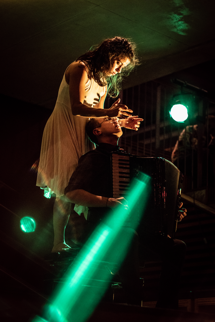 Teus’ work contributed, as happened with Leandra, to already create a space within the venue. It became an essential part of the performance as a whole. This is why the music and dance parts did not need to change substantial parts in the festival, apart from the fact that we performed in conventional venues.