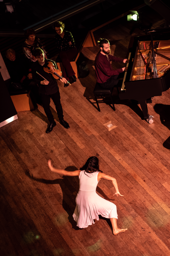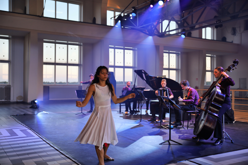The first rehearsal we had was a clear example of how not to start working on an interdisciplinary project. We got together and simply played through some of the pieces, while Goda danced around. At that moment, the interaction was poor: we did not perceive each other; the dance was a foreign element to us. However, through the sessions we had later with the director Laura Suárez, we were able to focus significantly on building a strong interaction. We achieved this through different group dynamics, which were exercises with precise guidelines to work on the cohesion of the group. Many of these exercises were based on the perception of oneself, the group and the space we were rehearsing (or later performing) in.