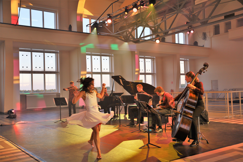 In the summer of 2019, ‘The Devil on the Dance Floor’ was performed in the NJO Muziekzomer Festival that takes place in different locations in the province of Gelderland. We were programmed at Gelderlandsfabriek in Culemborg, Theater De Leeuw in Arnhem, Radio Kootwijk in Apeldoorn, and Veluvine in Nunspeet. The ensemble incorporated Piotr Lipowicz on the electric guitar and dancer Rosanna Ter Steege as new members, and the light designer Teus van der Stelt as a highly important collaborator.