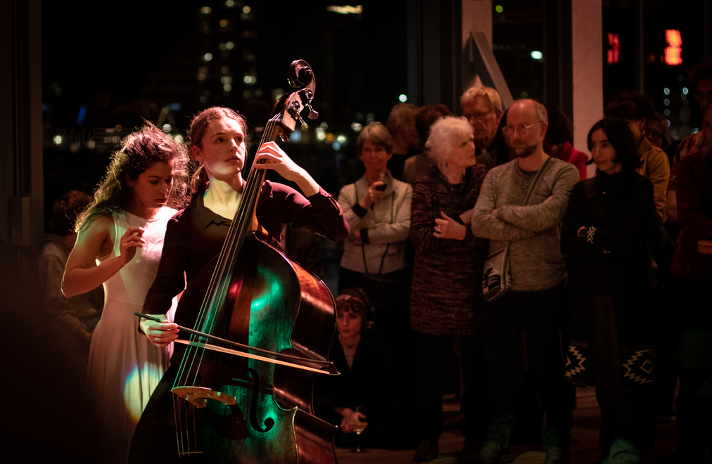 Ella’s double bass solo, ‘Motivy’ by E. Tabakov, is interesting to point out for the following reason: the dancer took Ella’s characteristic playing and transformed it into a vertical quality in her movements, which were inspired by the form and manner of playing the double bass. The angelic element was present as well represented in her gestures. Her movements suggested a protective attitude in many instances, achieved by surrounding Ella with her arms or gently touching the instrument.